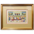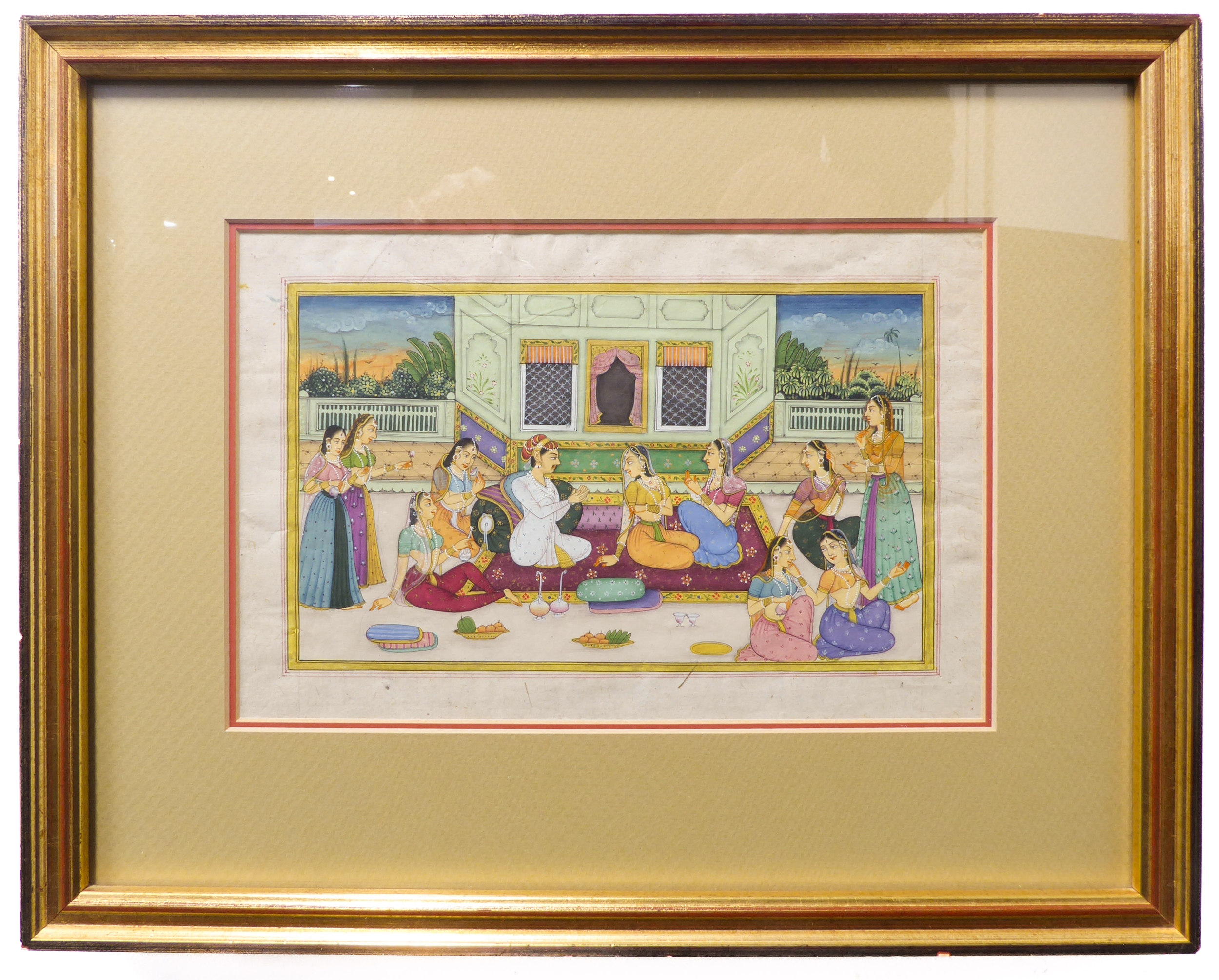 A late 19th / early 20th century Indian School gouache on paper study of a married couple seated on a gaddi and with females bearing various gifts, glazed gilt frame (13.5 cm x 22.5 cm)