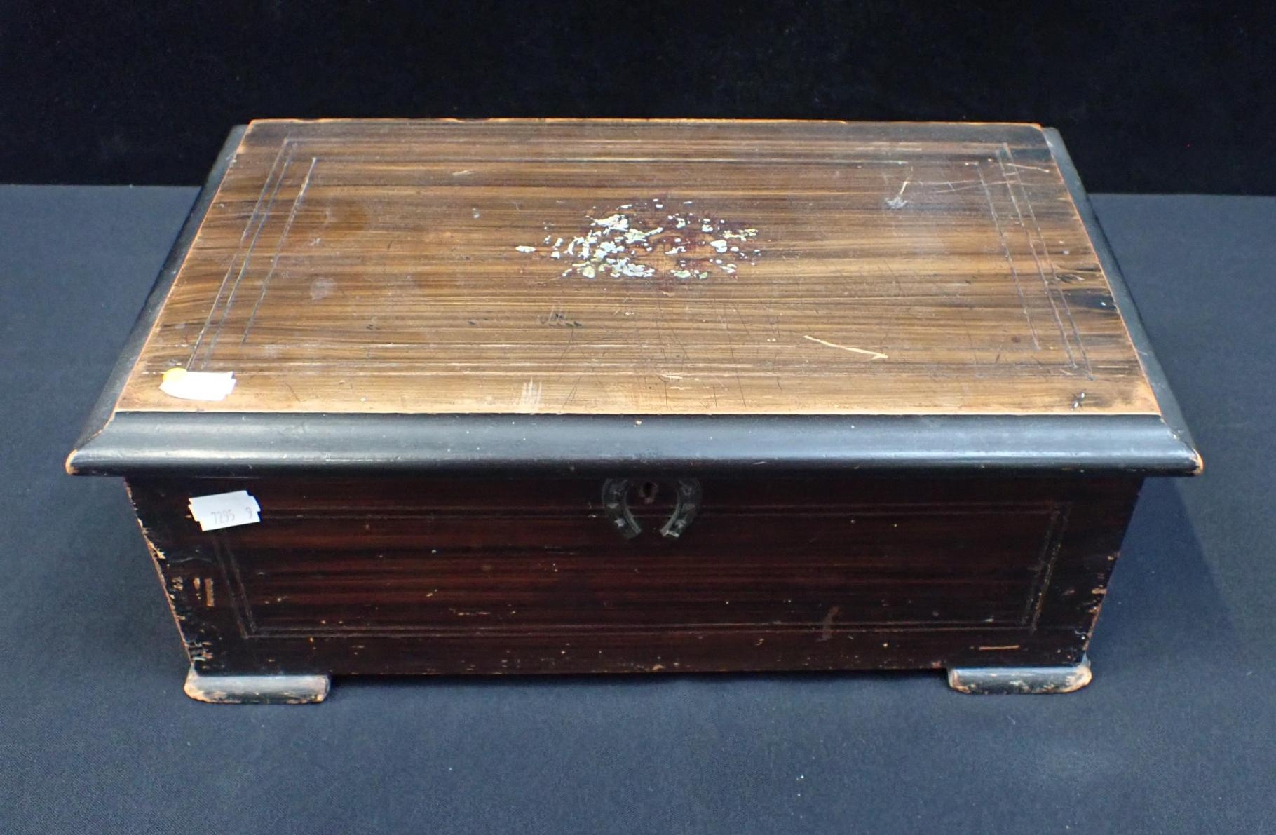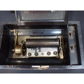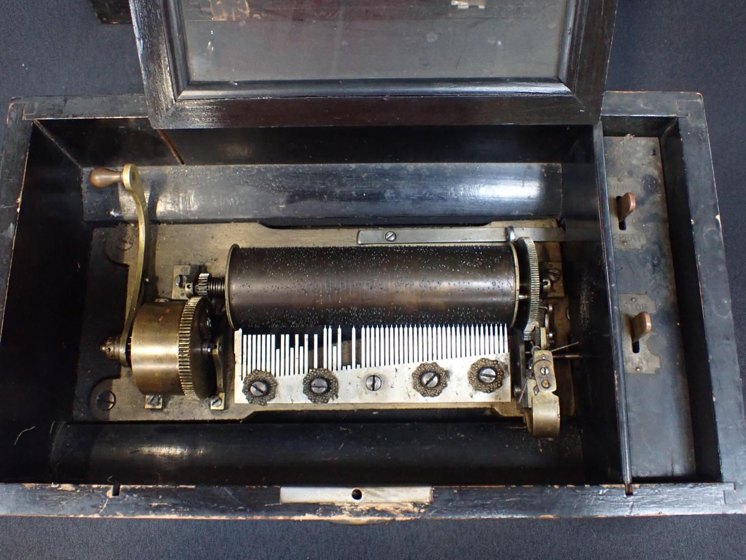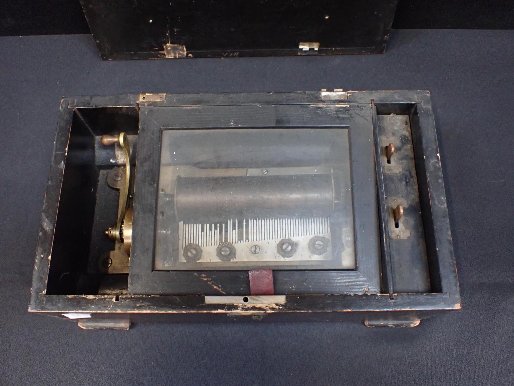 A 19TH CENTURY CYLINDER MUSIC BOX with 15.5cm cylinder contained in grained case 15cm high, 38.5cm wide (in poor condition; spring appears intact but regulator faulty and cylinder has 'run' causing loss of teeth; other faults)