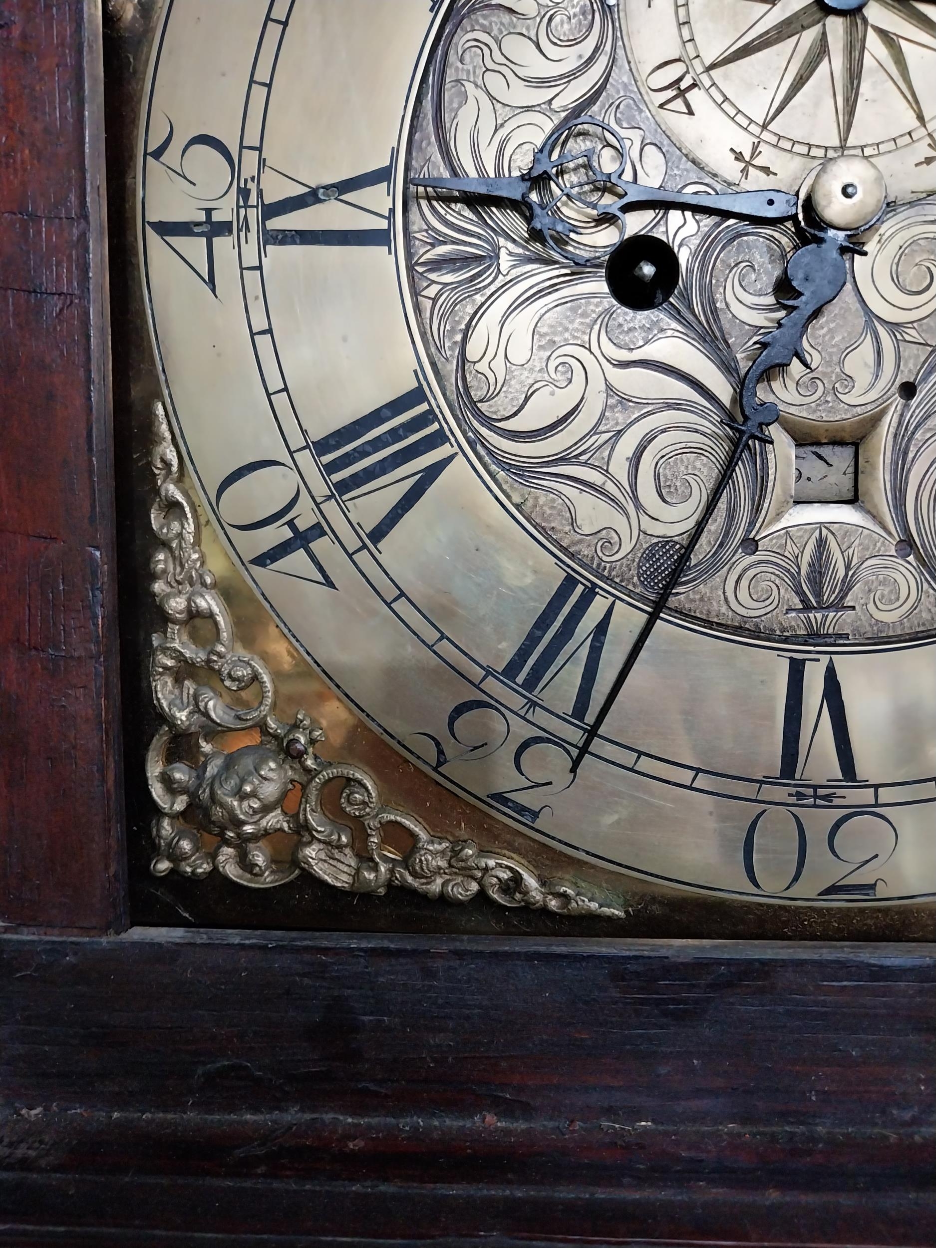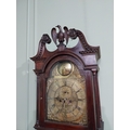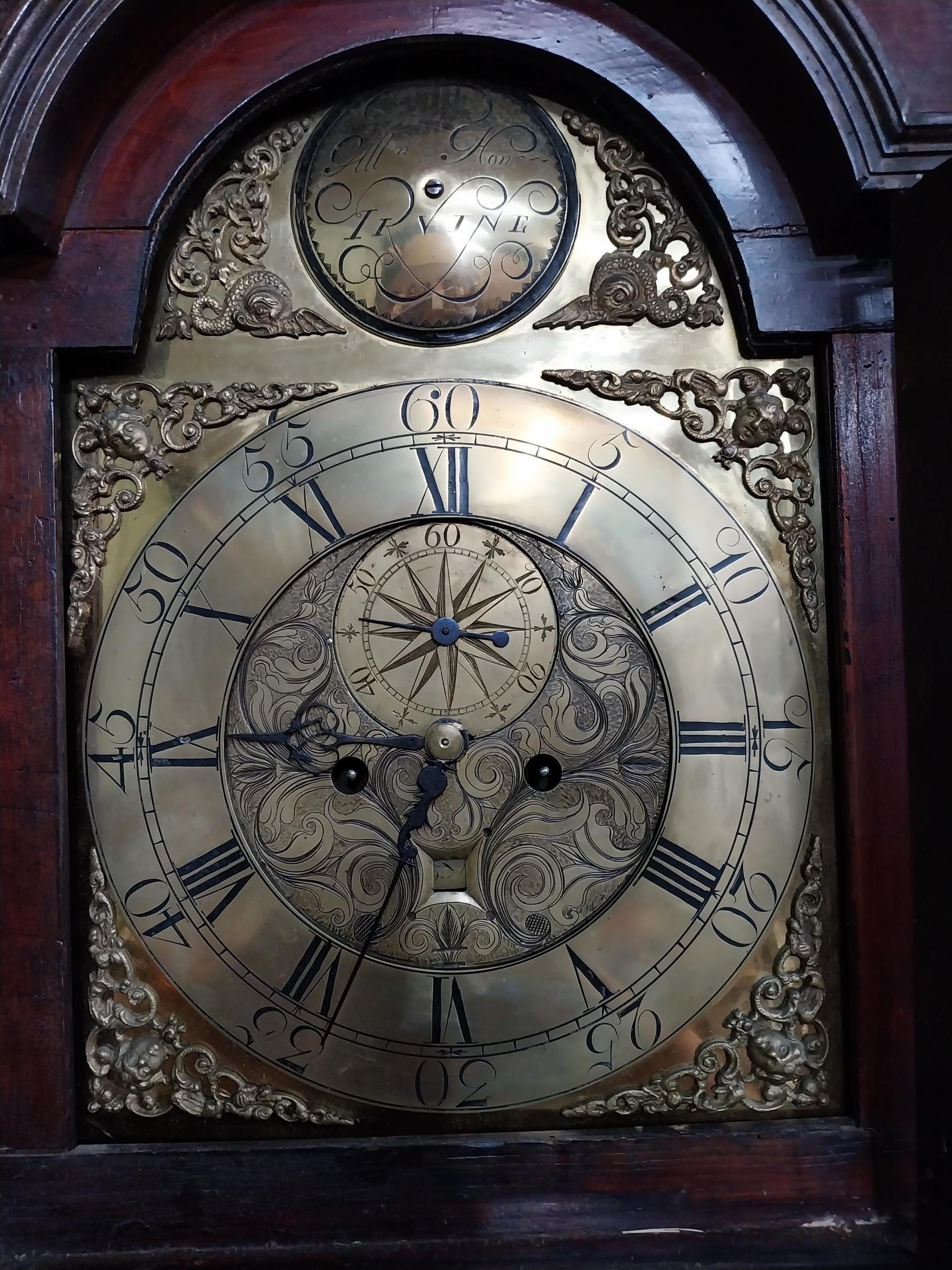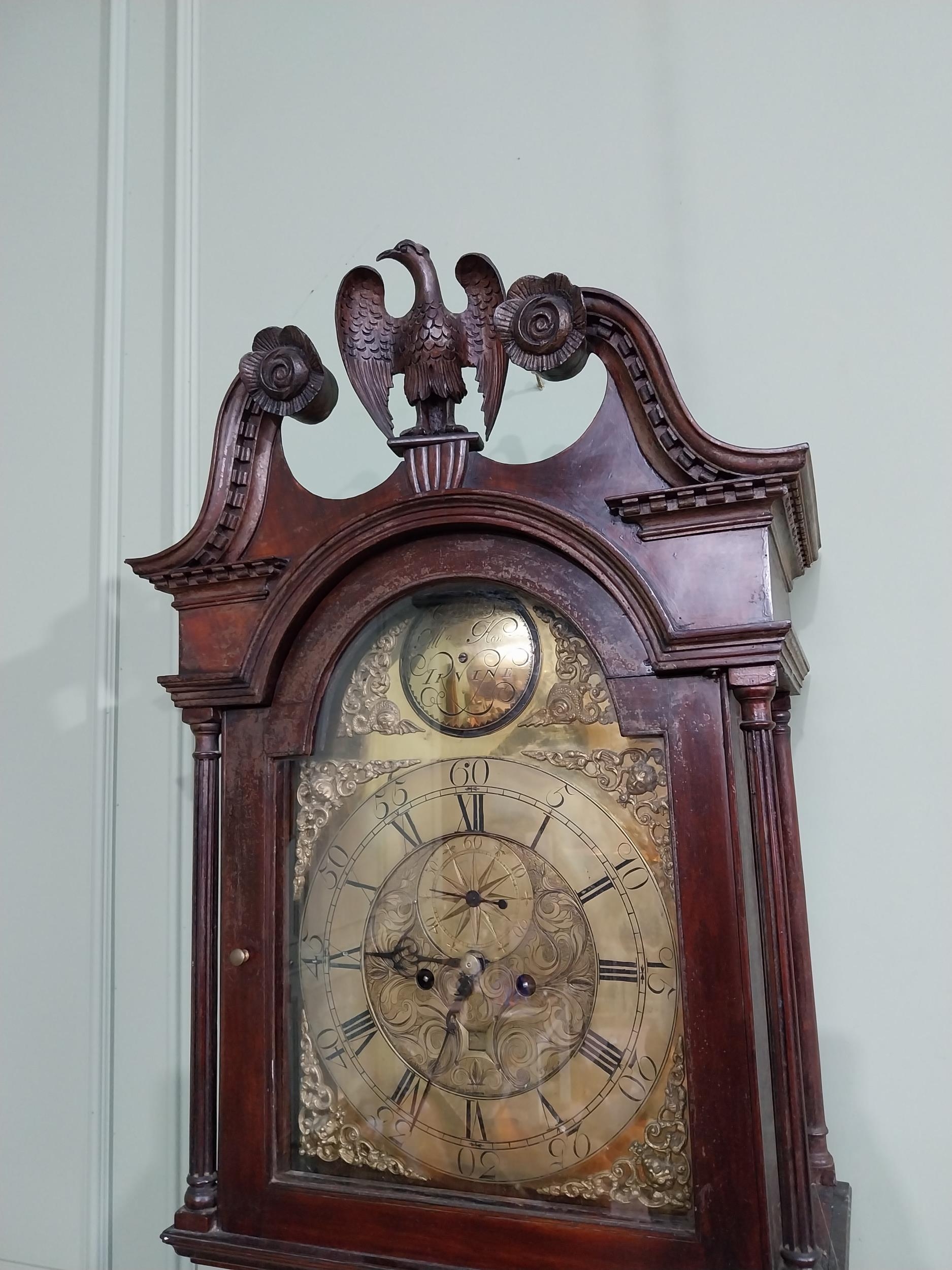 Georgian mahogany swan neck Grandfather clock with engraved brass dial by Irvine {230 cm H x 50 cm W x 26 cm D}.