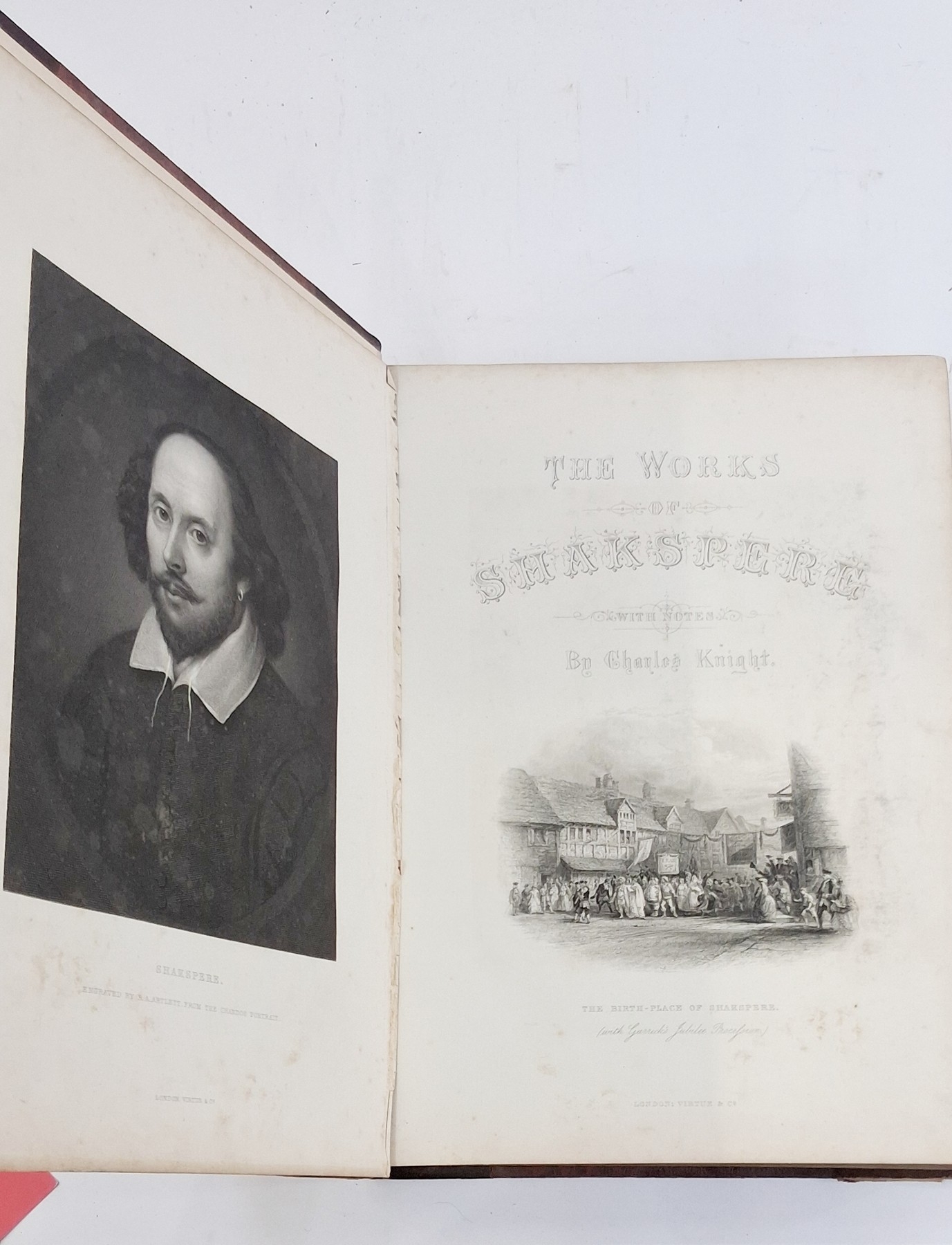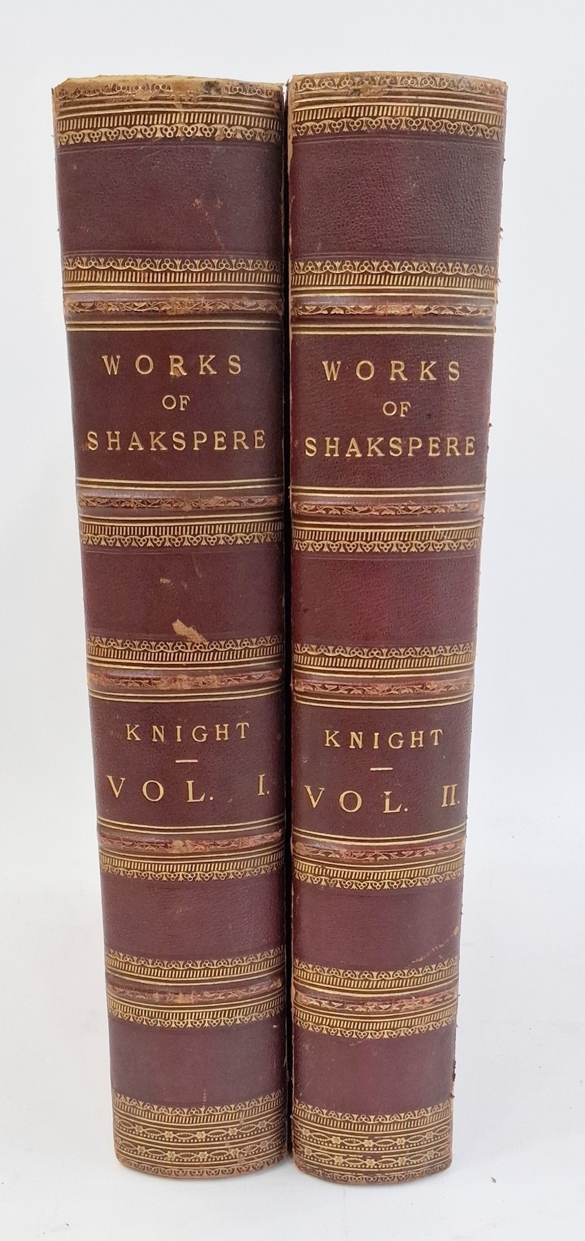 Knight, Charles "The Works of Shakespeare" Imperial edition, illustrations on steel, illustrators to include Cope, Frith, Maclise, etc, Virtue & Co, plates with tissue guards, offsetting, vol 1 frontis portrait of William Shakespeare which is loose, vignette on half-title, frontis with tissue guard to vol 2, vignette of the Globe Theatre on half-title, plates throughout with tissue guards, both vols red leather over red boards, gilt rules, gilt titles and raised bands to the backstrip, both vols rather rubbed, corners bumped, a.e.g. (2)
