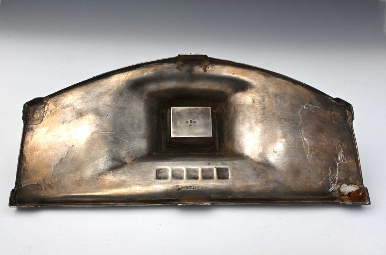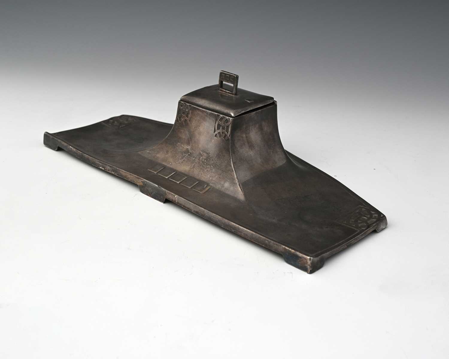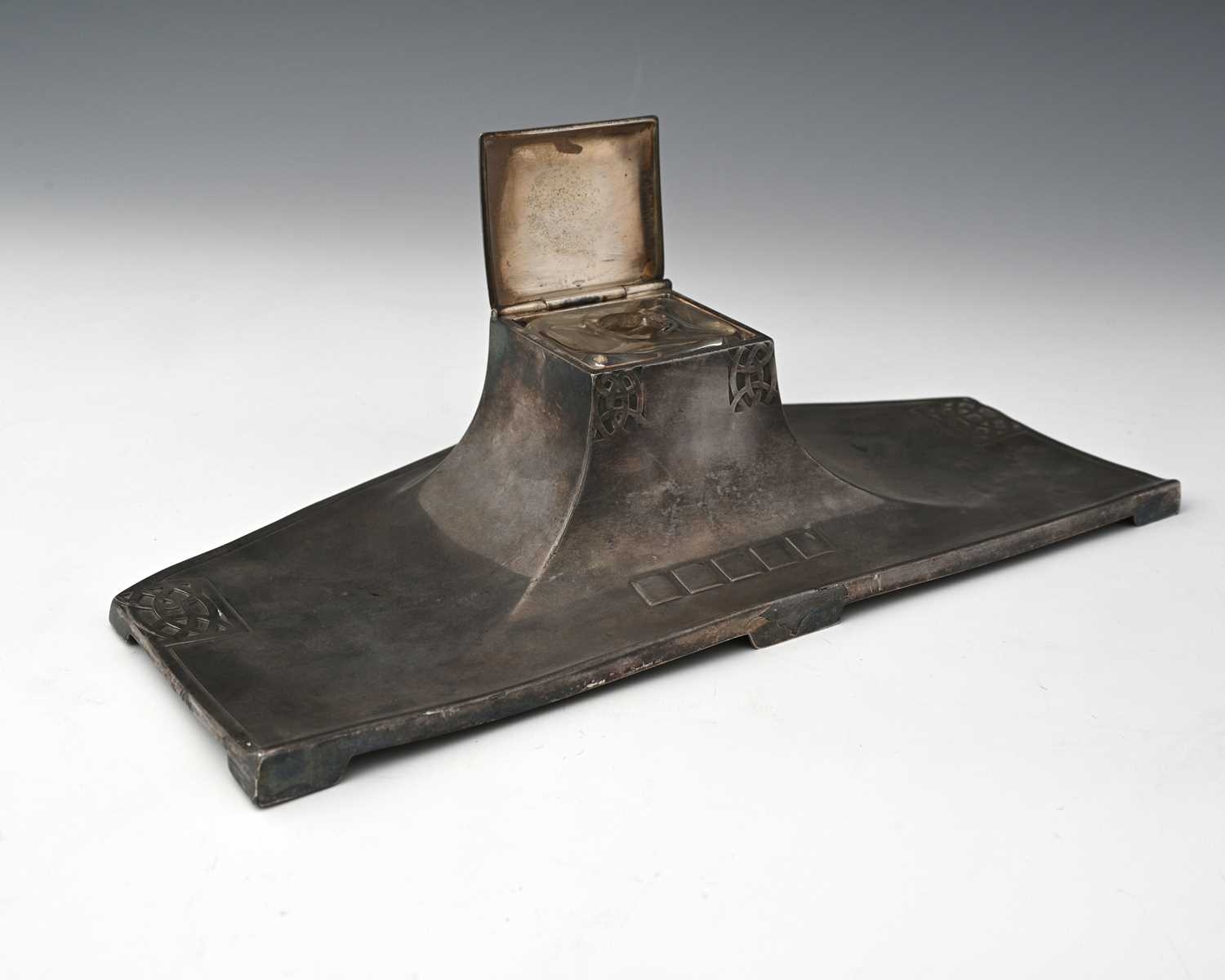 WMF, a Jugendstil silver plated desk stand, model 120, pediment arched form with splayed inwell and pen tray, relief moulded with knotted tendril motifs, 33cm wide