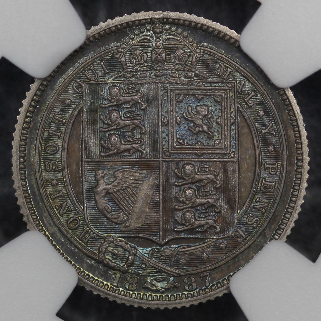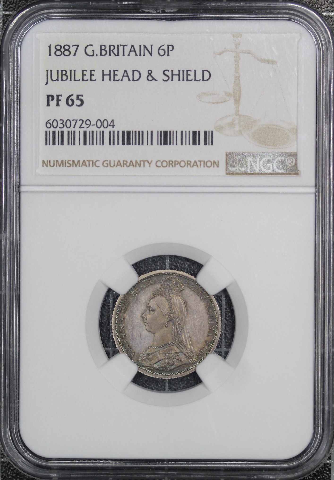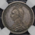 1887 Proof Sixpence, Victoria (ESC 1753, Bull 3268, S.3928). Graded NGC PF65, nFDC with superb iridescent blue fields to the reverse and through the obverse legends. A striking example with lovely eye appeal.