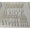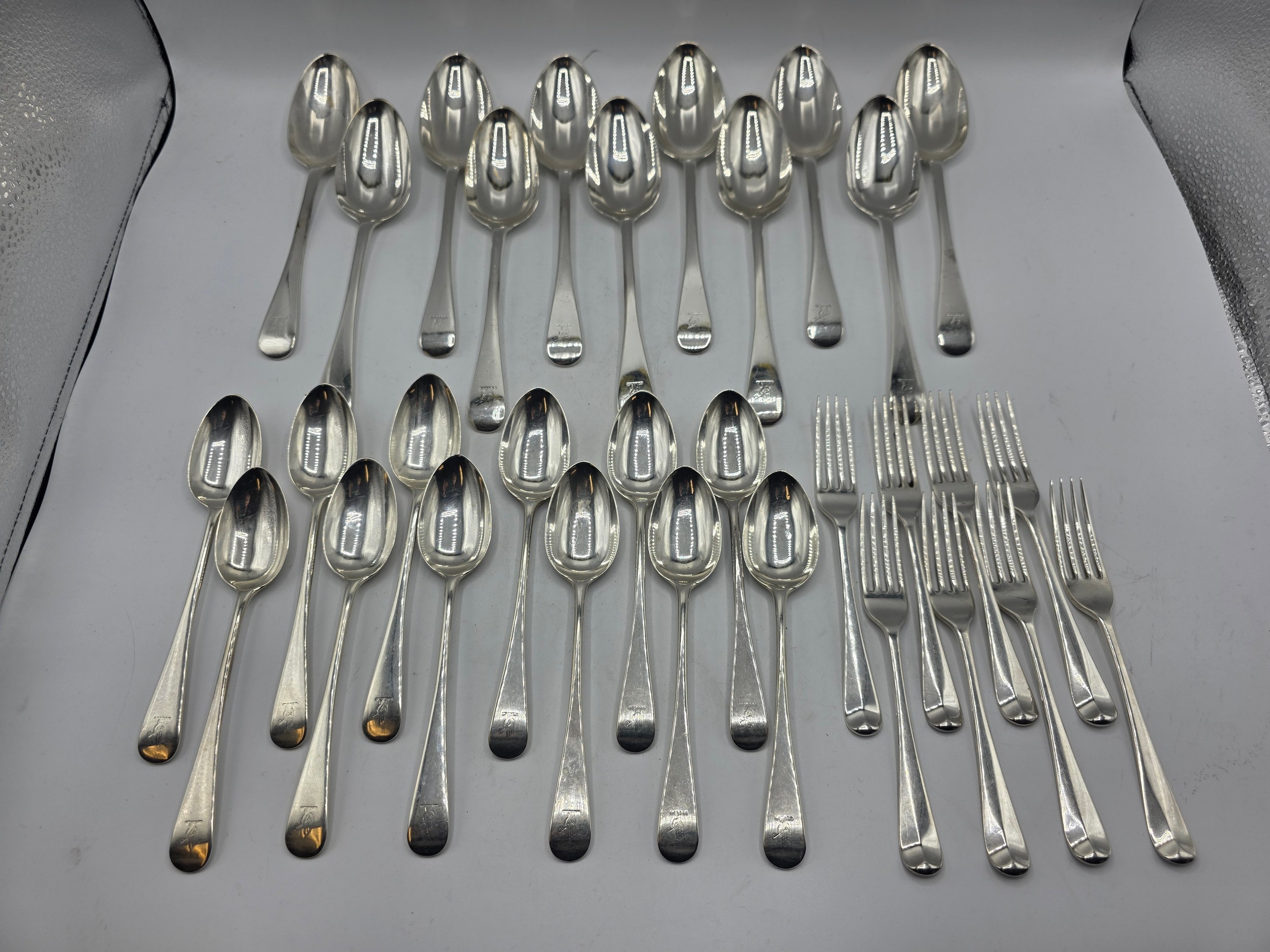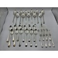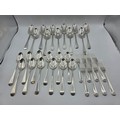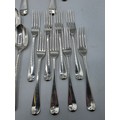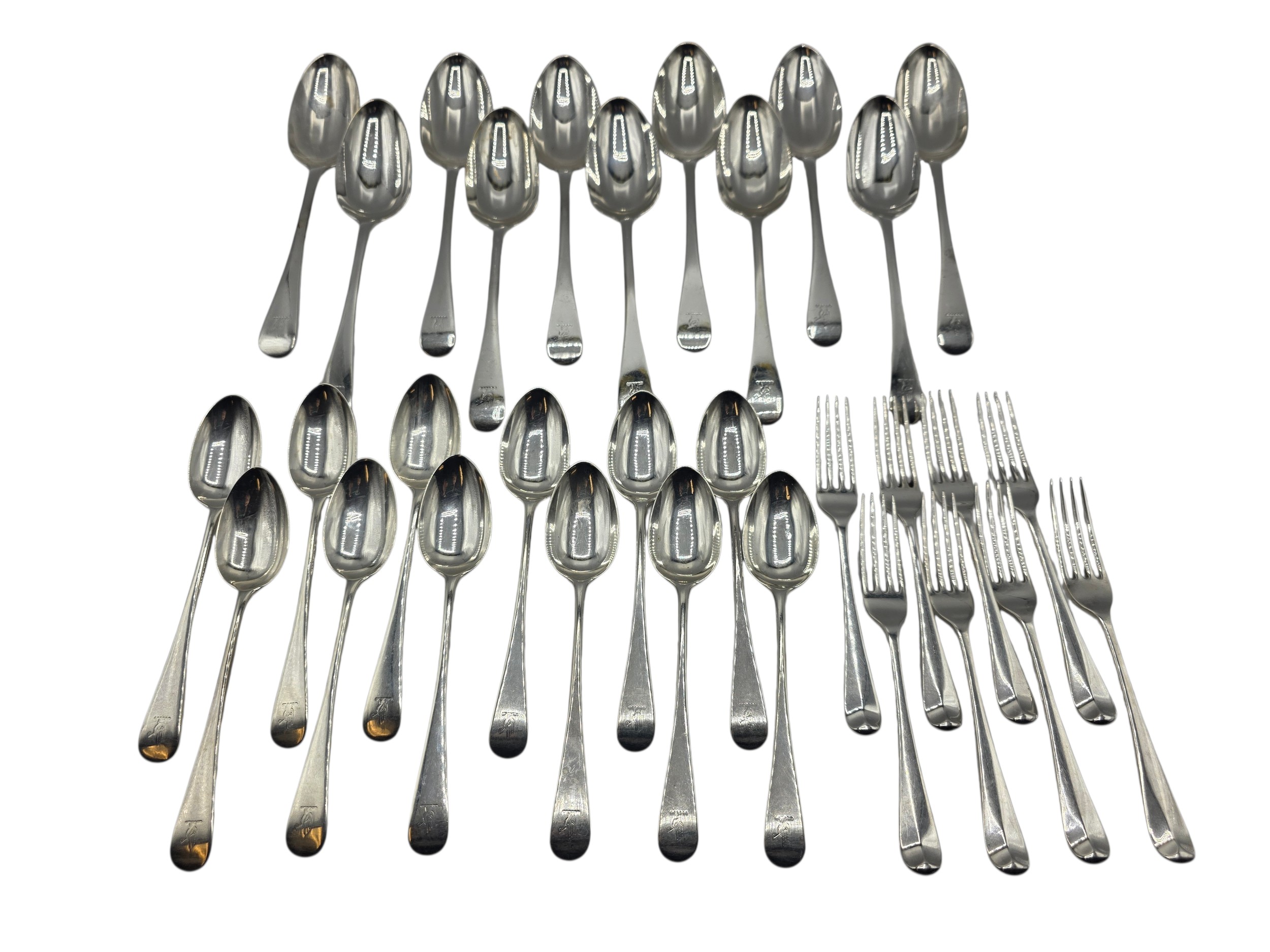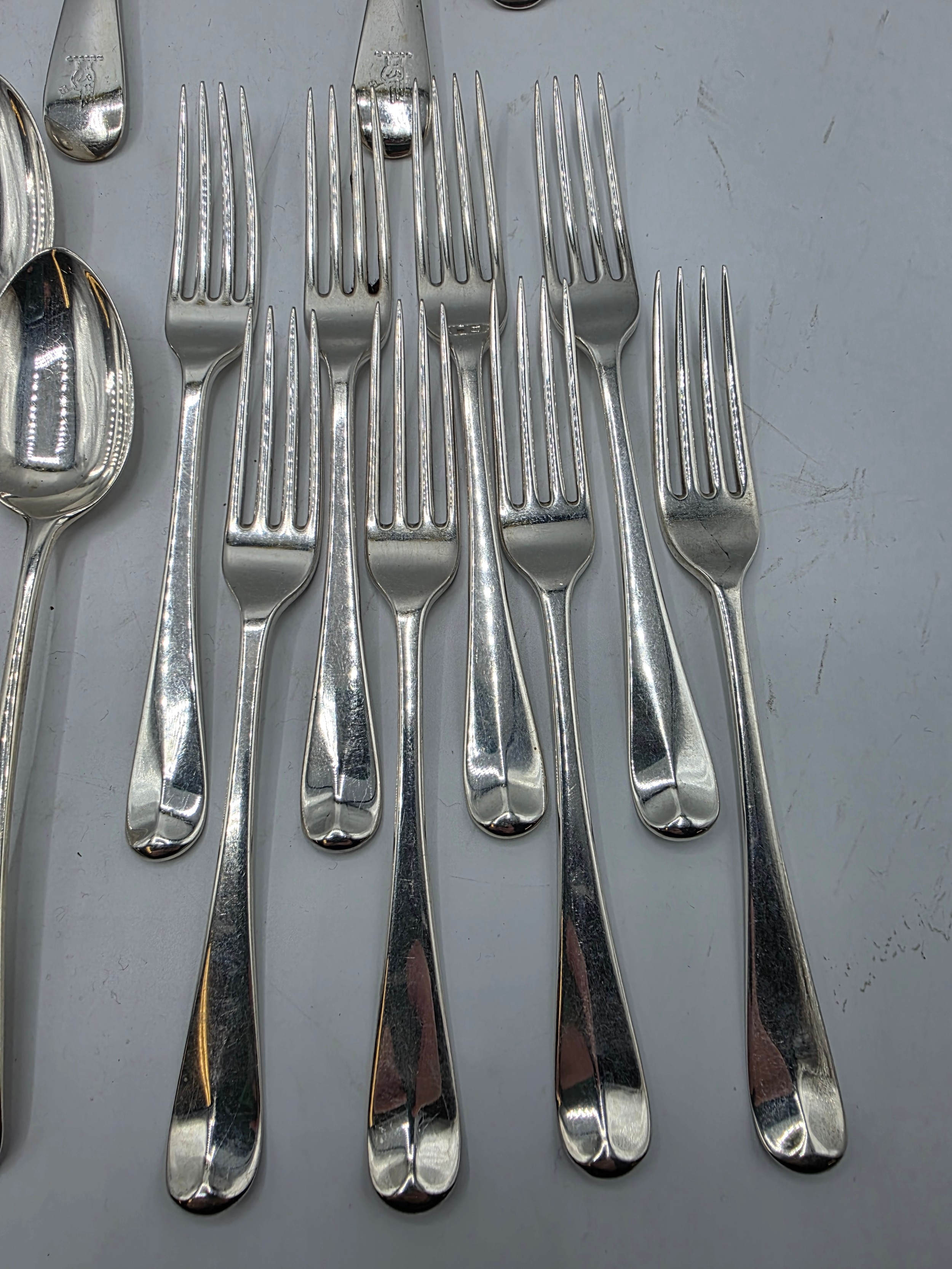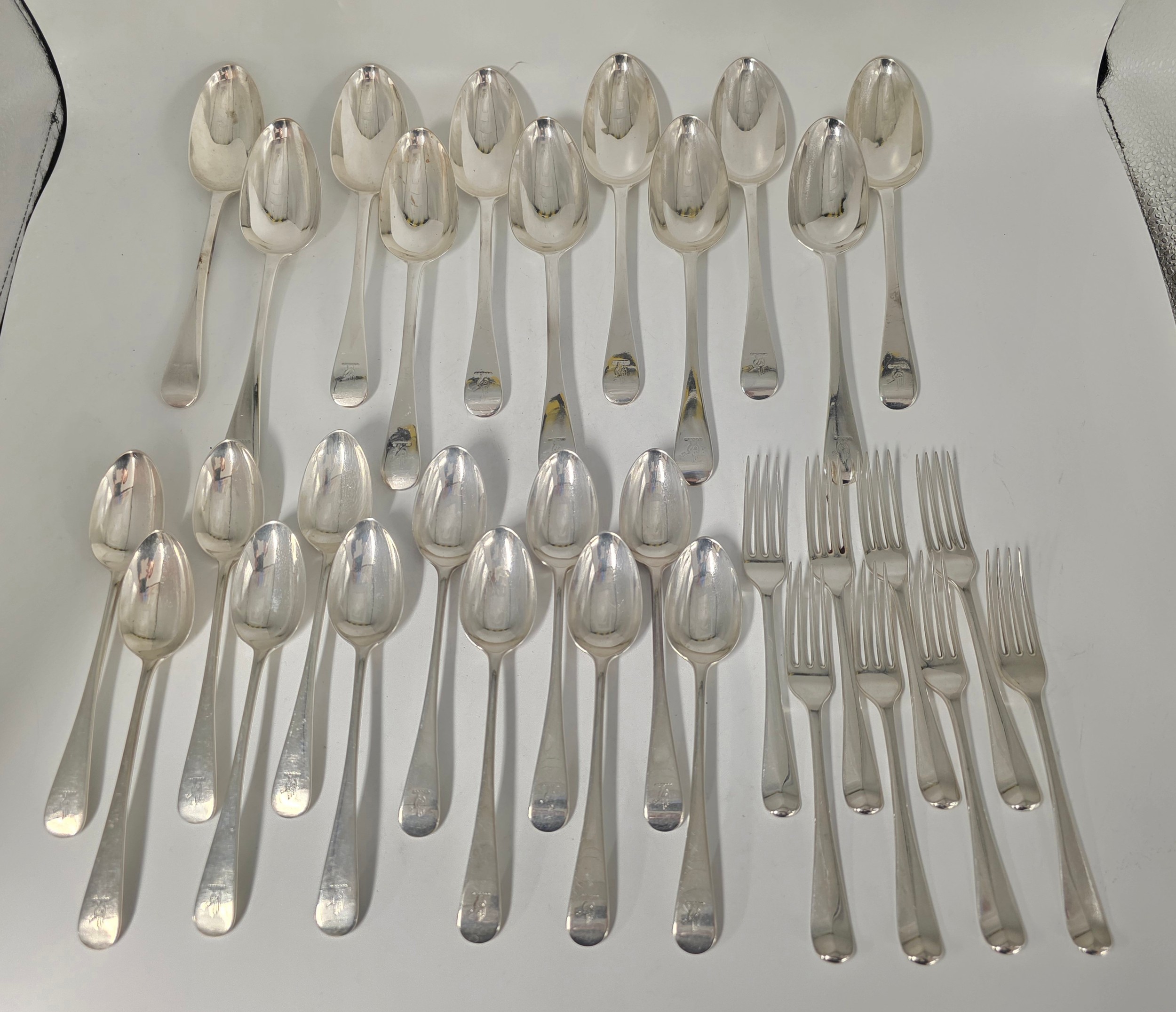 A collection of sterling silver flatware, to include 8 desert forks, 12 desert spoons, 11 serving spoons. Francis Higgins London Various dates. 1116 g