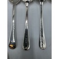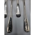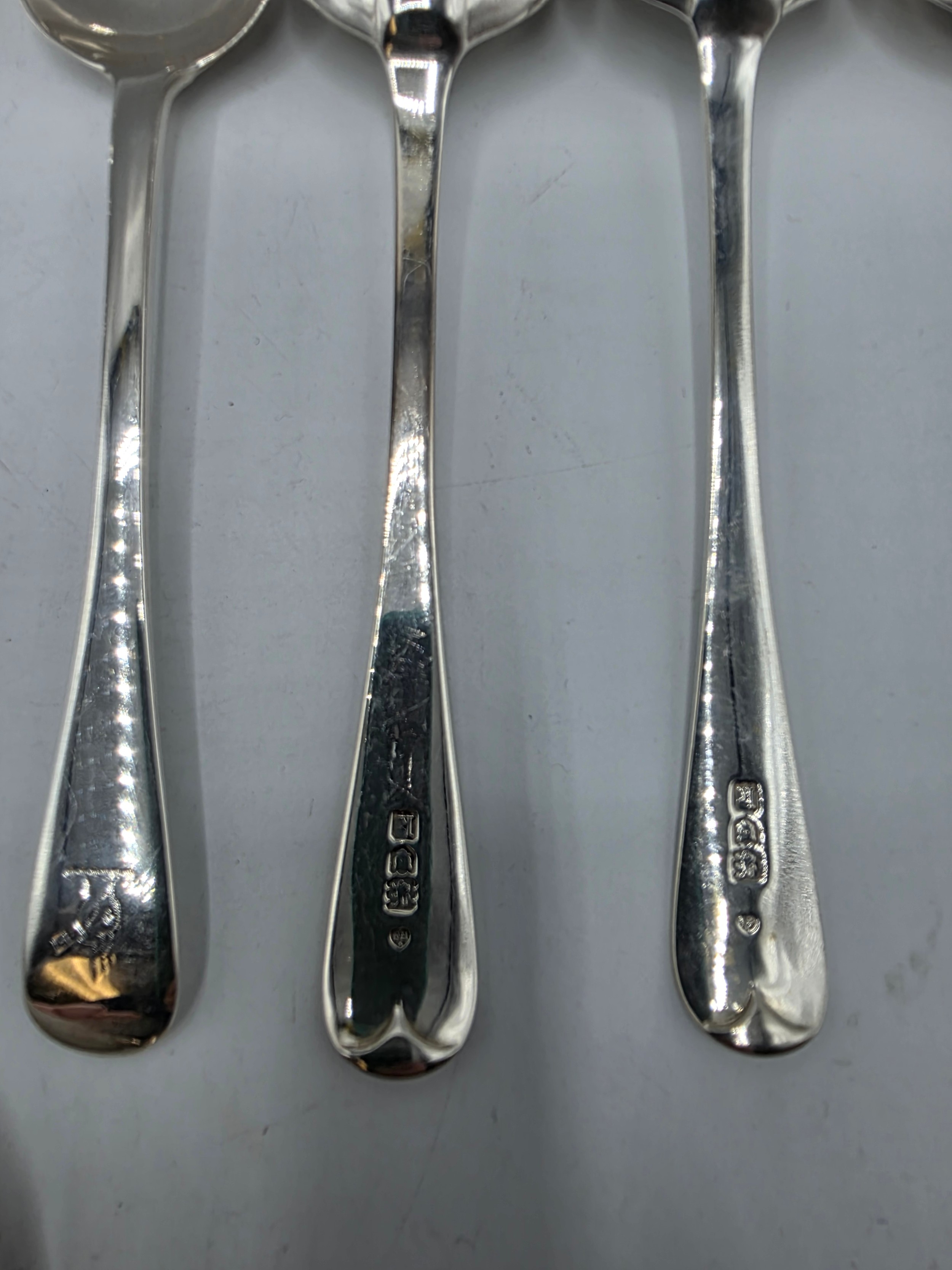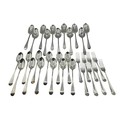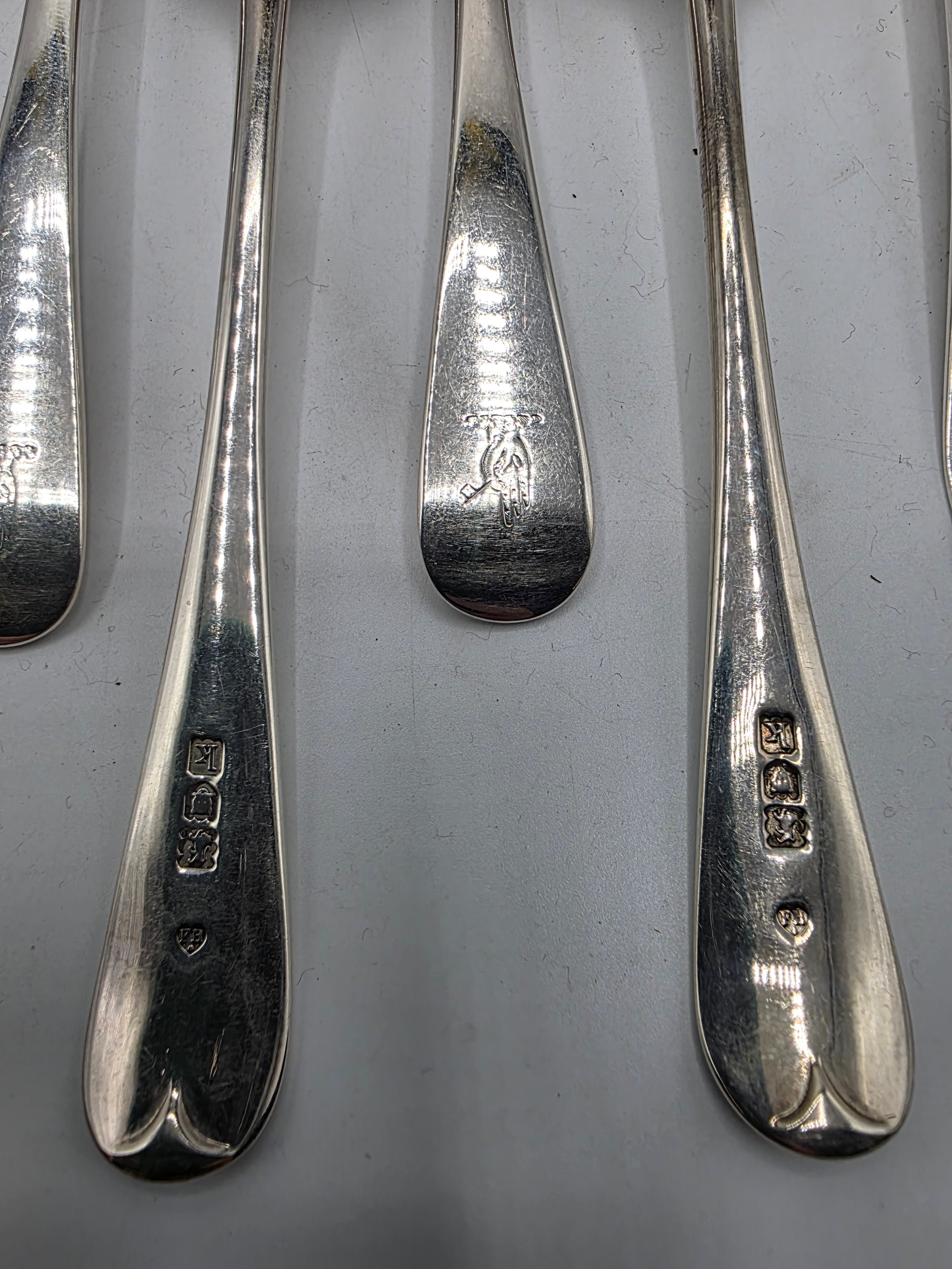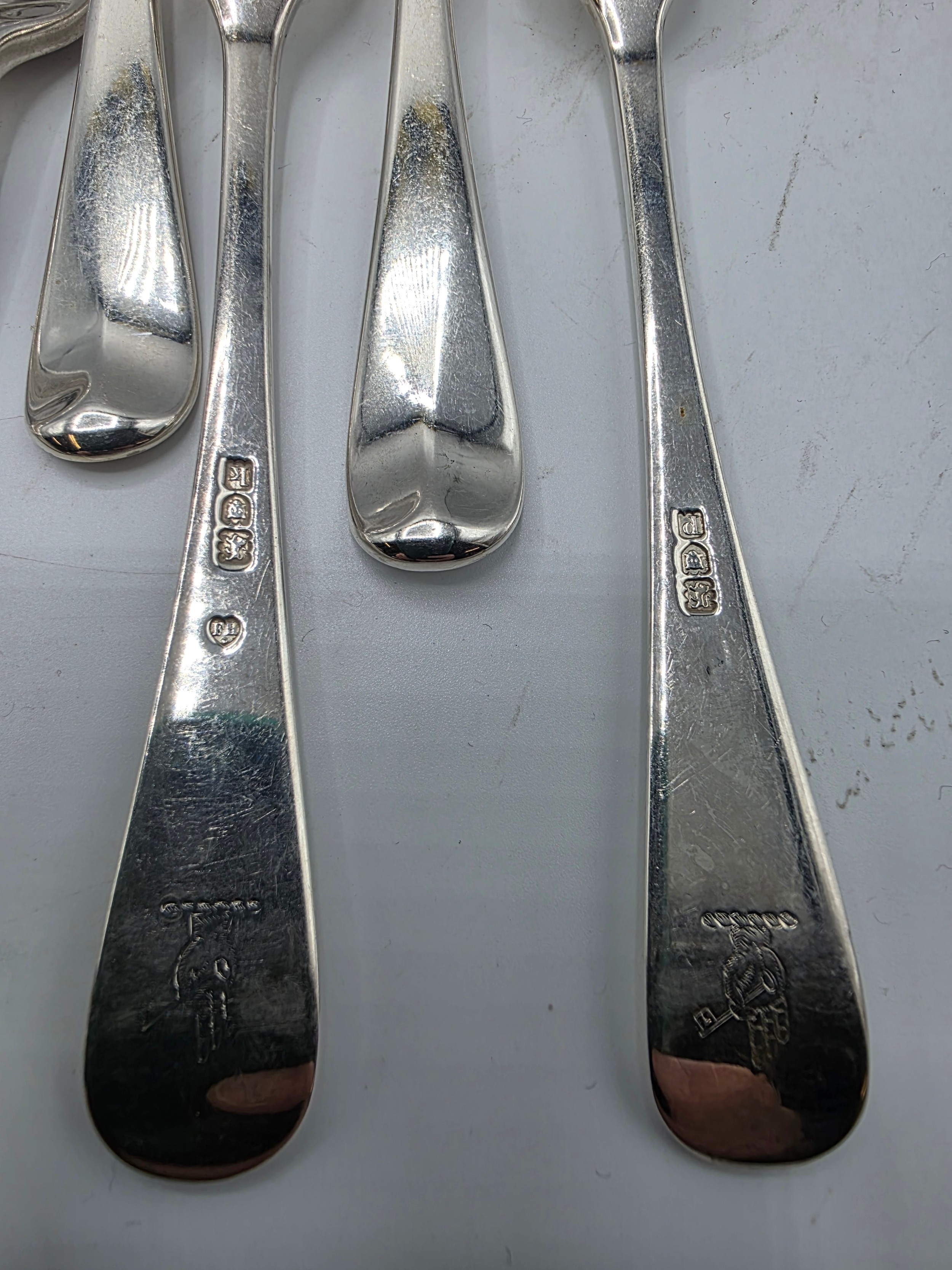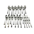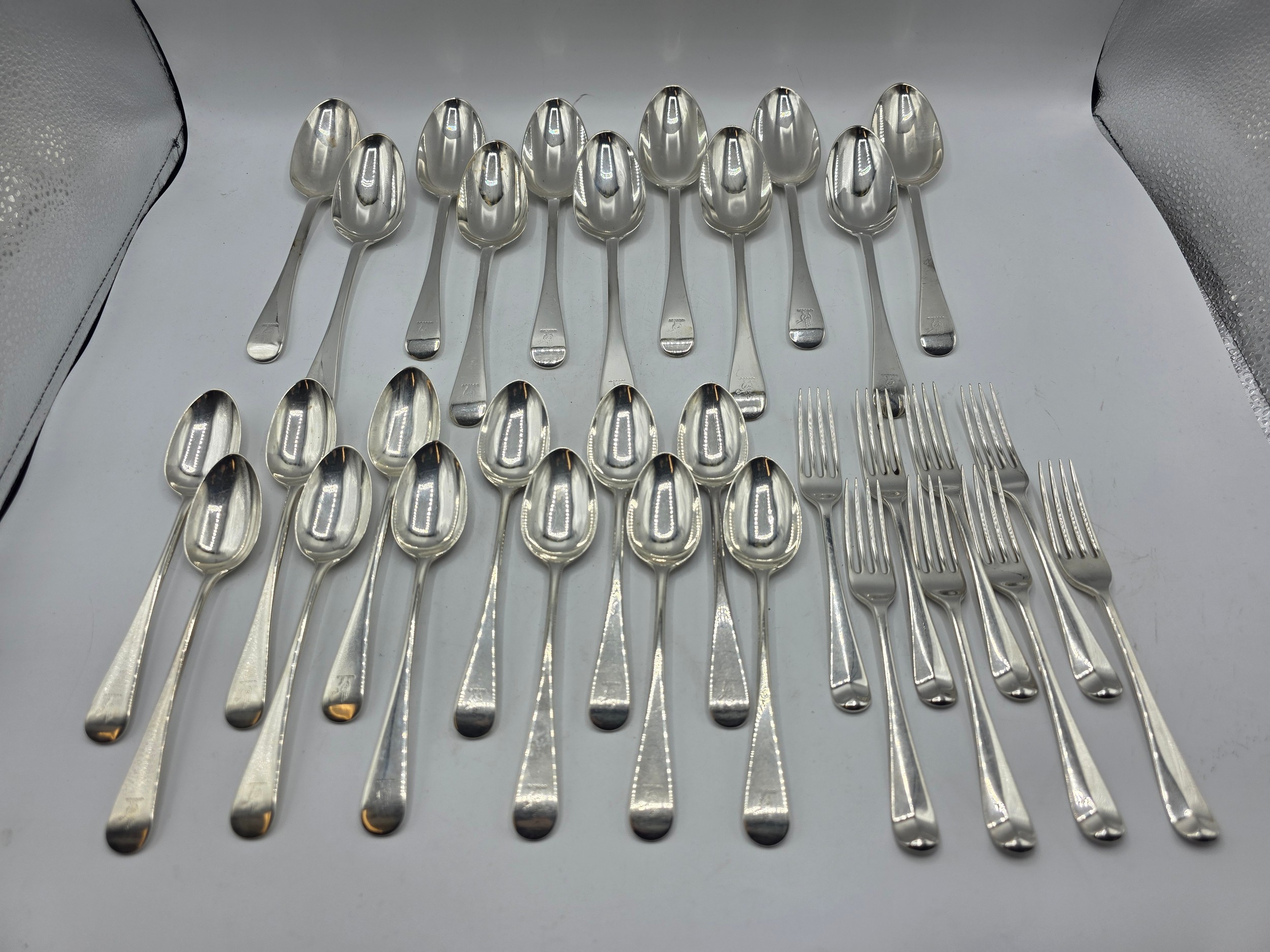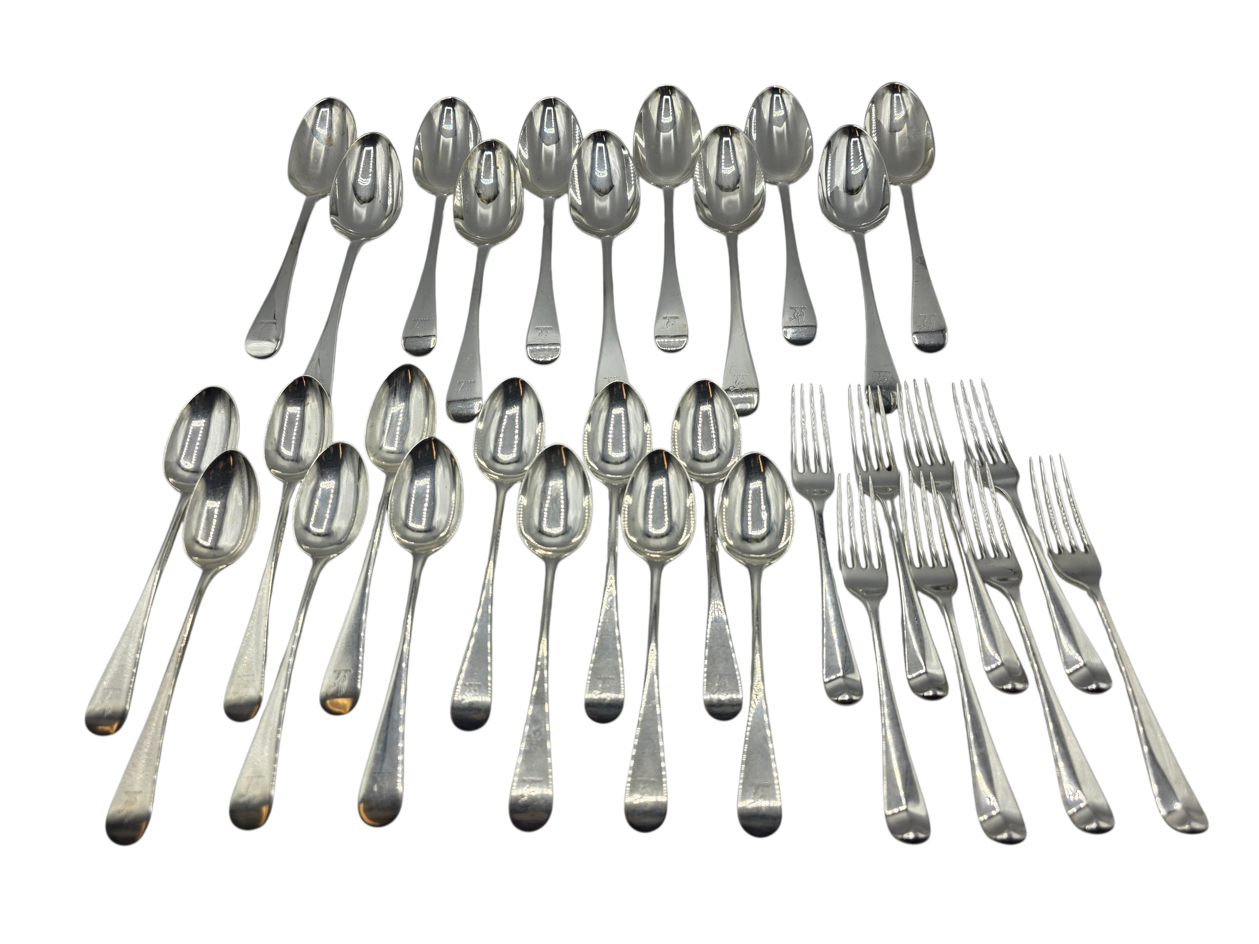 A collection of sterling silver flatware, to include 8 desert forks, 12 desert spoons, 11 serving spoons. Francis Higgins London Various dates. 1116 g