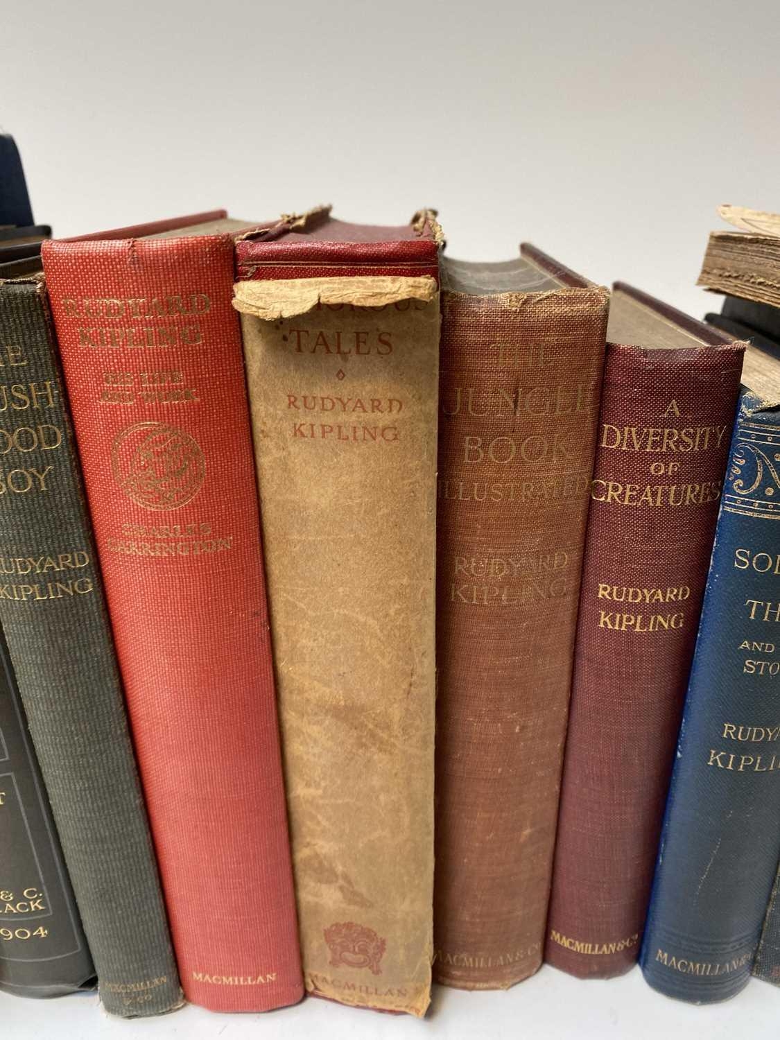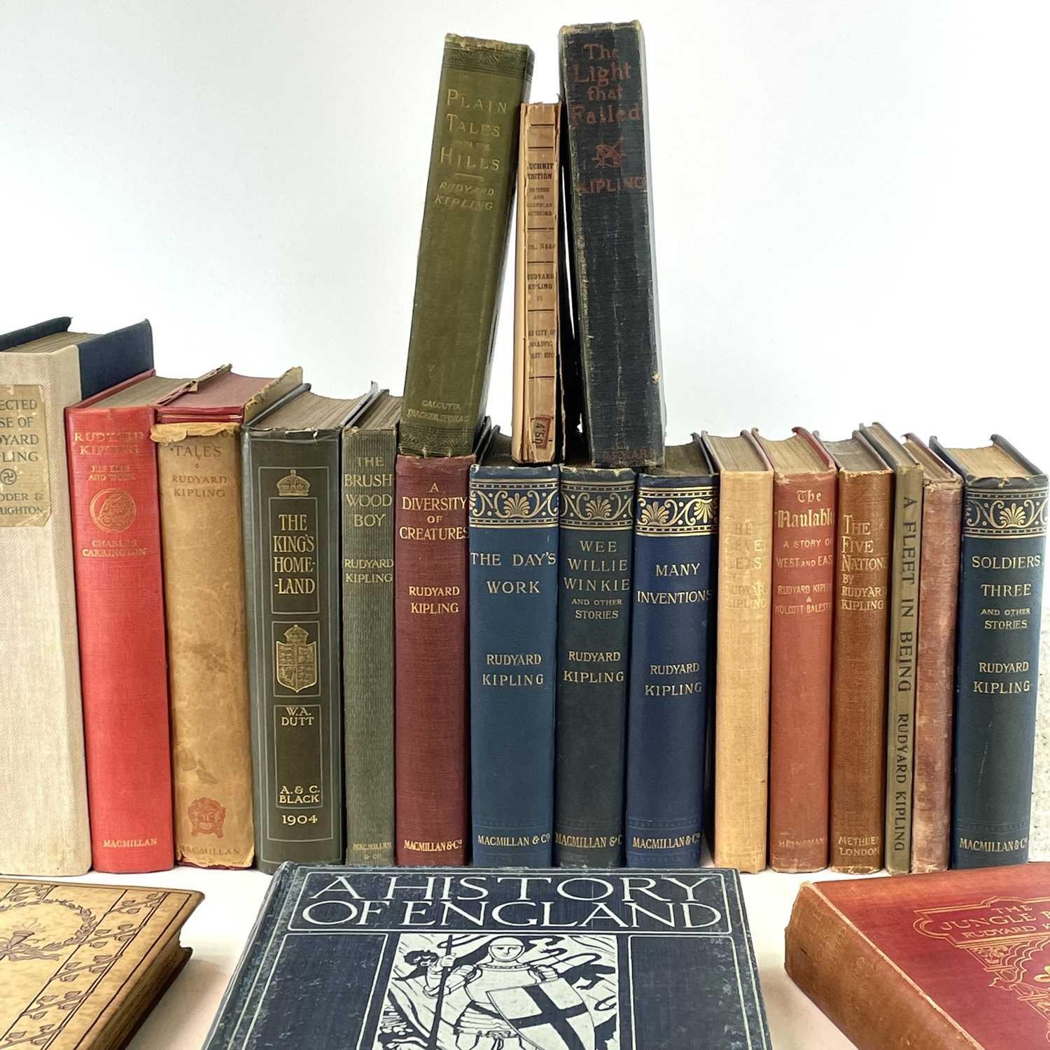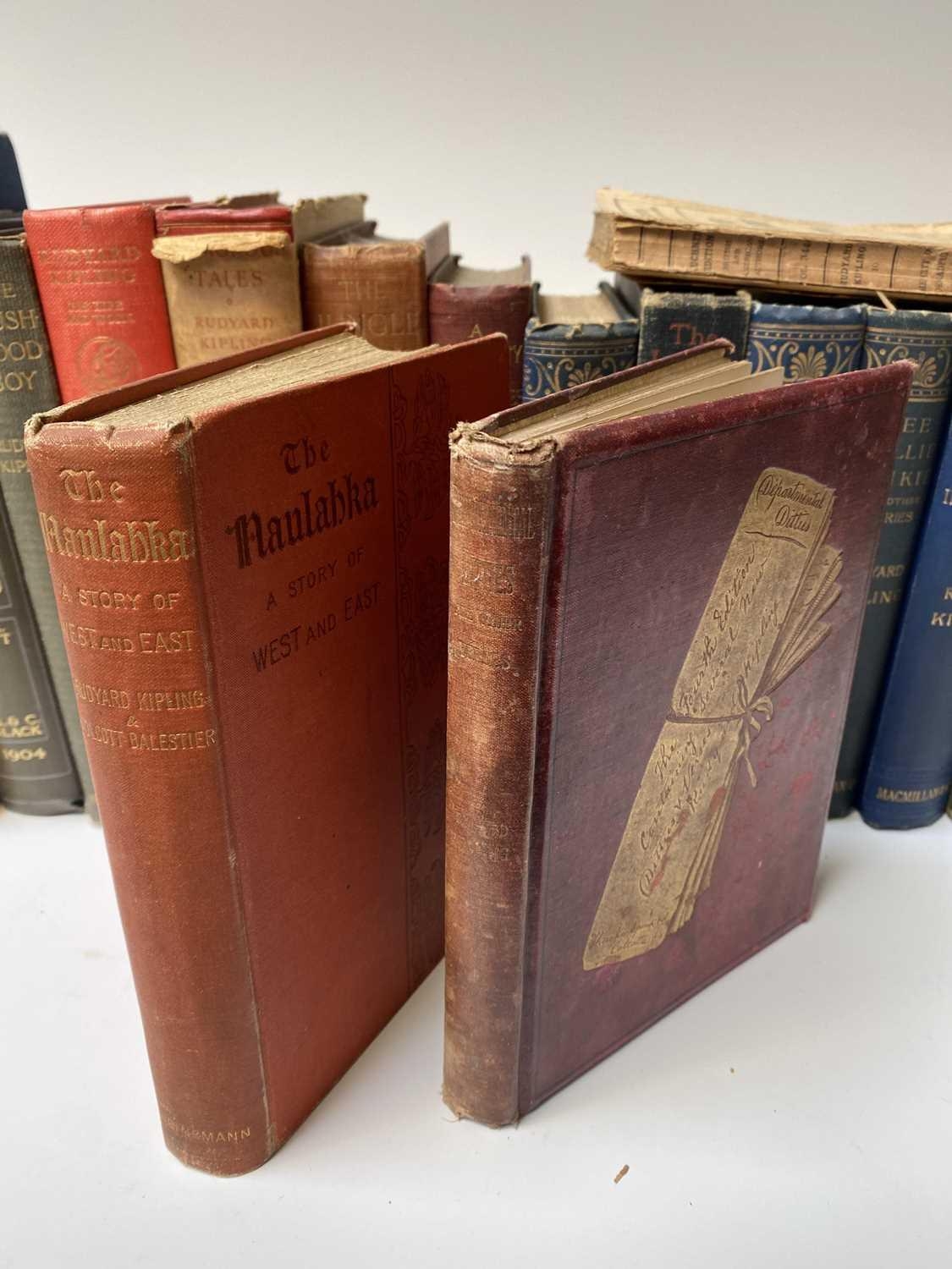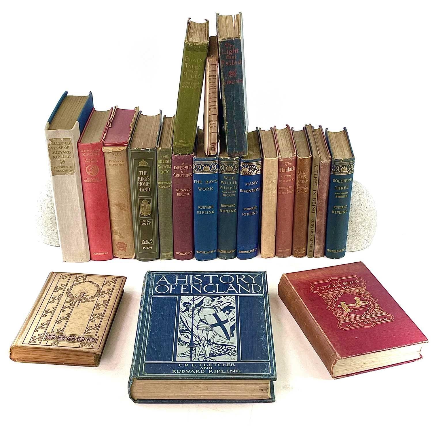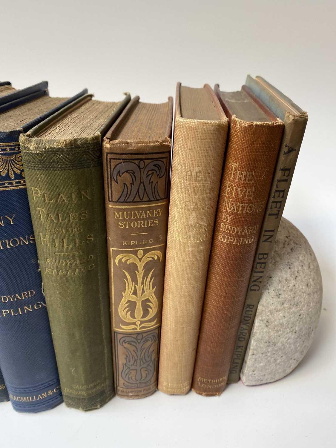 RUDYARD KIPLING. 'The Naulahka: A Story of West and East,' first edition, original orange cloth, owners ink signature to title page, William Heinemann, 1892; 'Departmental Ditties and Other Verses,' original red cloth with gilt embossed letters to front board, Thacker, Spink, and Co, Calcutta, 1890; 'The Seven Seas,' second edition, original cloth, bleached spine, Methuen and Co, 1896; 'The Five Nations,' original cloth, bleached spine, Methuen and Co, 1903; with seventeen other works by Kipling. (21)