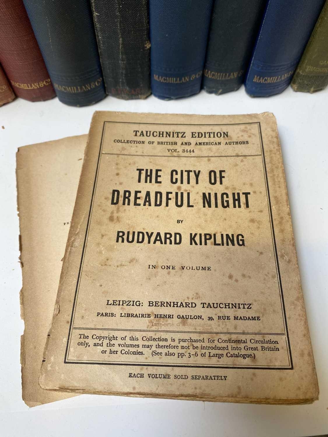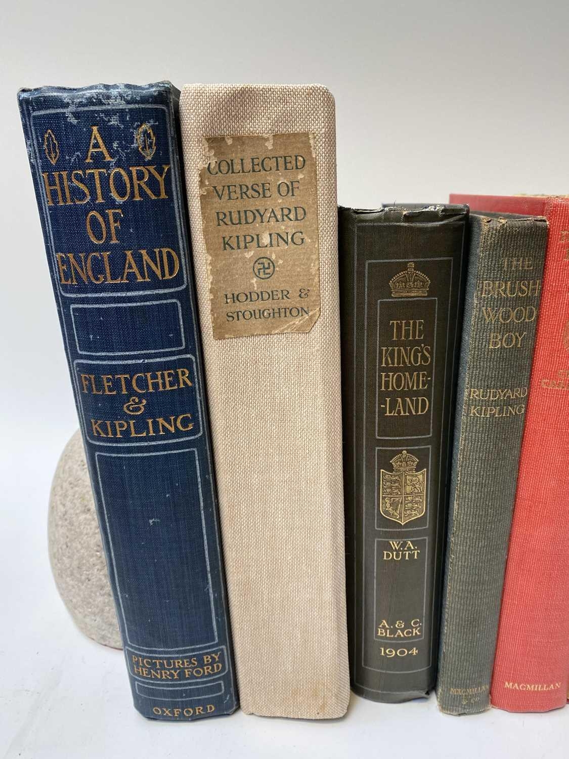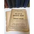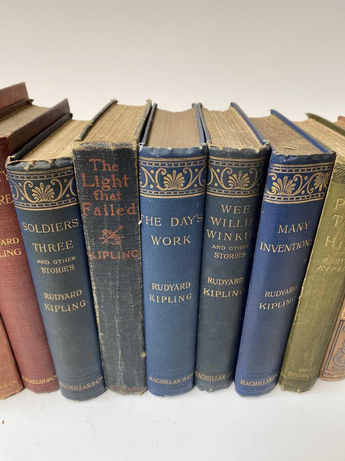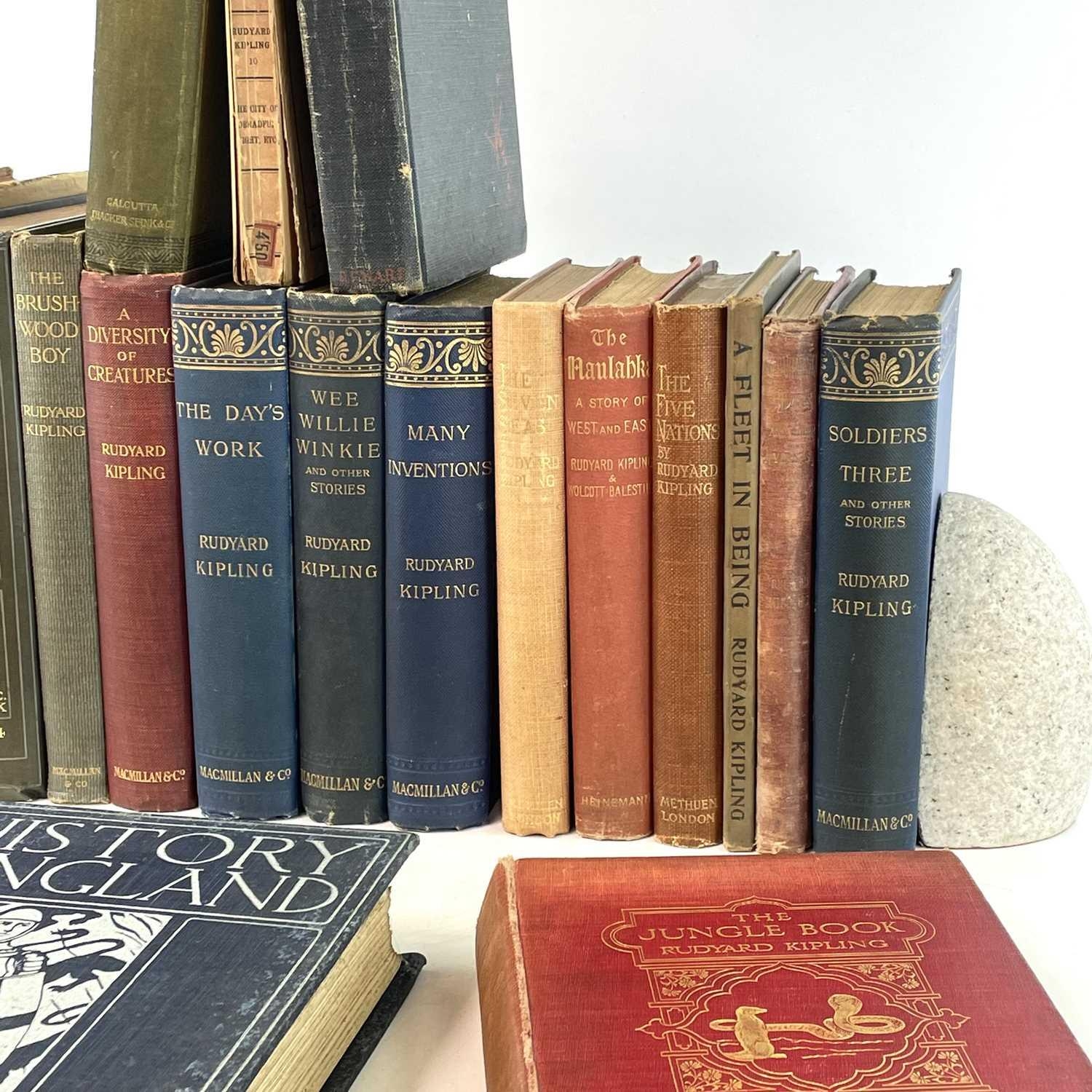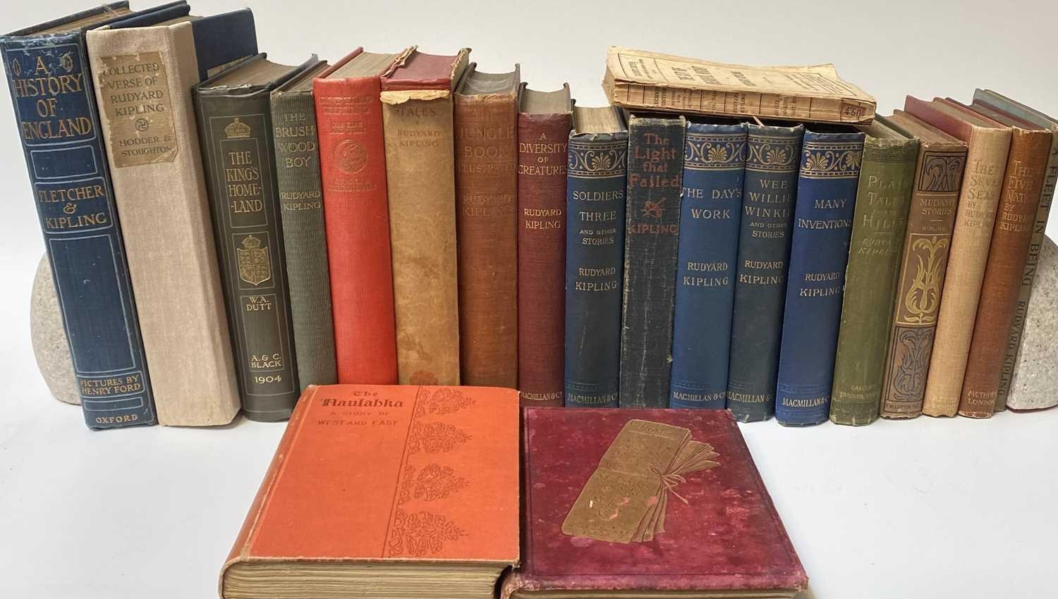 RUDYARD KIPLING. 'The Naulahka: A Story of West and East,' first edition, original orange cloth, owners ink signature to title page, William Heinemann, 1892; 'Departmental Ditties and Other Verses,' original red cloth with gilt embossed letters to front board, Thacker, Spink, and Co, Calcutta, 1890; 'The Seven Seas,' second edition, original cloth, bleached spine, Methuen and Co, 1896; 'The Five Nations,' original cloth, bleached spine, Methuen and Co, 1903; with seventeen other works by Kipling. (21)