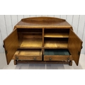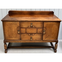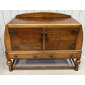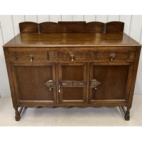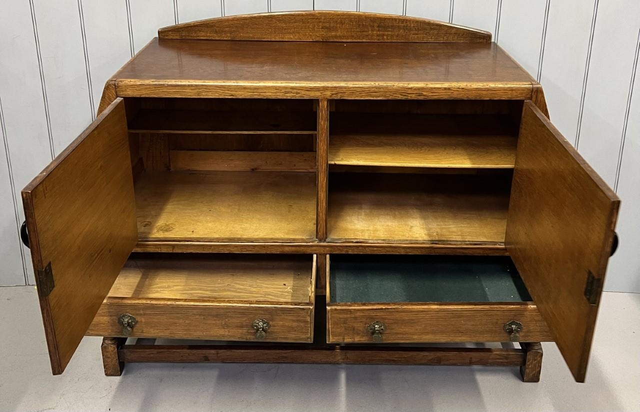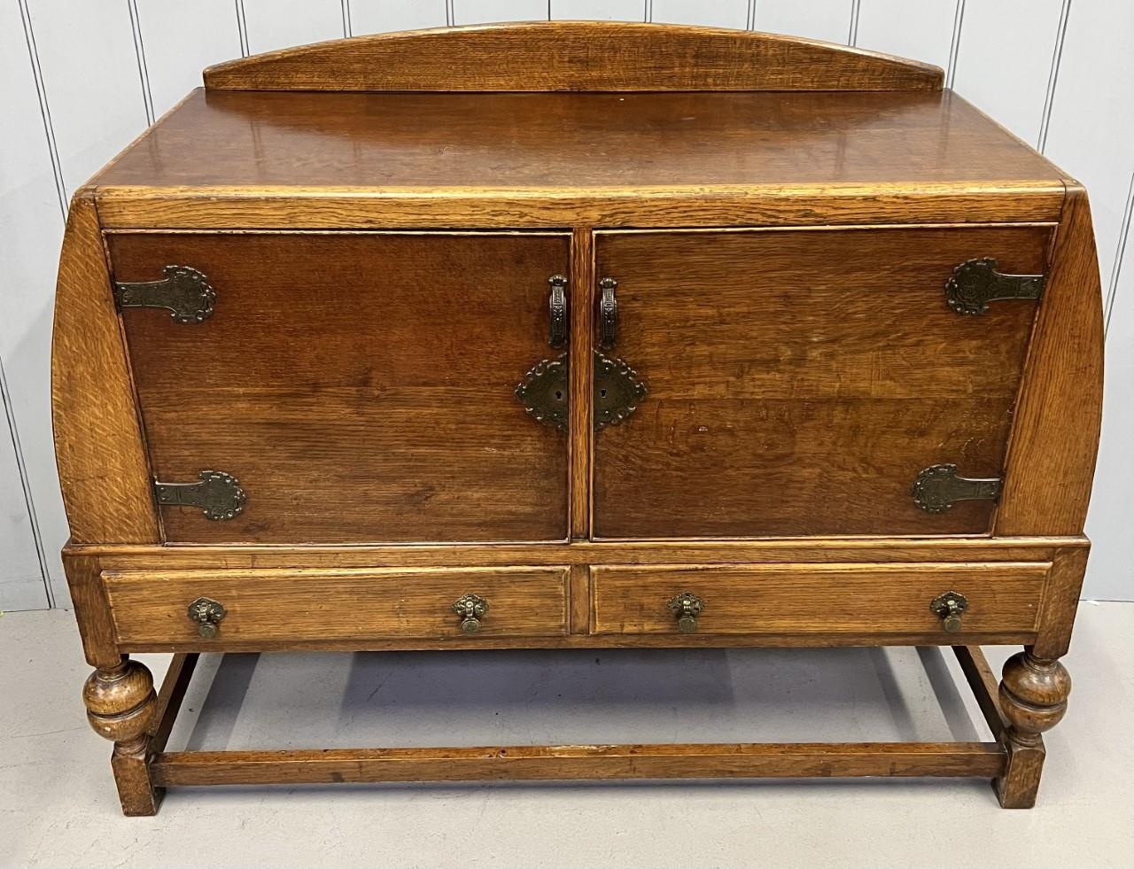 An Arts & Crafts oak sideboard. Double cupboard over two drawers. Decorative iron hinges & handles. Key present.