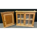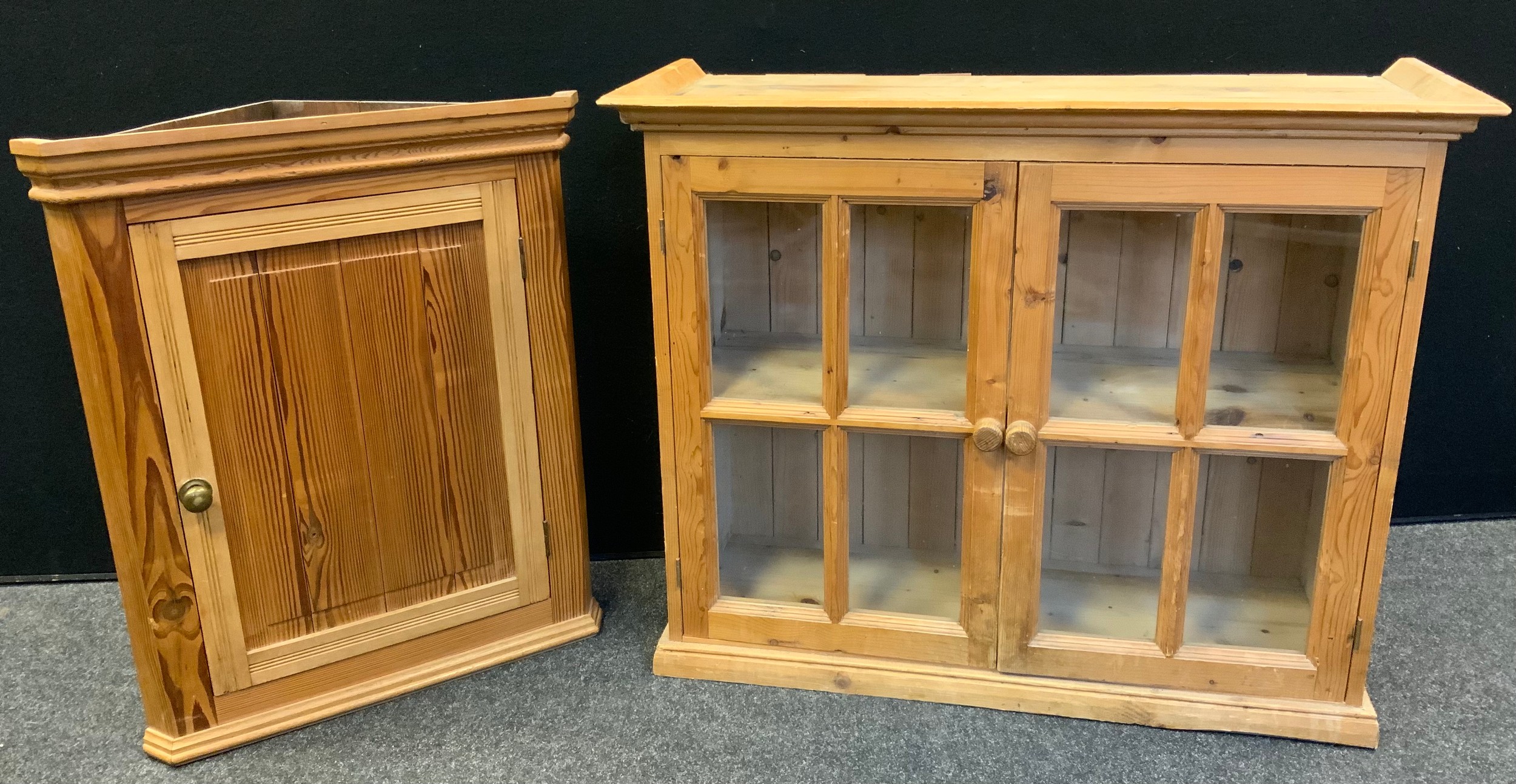 An early 20th century farmhouse pine wall unit, glazed panel doors, ogee cornice, , 94cm wide, 77cm high; a 20th century pitch pine corner unit (2)