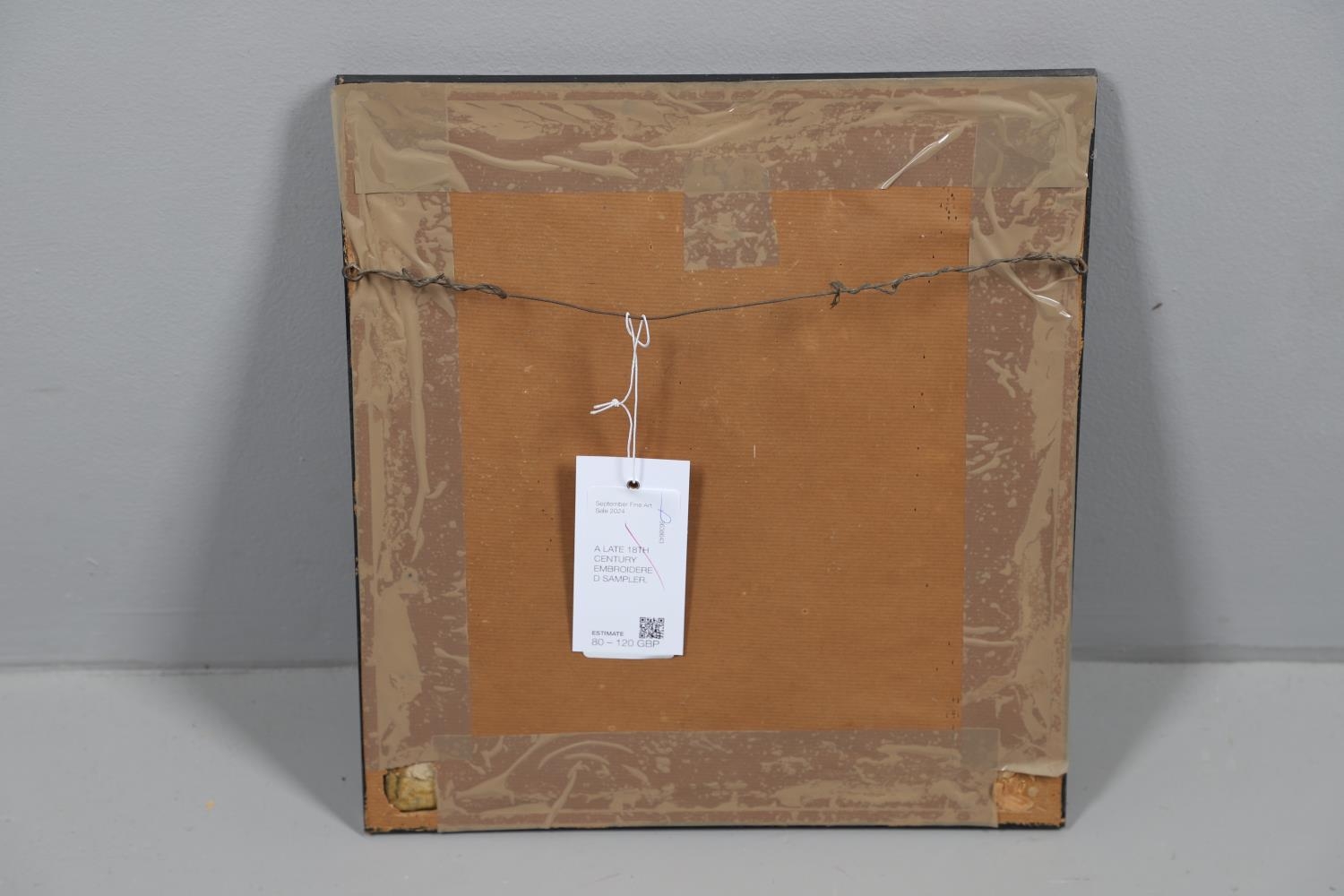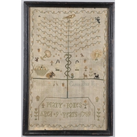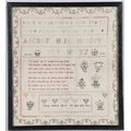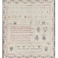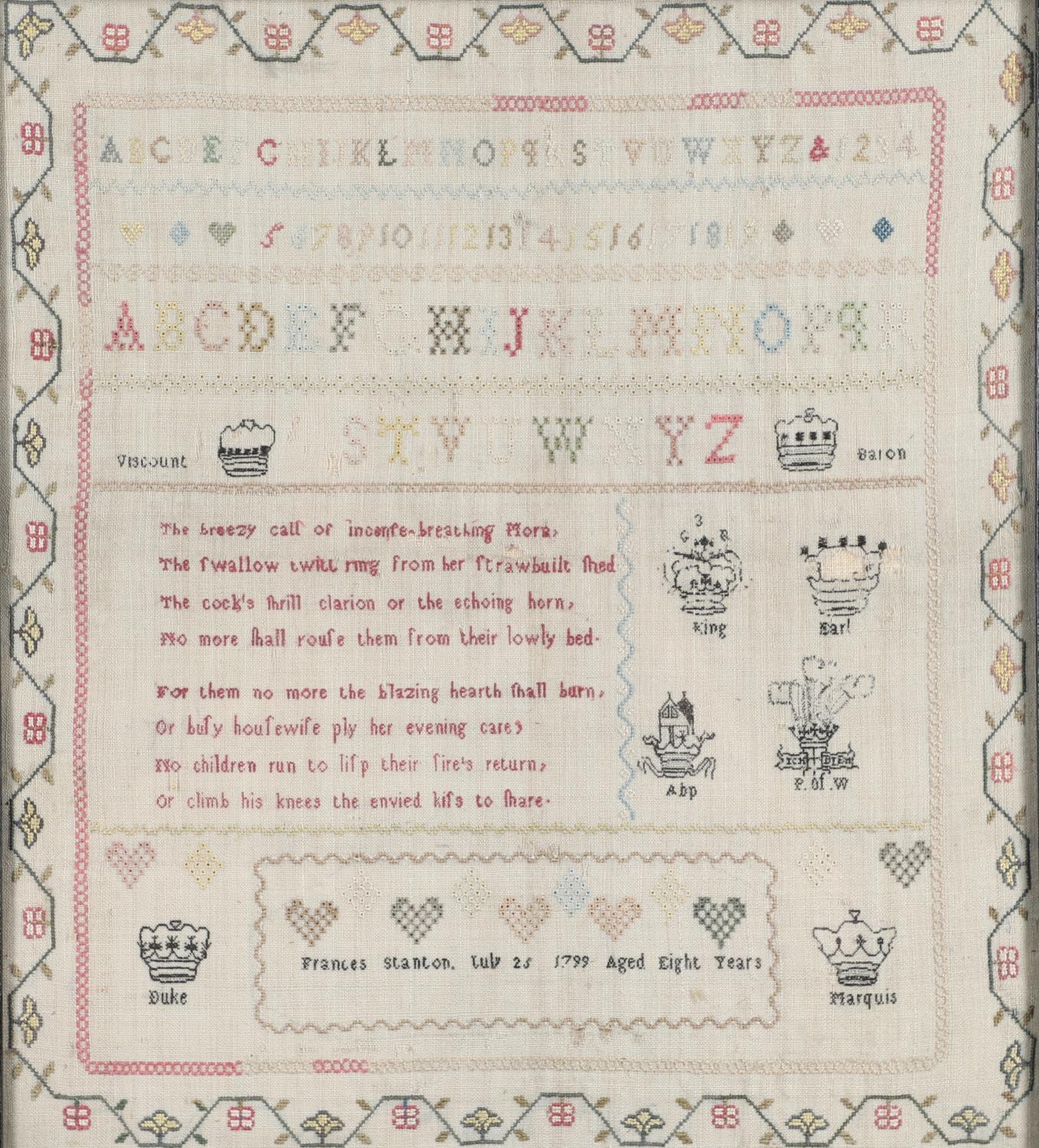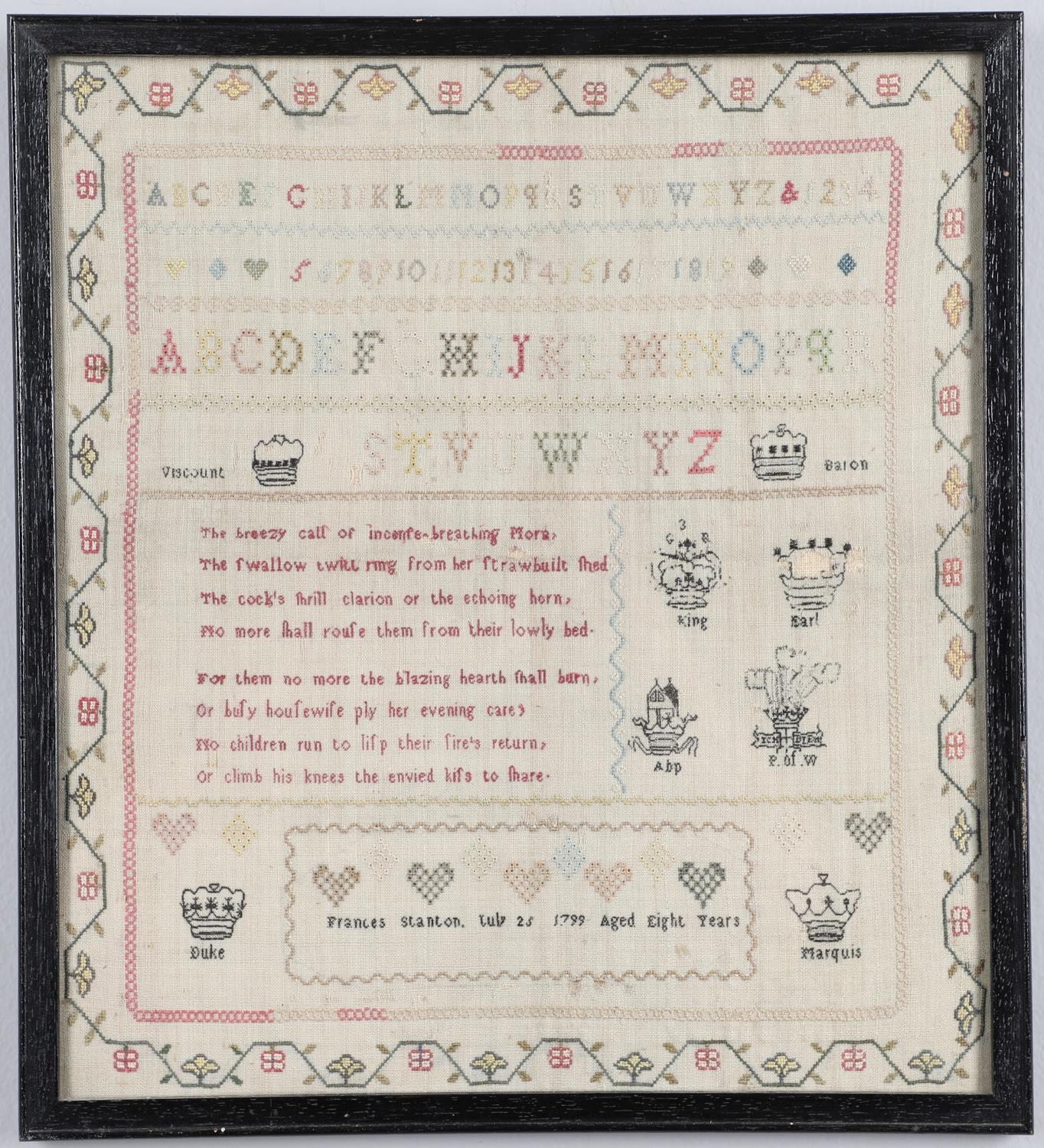 A LATE 18TH CENTURY EMBROIDERED SAMPLER. of unusual subject matter, illustrating the alphabet, prose and Royal emblems for the Prince of Wales (Feathers), Viscount, Baron, Duke, Marquis, Earl, King and Archbishop, within a border of flowers, by Frances Stanton Aged Eight Years, July 25 1799, 33cm x 30cm.
