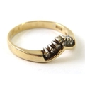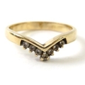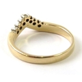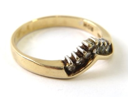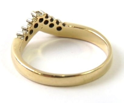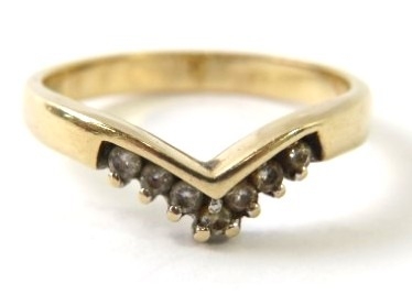 A diamond and precious metal wishbone ring set with 7 round single cut diamonds, shank stamped ‘14K’, 3.3g approx