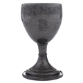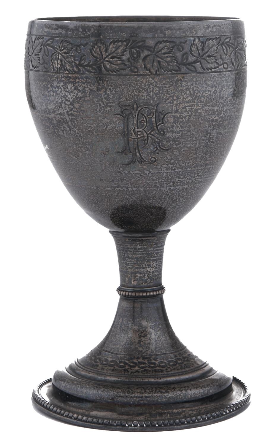 A Scottish George III silver goblet, engraved vine leaf border on beaded stem and foot, 15cm h, by Patrick Robertson, Edinburgh, date letter rubbed, c1770, 7ozs 8dwts, engraved with a monogram at later date