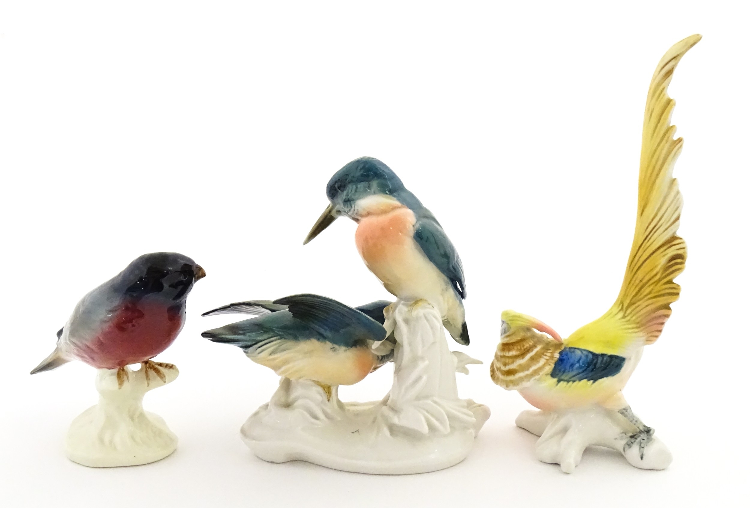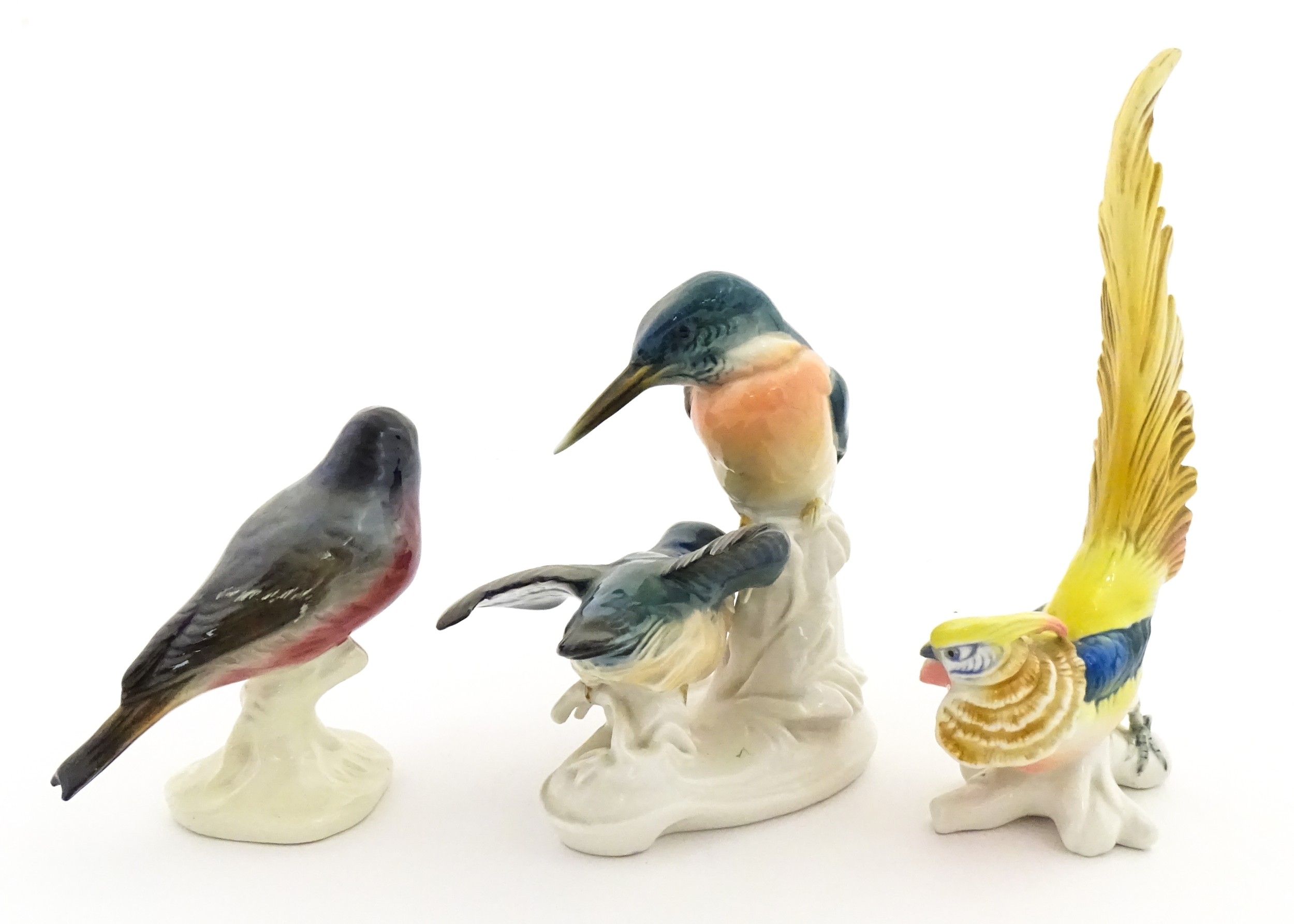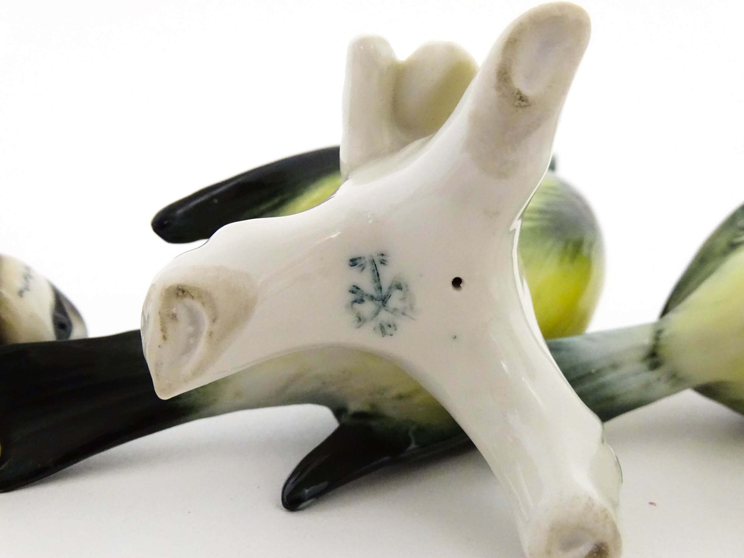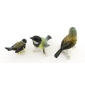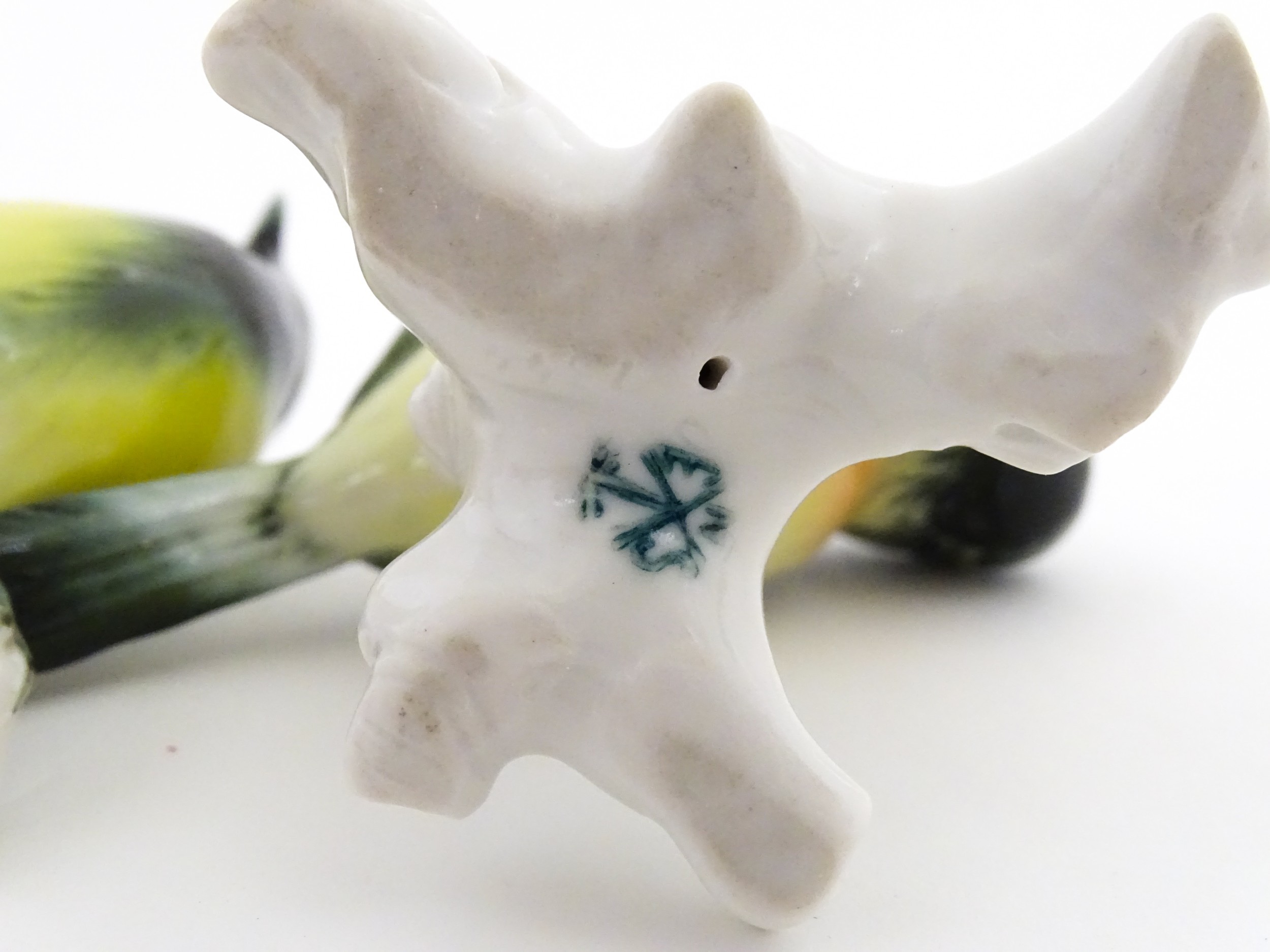 Four Karl Ens porcelain models of birds to include a golden pheasant, great tit, etc. Together with two German models of birds. Largest approx. 8 1/4" high (6)