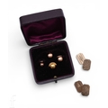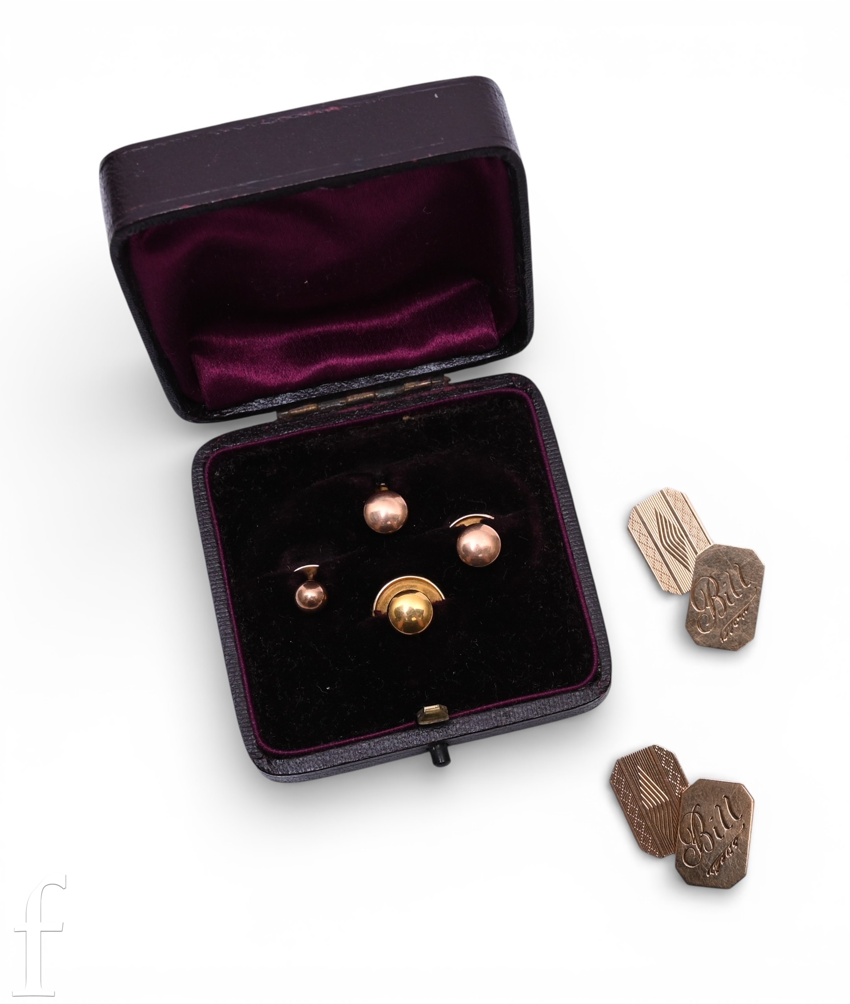 A pair of 9 carat gold panel cufflinks, engraved 'Bill', Birmingham 1901, total weight 5.9g, and a cased set of 9 carat gold dress studs, hallmarked for 9 carat, total weight 2.3g.