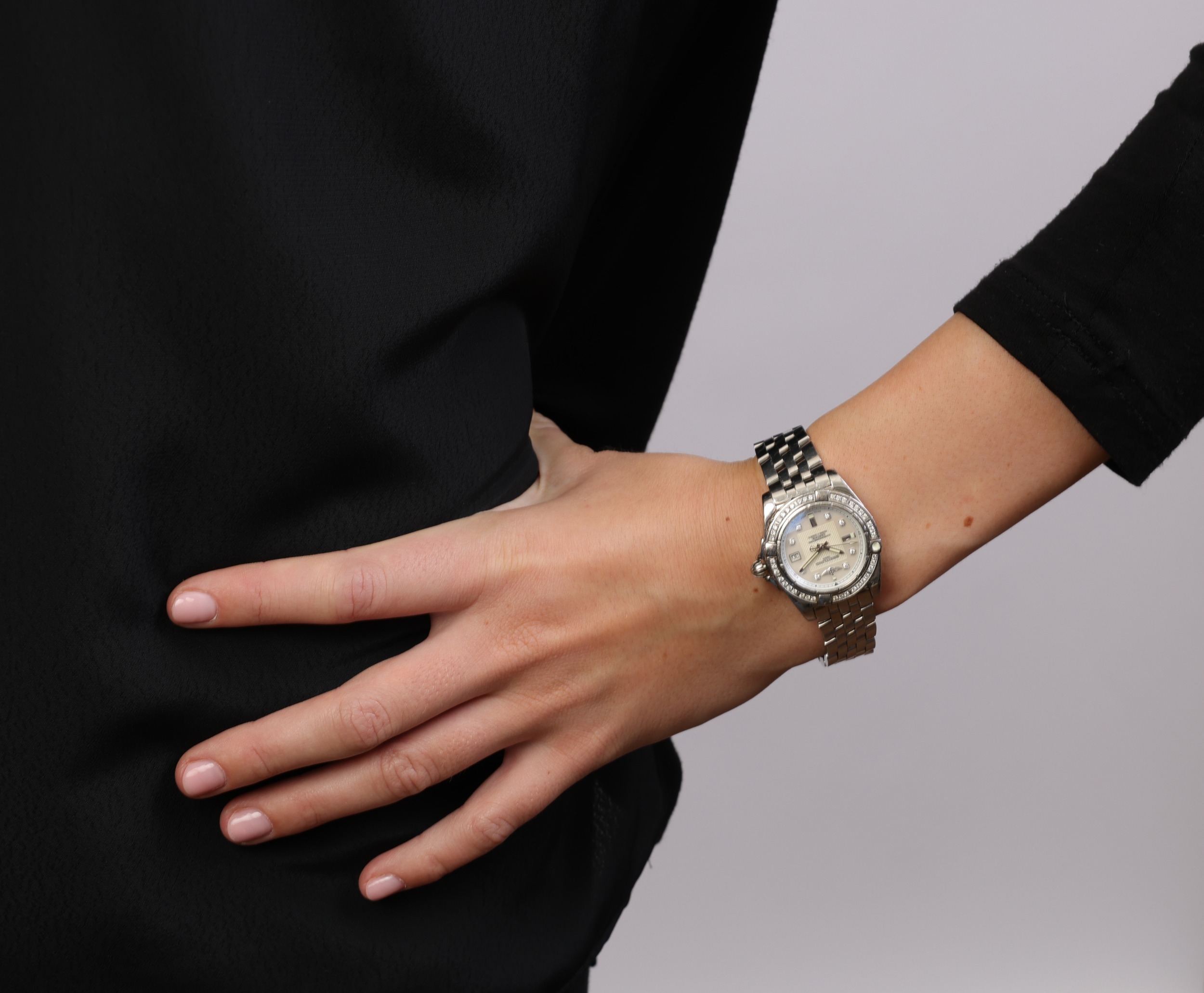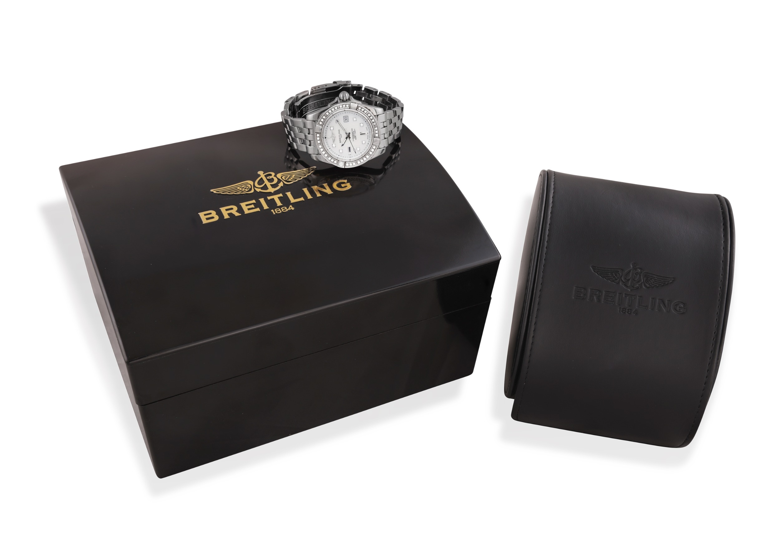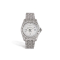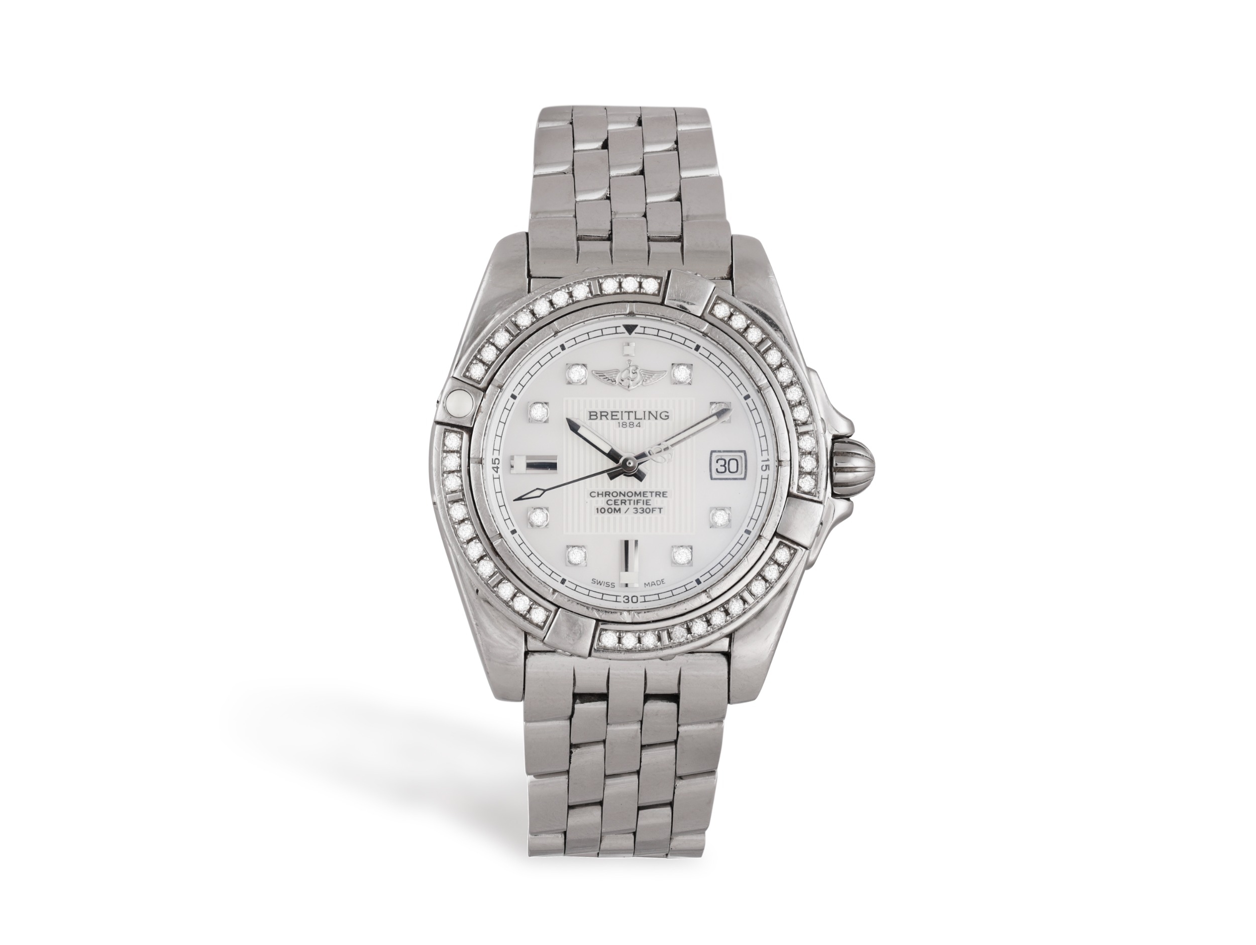 BREITLING: A LADY’S STAINLESS STEEL, QUARTZ AND DIAMOND ‘GALACTIC 32’ WRISTWATCH Quartz movement, the circular-shaped mother-of-pearl dial, with brilliant-cut and baton hour-indicators, date aperture at 3 o’clock, central square-shaped reeded dial detail and outer minute track, brilliant-cut diamond-set bezel, case with tapered lugs, to a polished link bracelet, in stainless steel, dial signed Breitling, ref. no. A71356 and serial no. 1269745, with case and outer box, case 32 (without crown), inner circumference 16.5cm