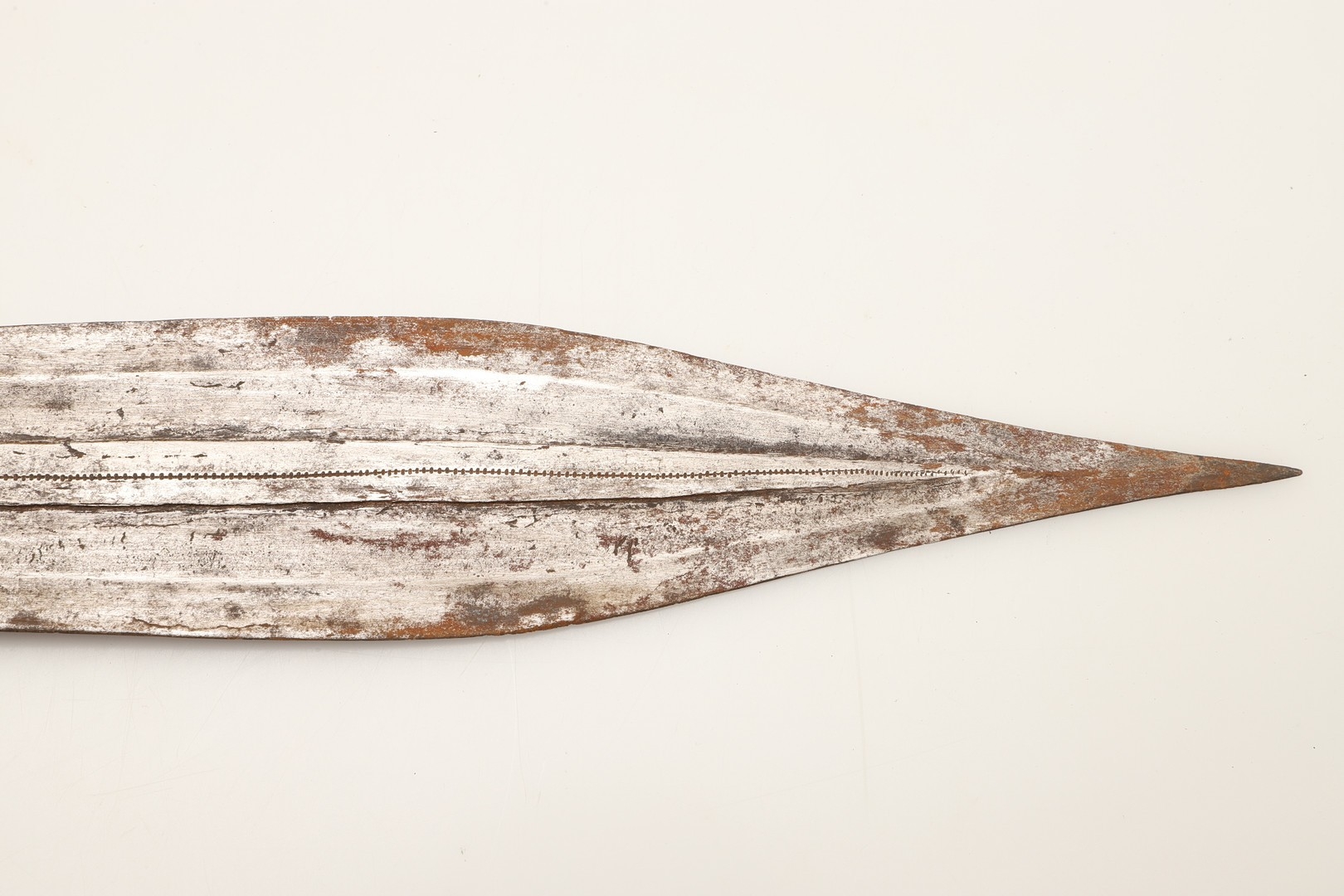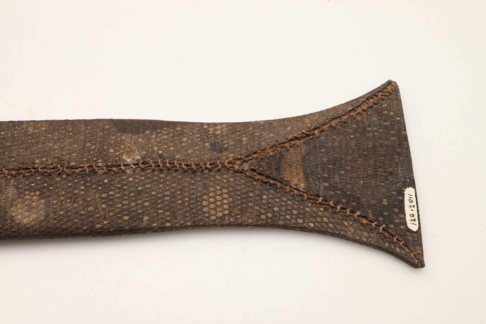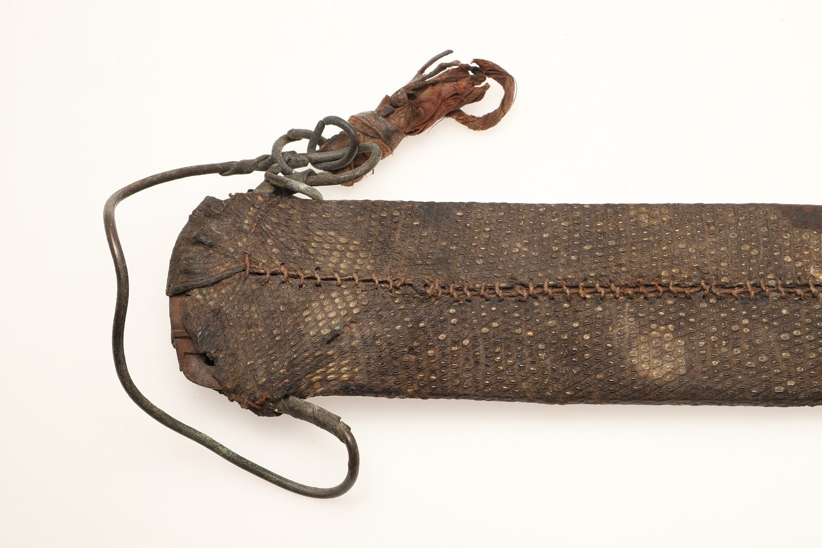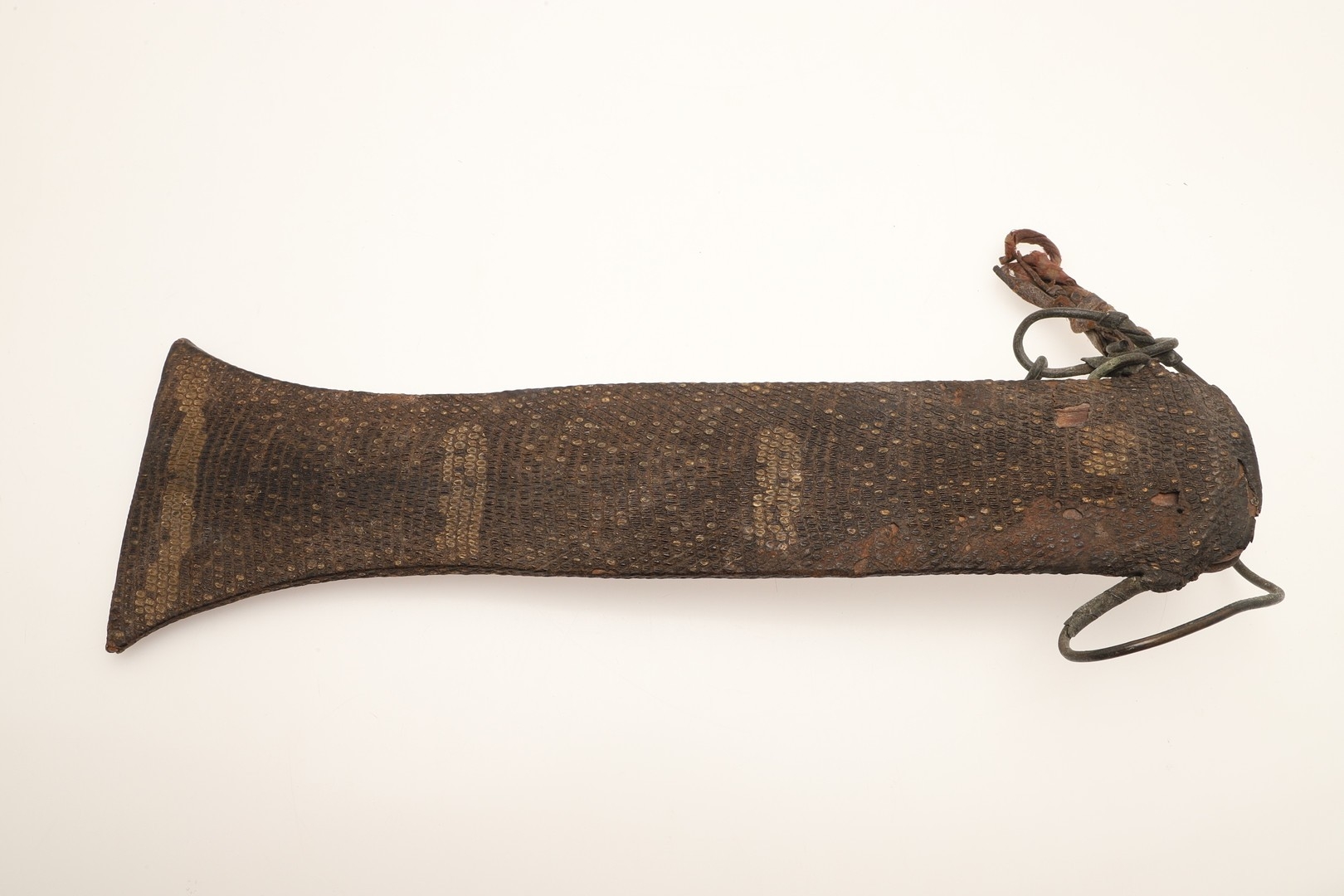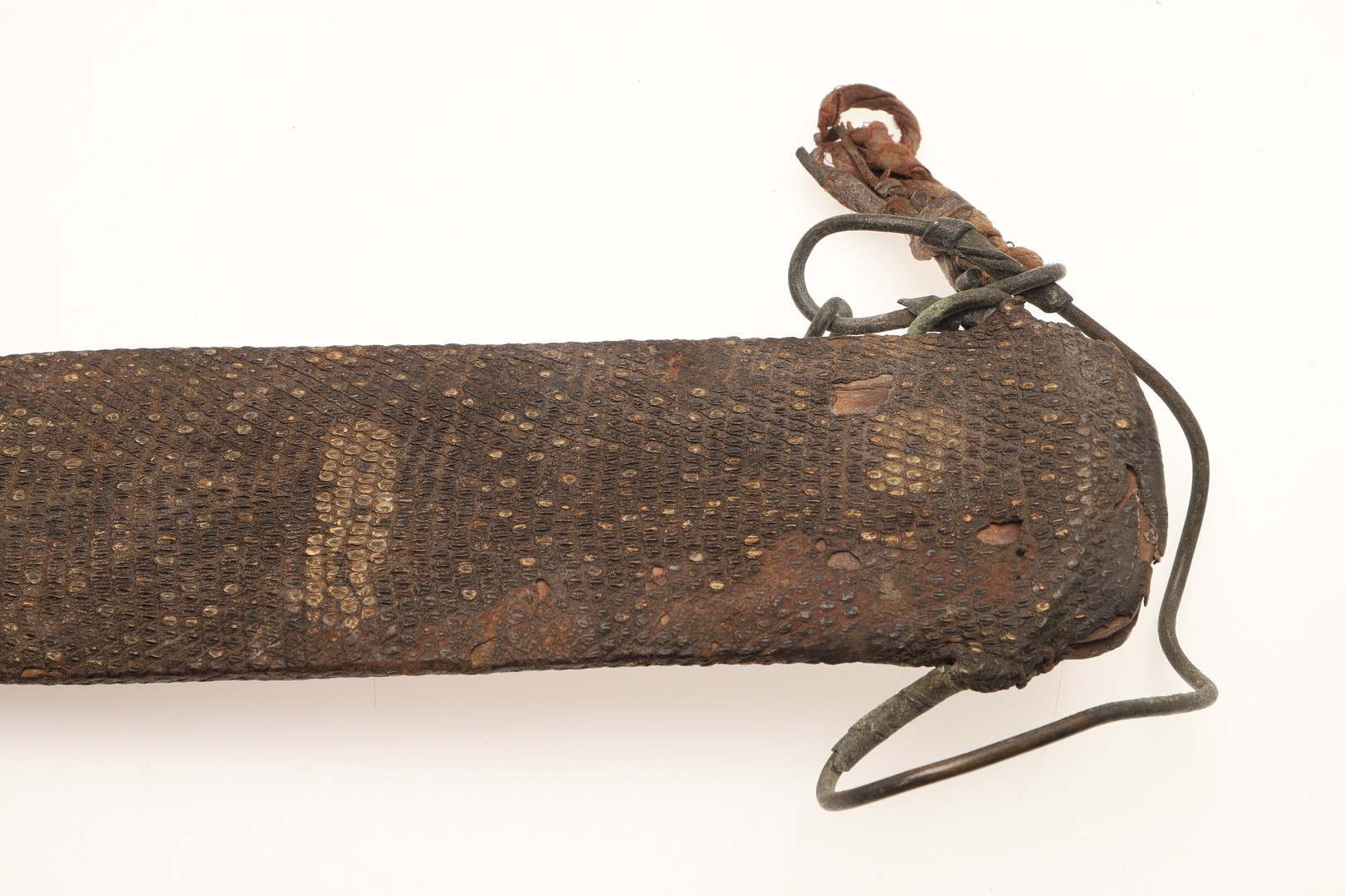 A FANG KNIFE AND SCABBARD. A knife with a 40 cm pointed, spear shaped blade with central ridge, twin fullers and engraved decoration. On a decorative mount and wooden grip. In a monitor lizard skin mounted scabbard with wire belt loop. 49 cm. "The Fang are part of an indigenous group of peoples who inhabit the rain forests of the Cameroons, Republic of the Congo, Equatorial Guinea, Gabon and Sao Tome. Although separate ethnic groups they all share a common history".