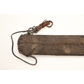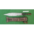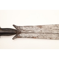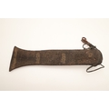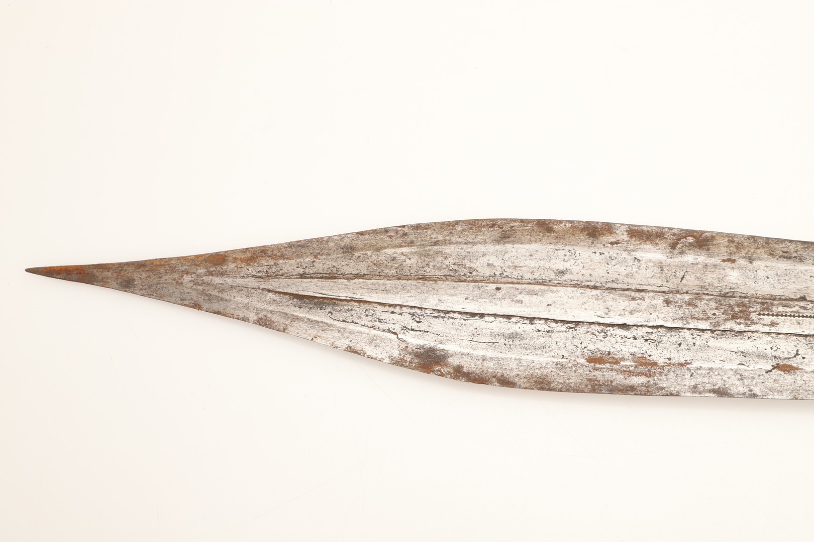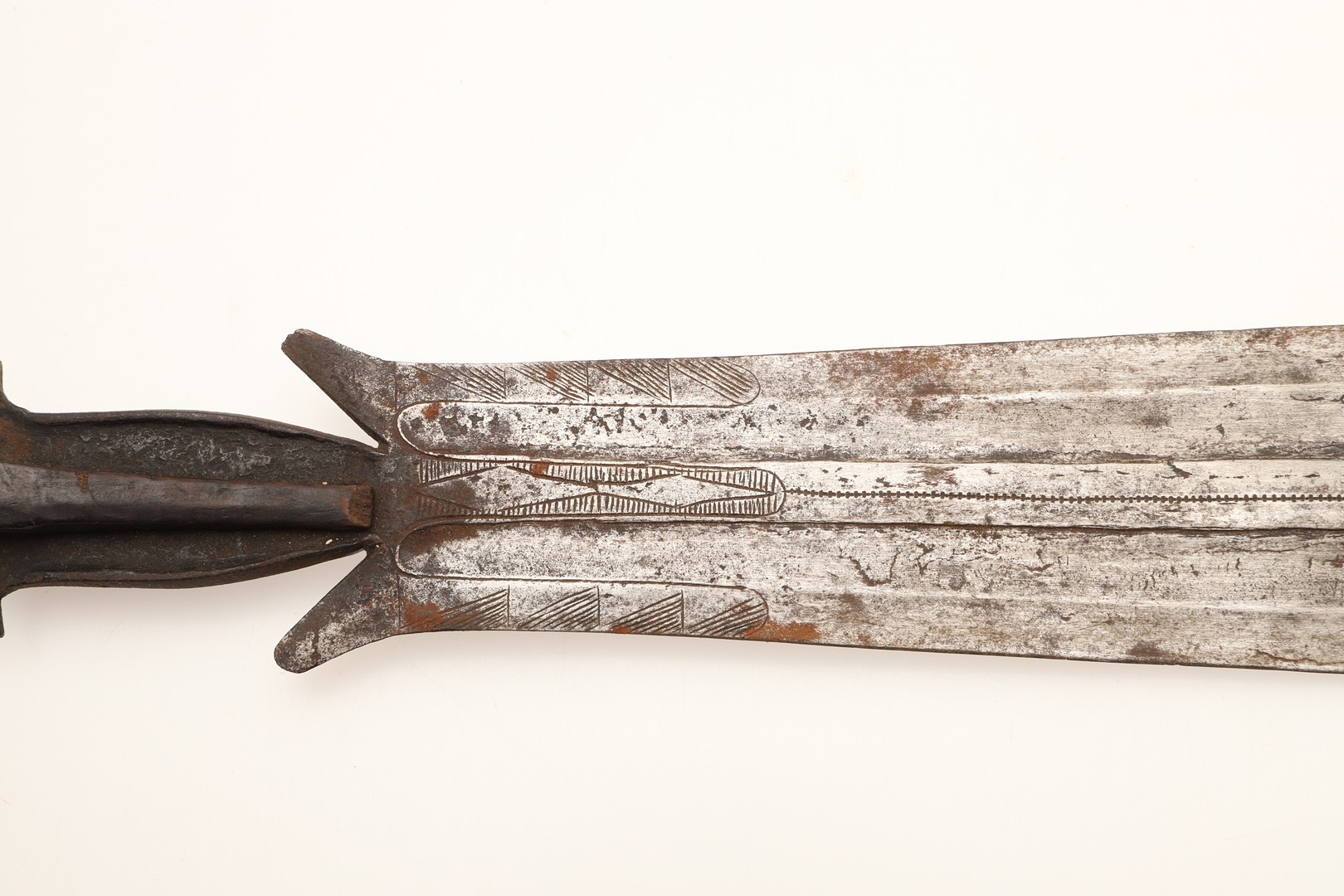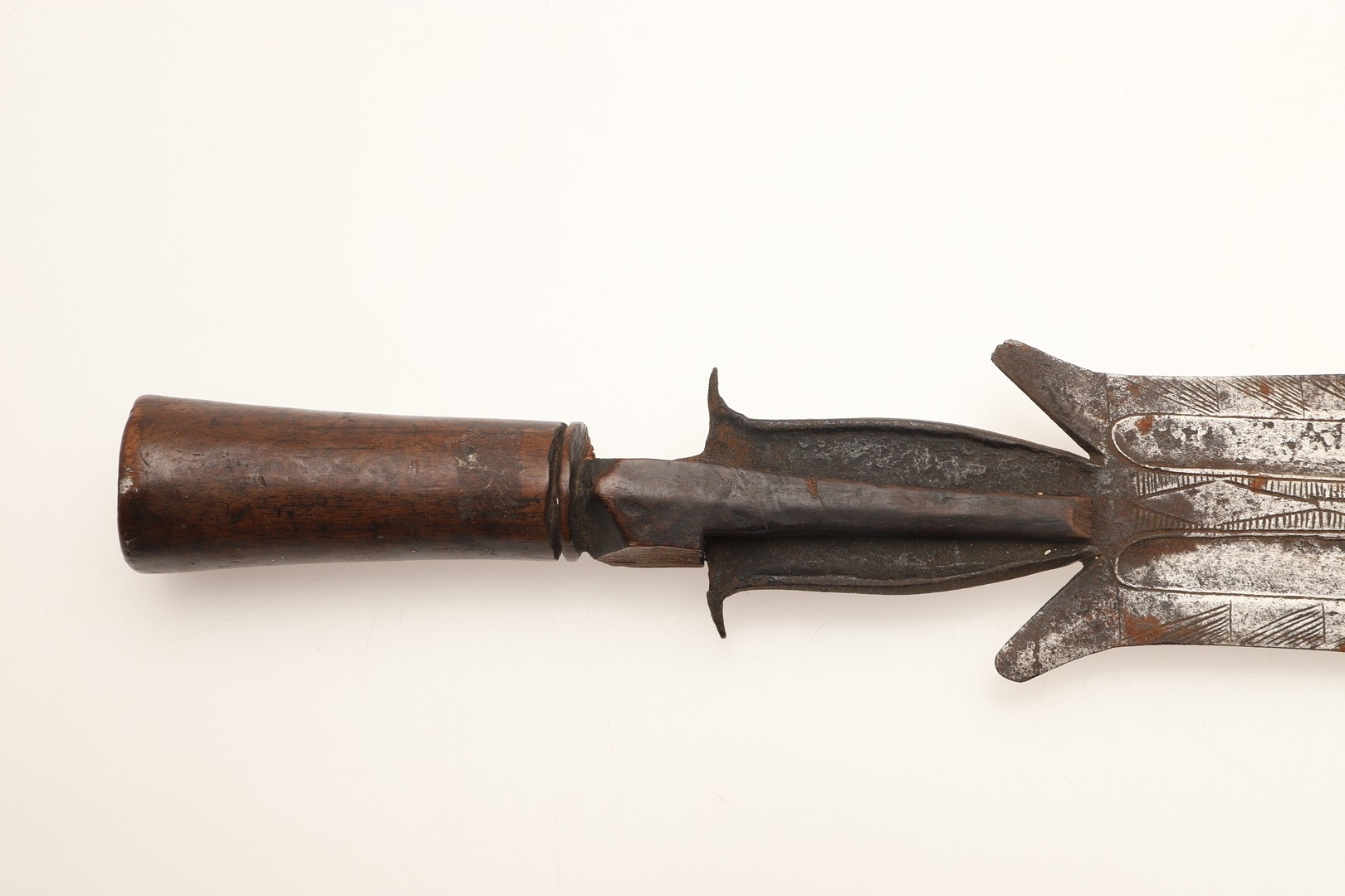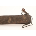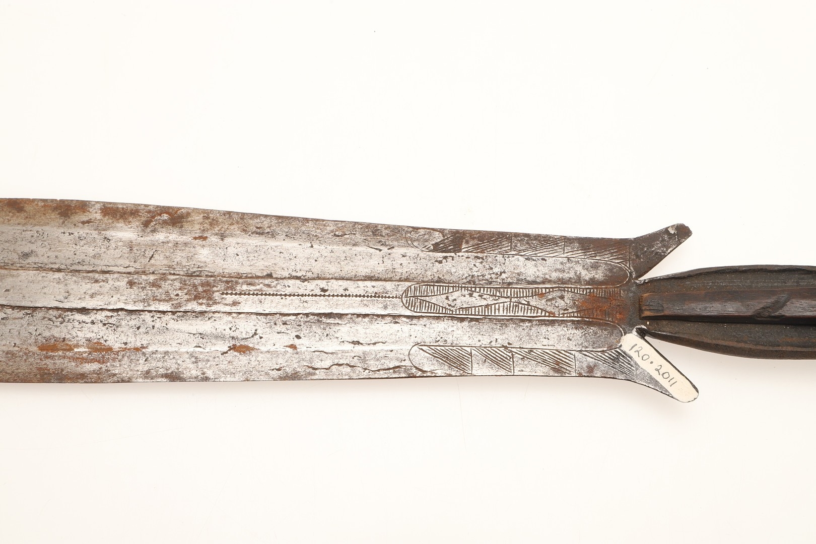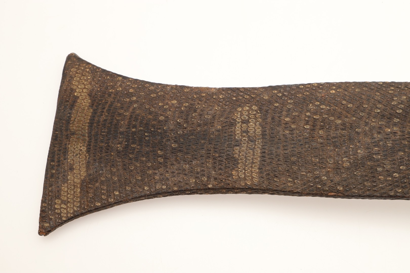A FANG KNIFE AND SCABBARD. A knife with a 40 cm pointed, spear shaped blade with central ridge, twin fullers and engraved decoration. On a decorative mount and wooden grip. In a monitor lizard skin mounted scabbard with wire belt loop. 49 cm. "The Fang are part of an indigenous group of peoples who inhabit the rain forests of the Cameroons, Republic of the Congo, Equatorial Guinea, Gabon and Sao Tome. Although separate ethnic groups they all share a common history".
