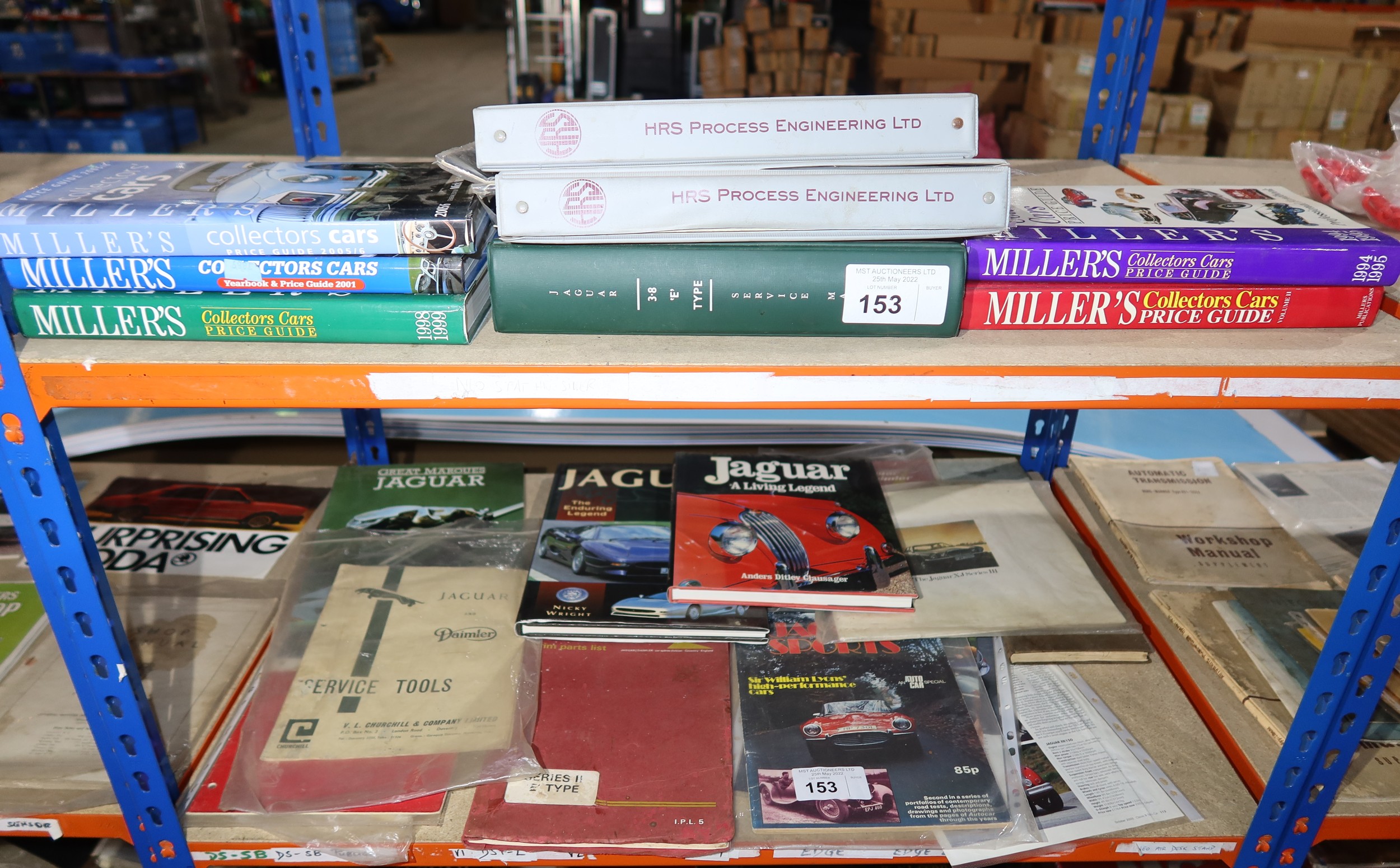 A quantity of various Jaguar books, magazines, parts lists and 5 x Millers Collectors Car Price Guides. Contents of 2 shelves