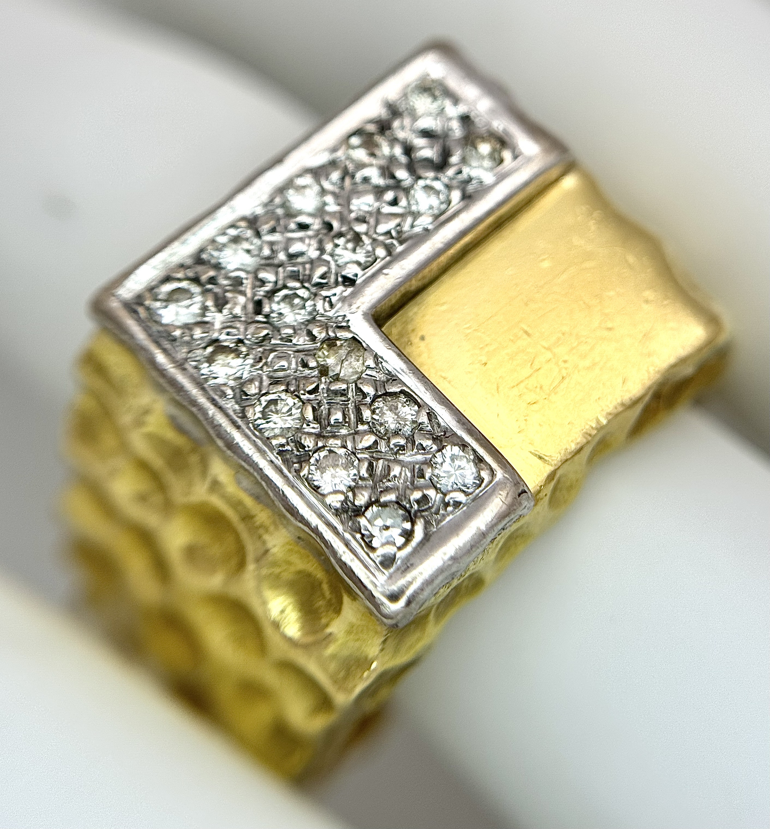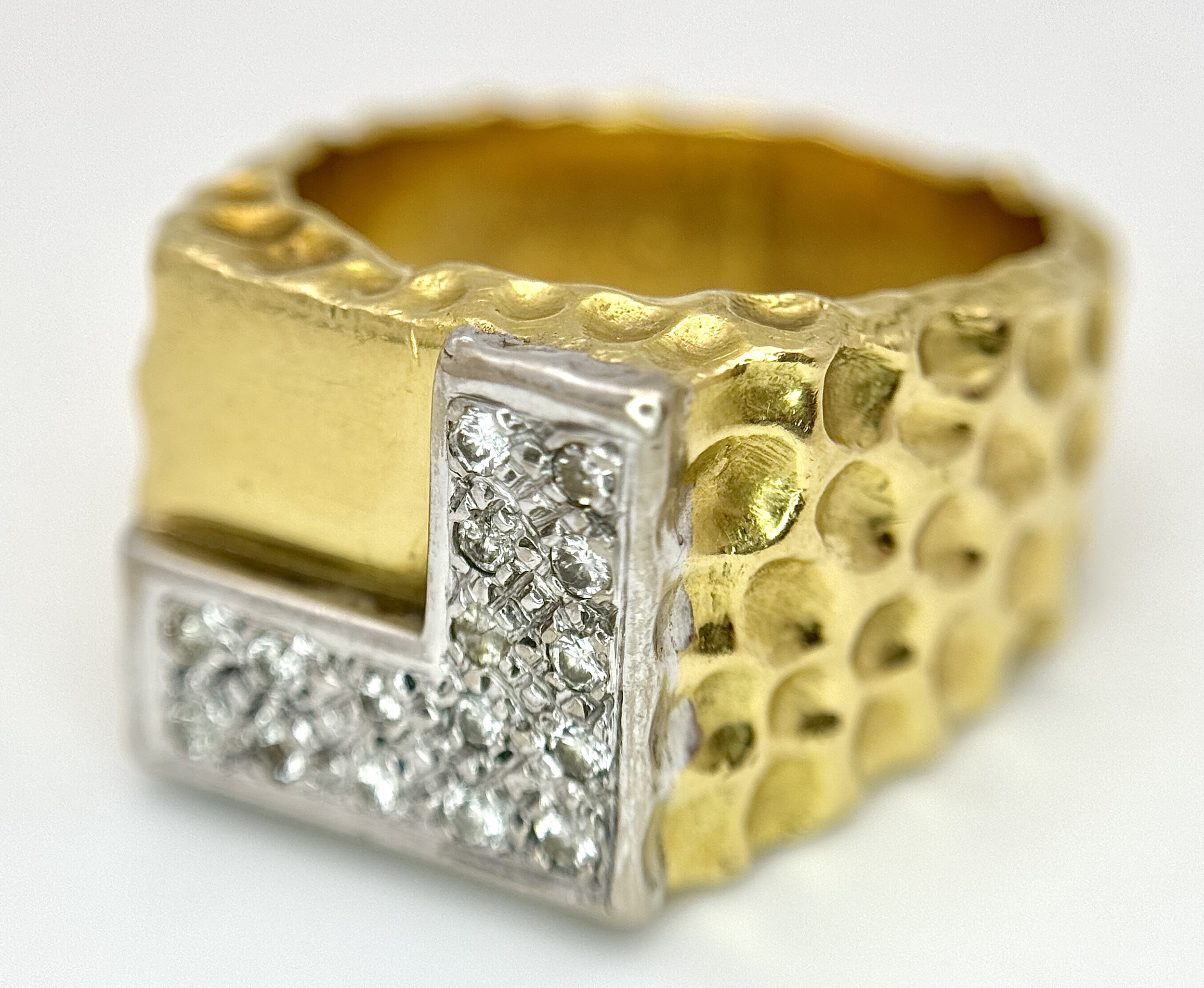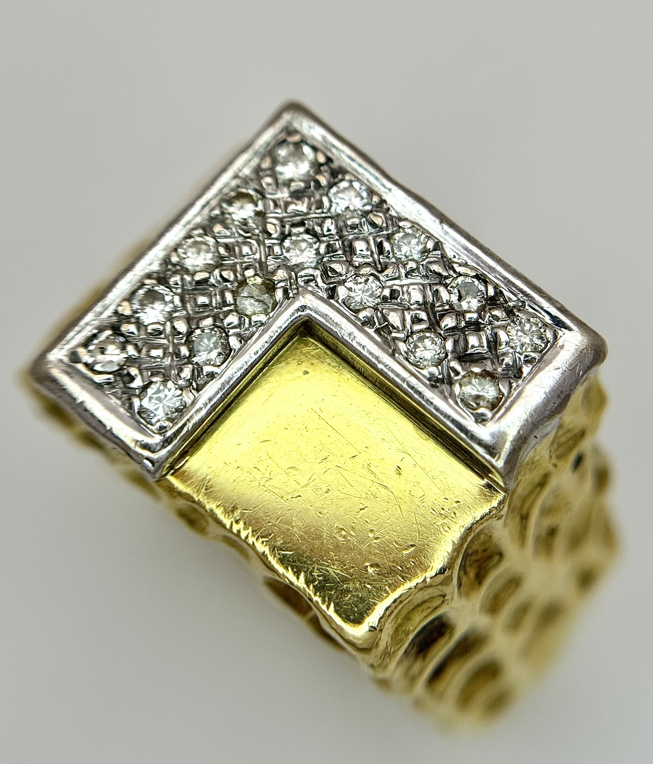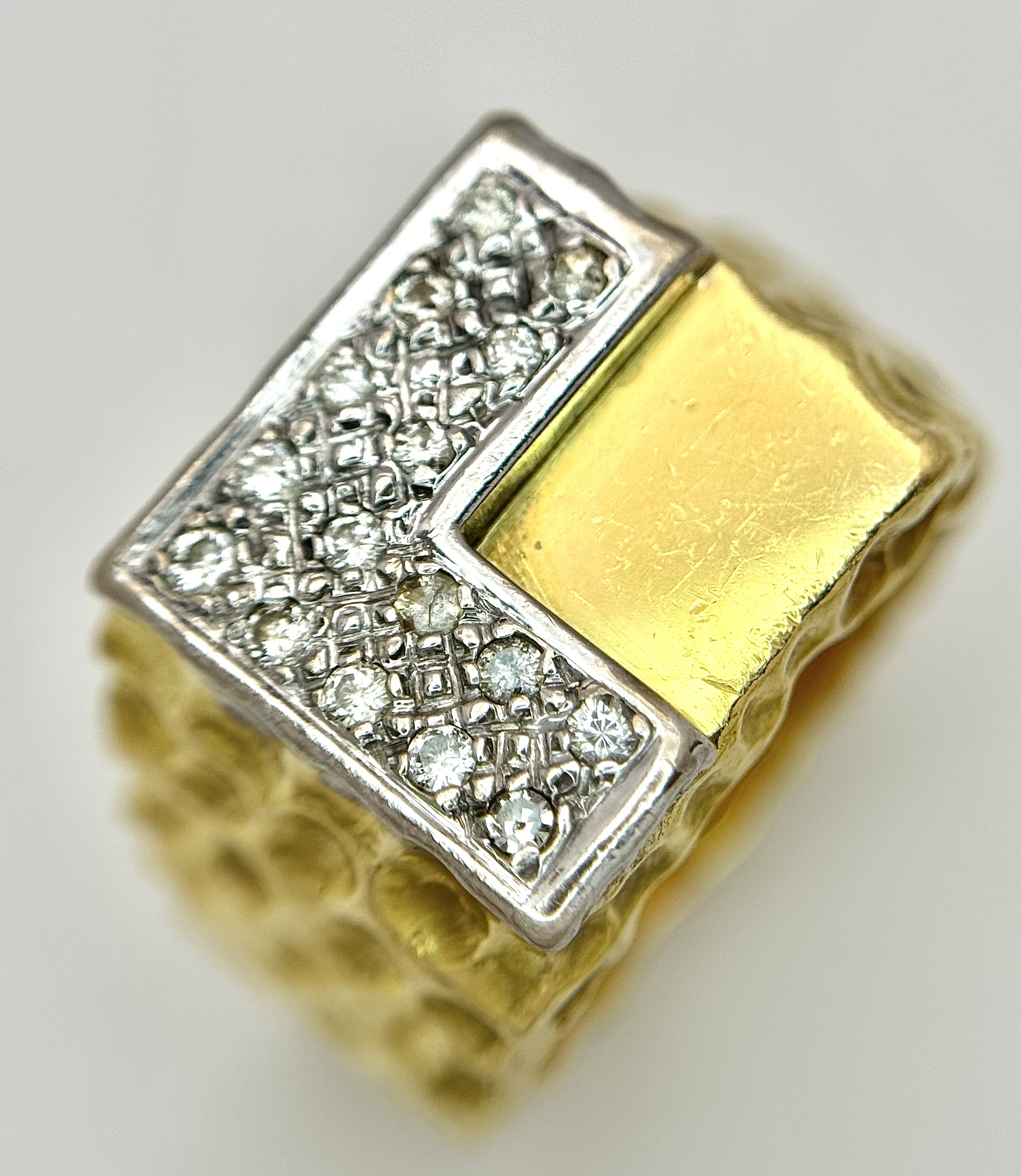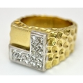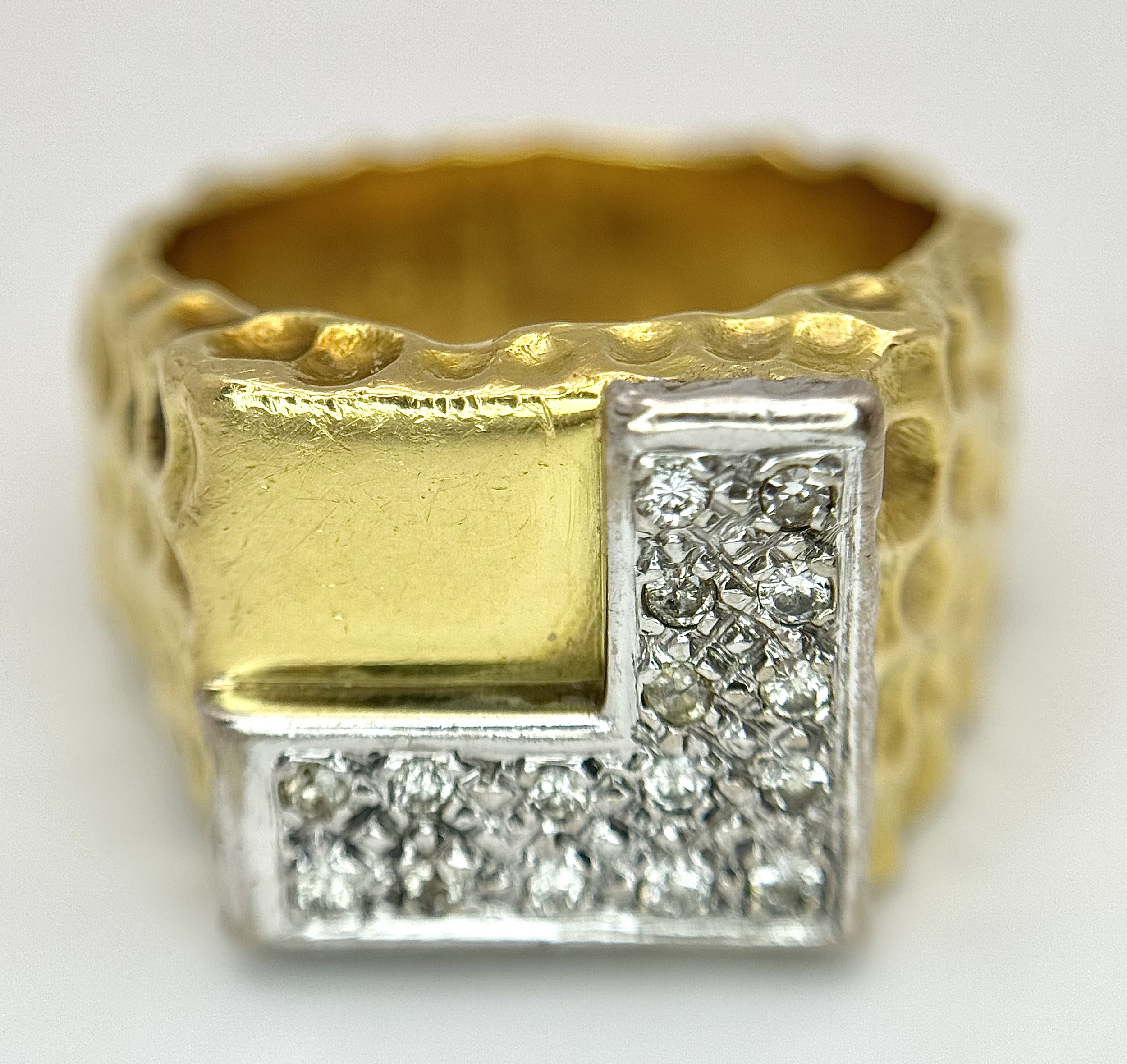 A Statement 18K Yellow Gold and Diamond Gents Signet Ring. Dimple effect band with an 'L' shaped diamond encrusted pave set face. Size X. 34.78g.