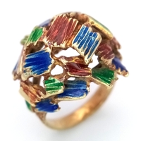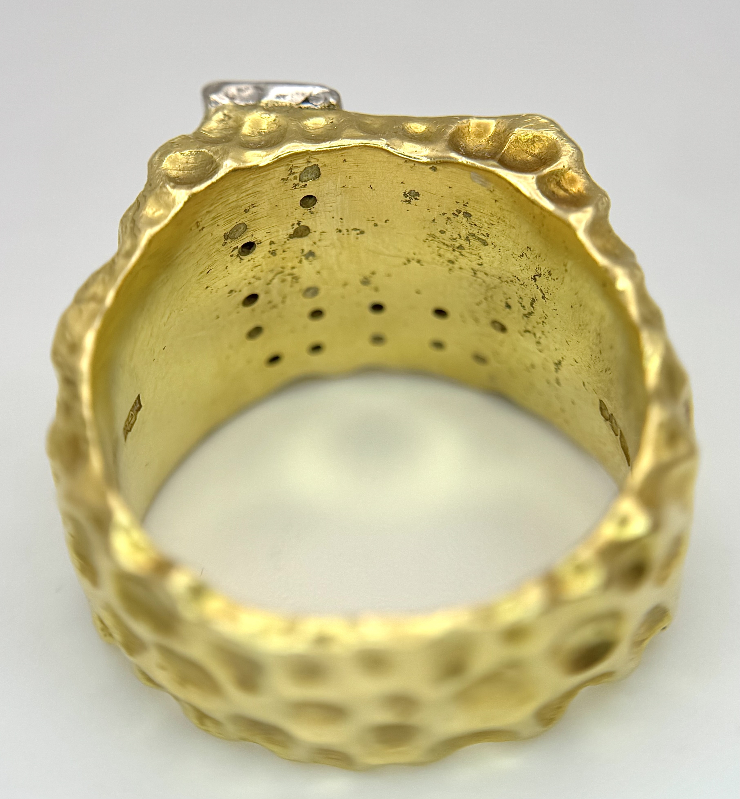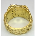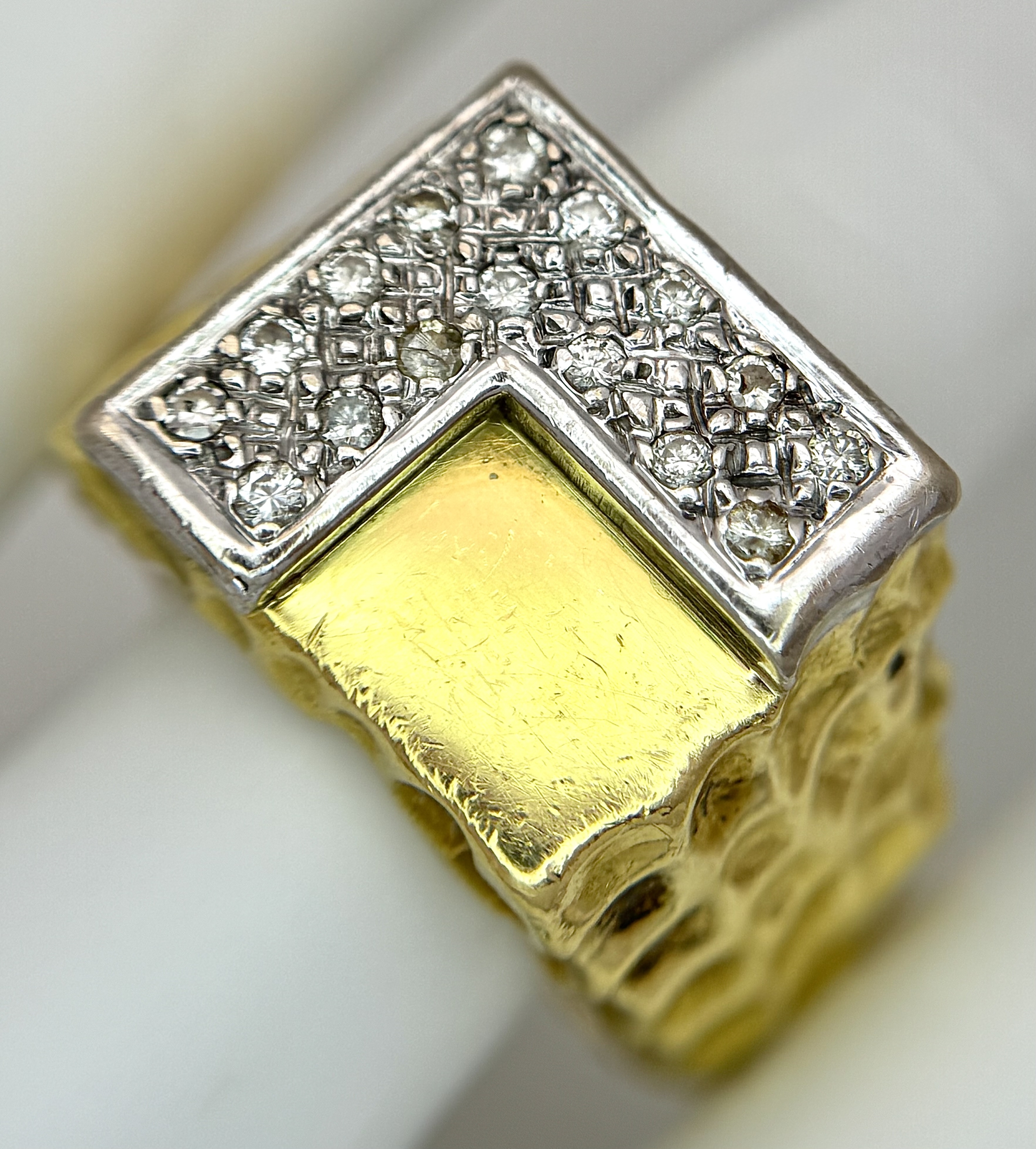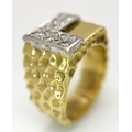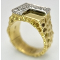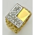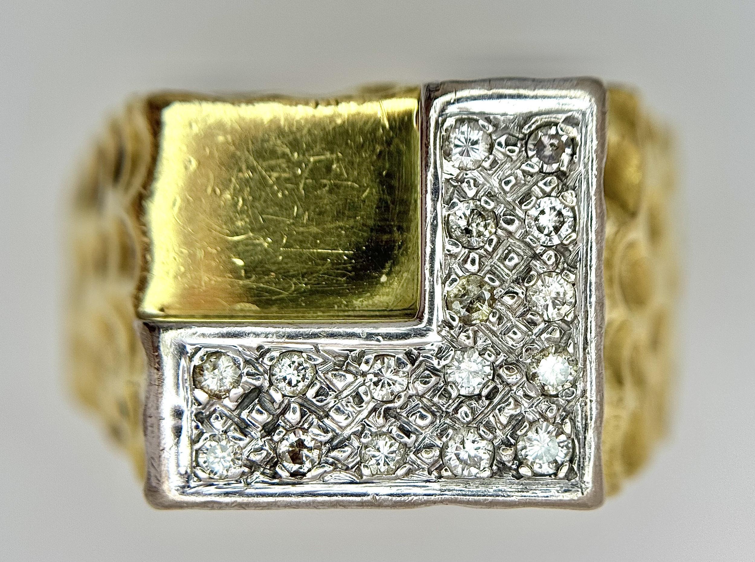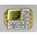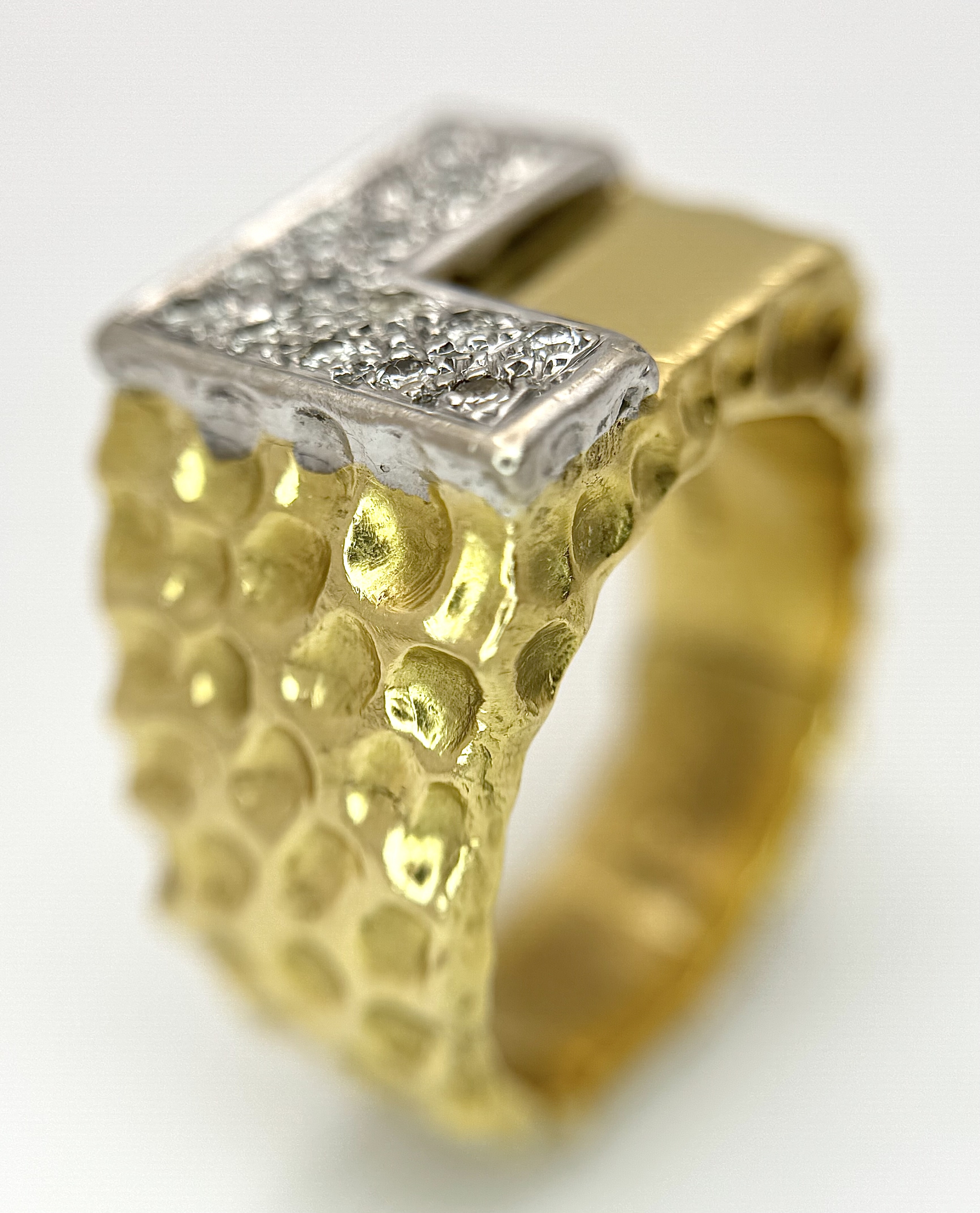 A Statement 18K Yellow Gold and Diamond Gents Signet Ring. Dimple effect band with an 'L' shaped diamond encrusted pave set face. Size X. 34.78g.