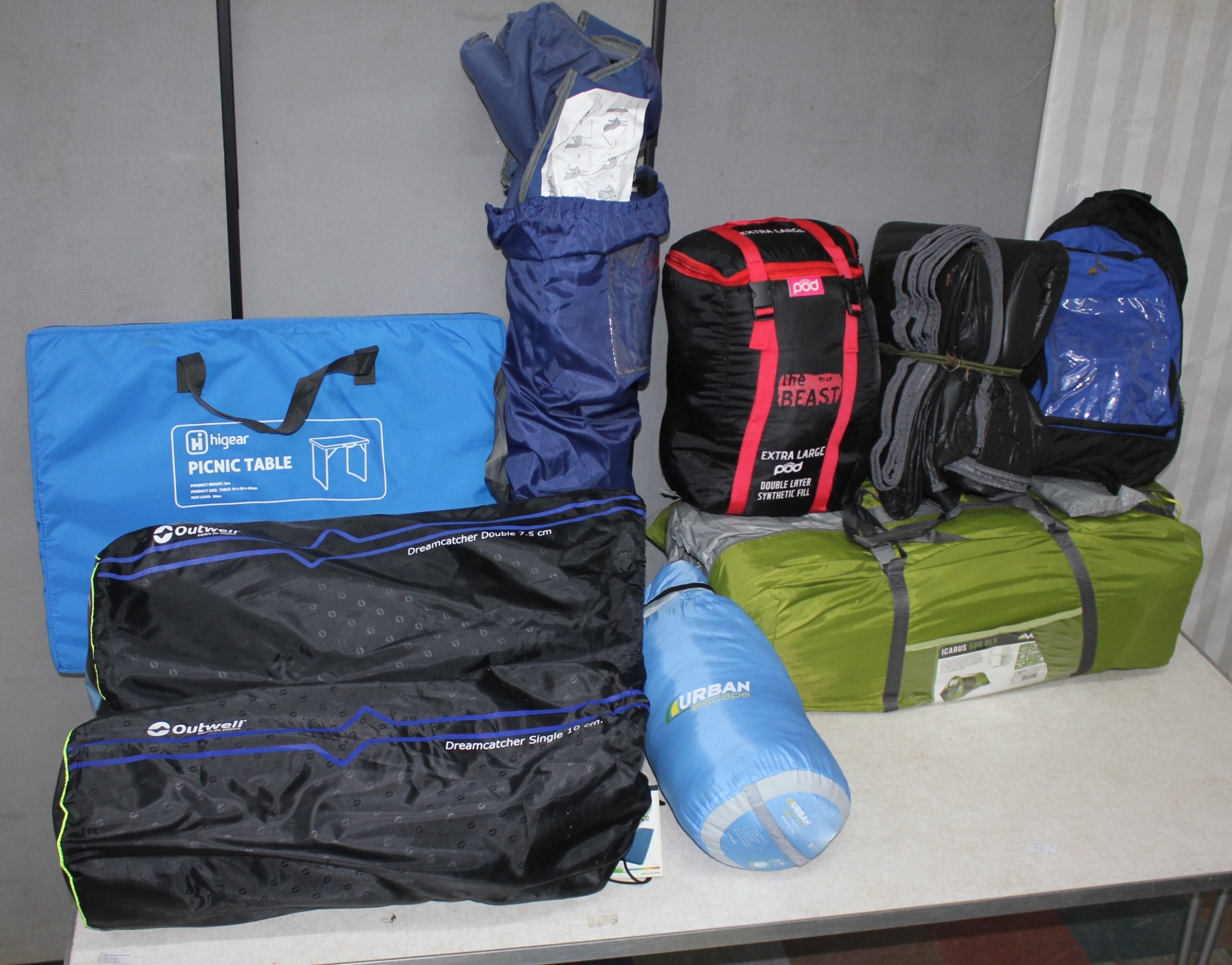 OUTDOOR & CAMPING EQUIPMENT INCLDUING ICARUS 500DLX TENT, 2 OUTWELL DREAMCATCVHER SELF INFLATING MATS, PICNIC TABLE, SLEEPING BAG ETC