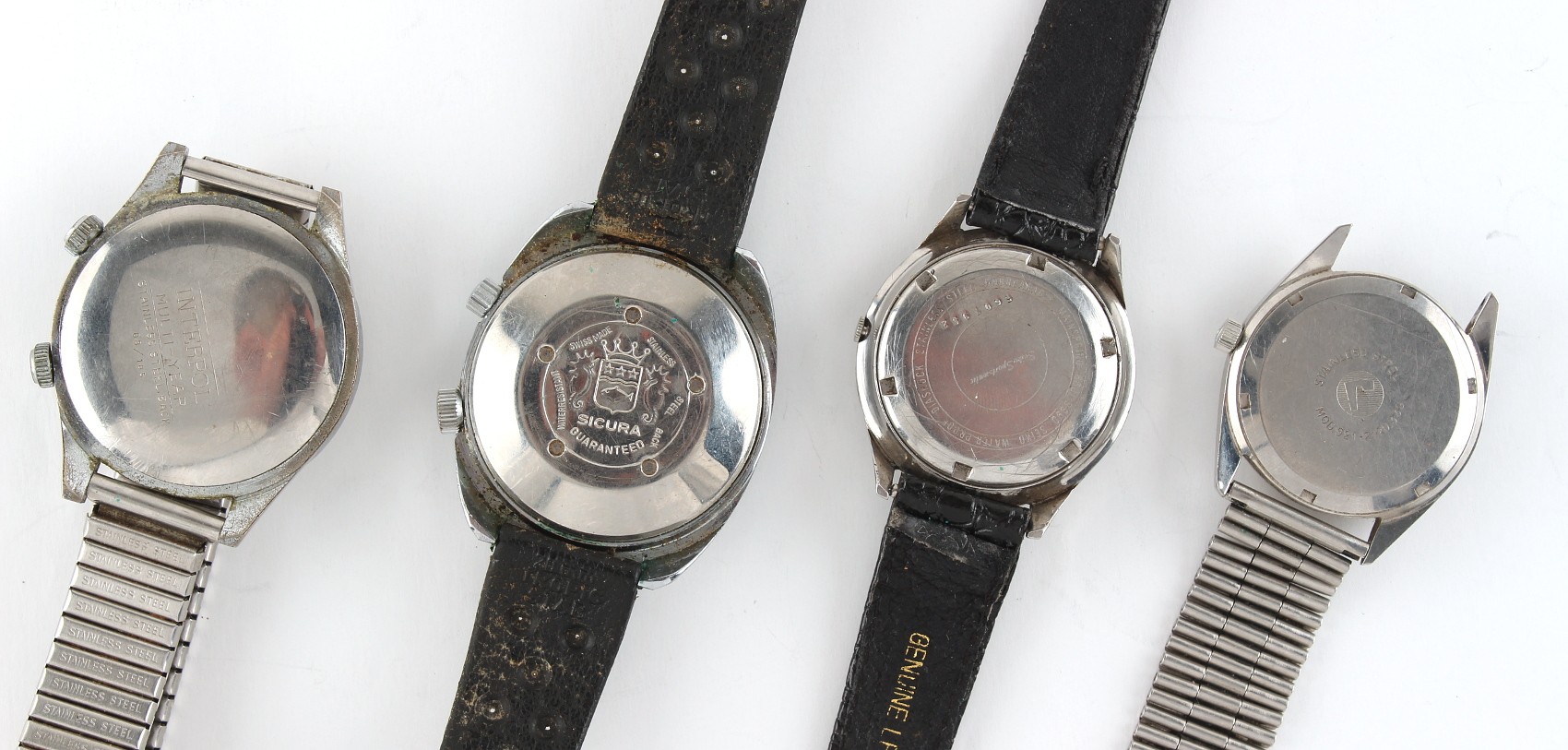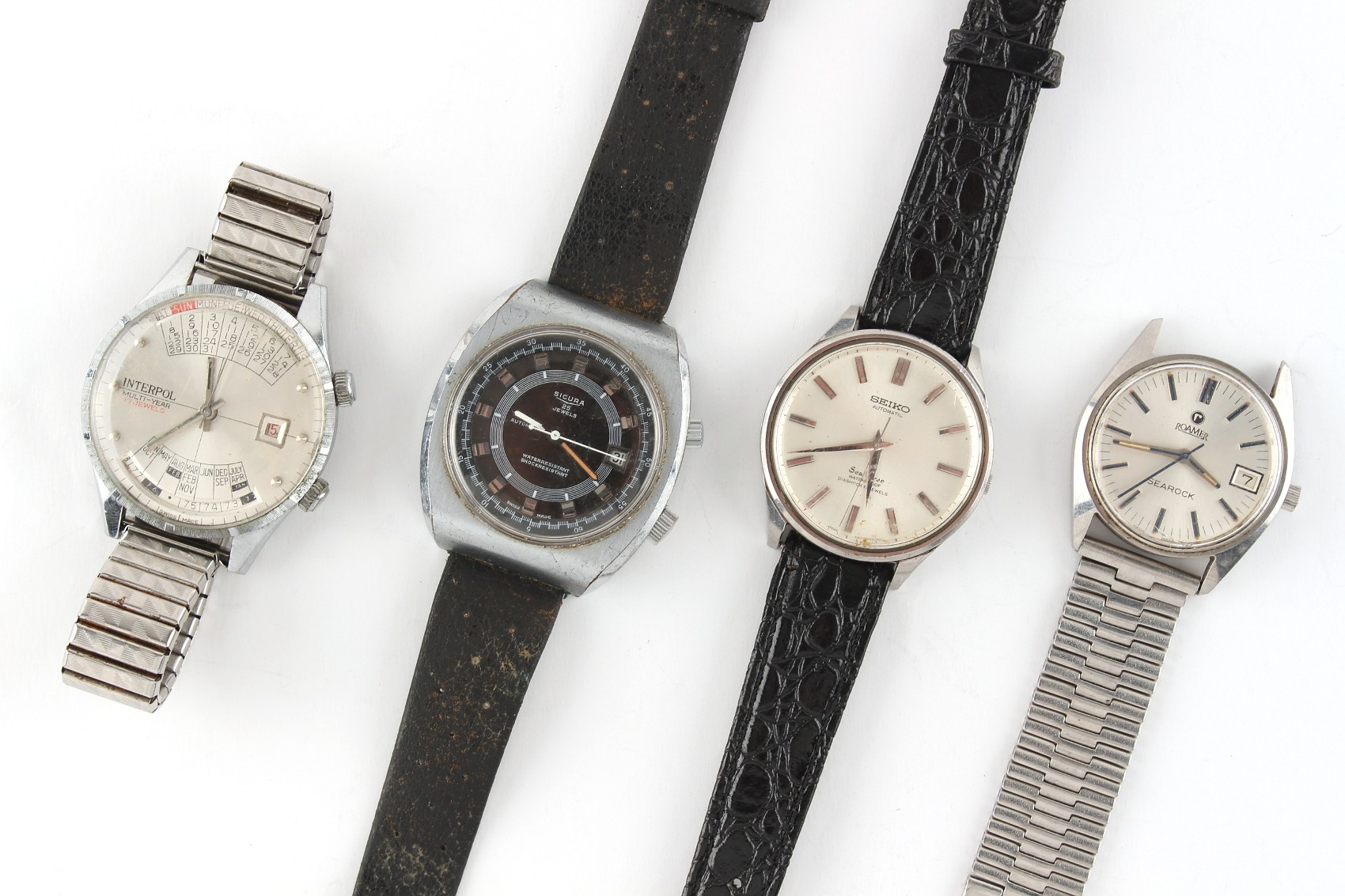 Property of a deceased estate, a private collection of watches - four gentleman's wristwatches, comprising a Roamer Searock stainless steel watch (appears to be working but no guarantees are given), a Sicura automatic 25-jewel watch (appears to be working but no guarantees are given), a Seiko Sea Horse automatic watch (requires attention), and an Interpol Multi-Year watch (requires attention) (4).