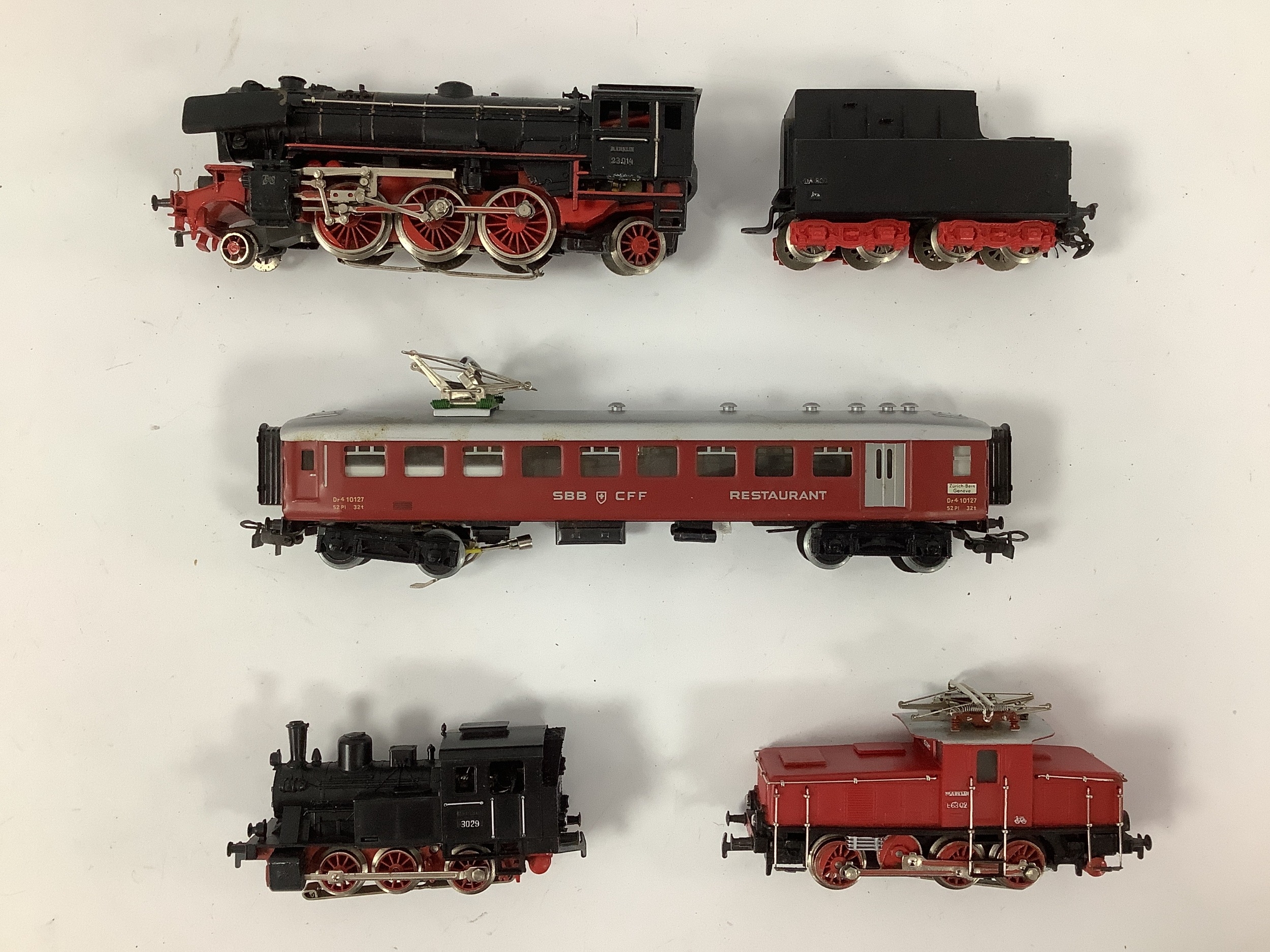 Three Marklin HO scale stud-contact locomotives: a 2-6-2 and tender; an 0-6-0 tank engine; and an 0-6-0 jackshaft drive electric shunter; with a Swiss restaurant car with overhead pick-up; all untested and playworn.