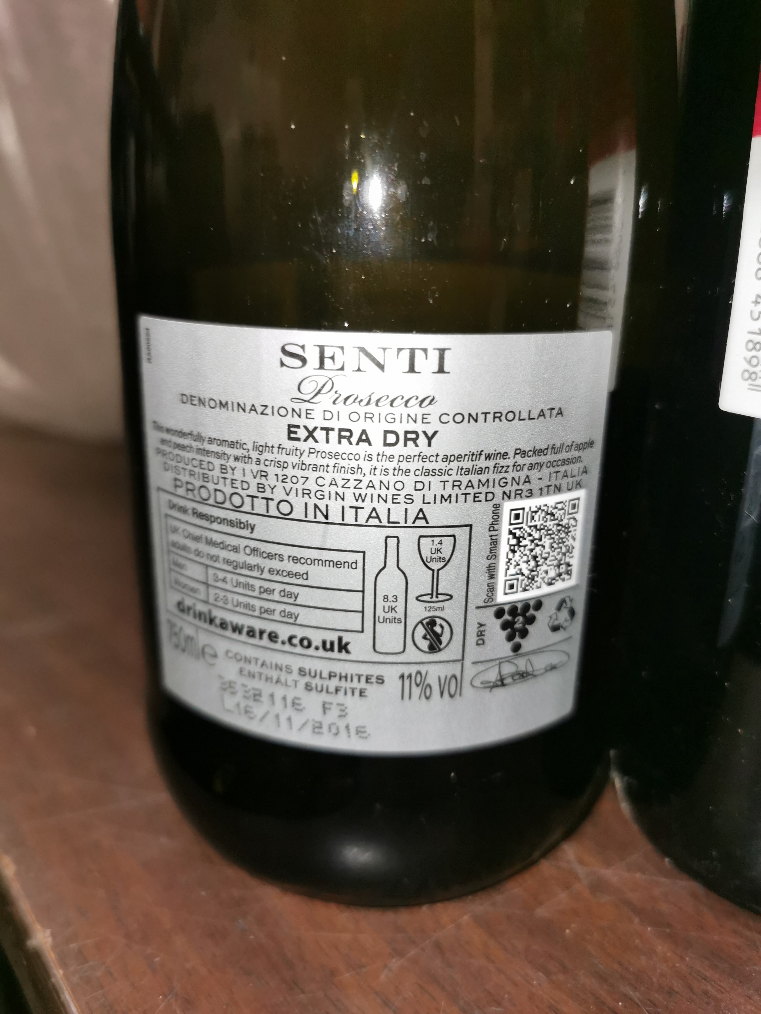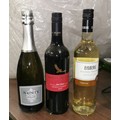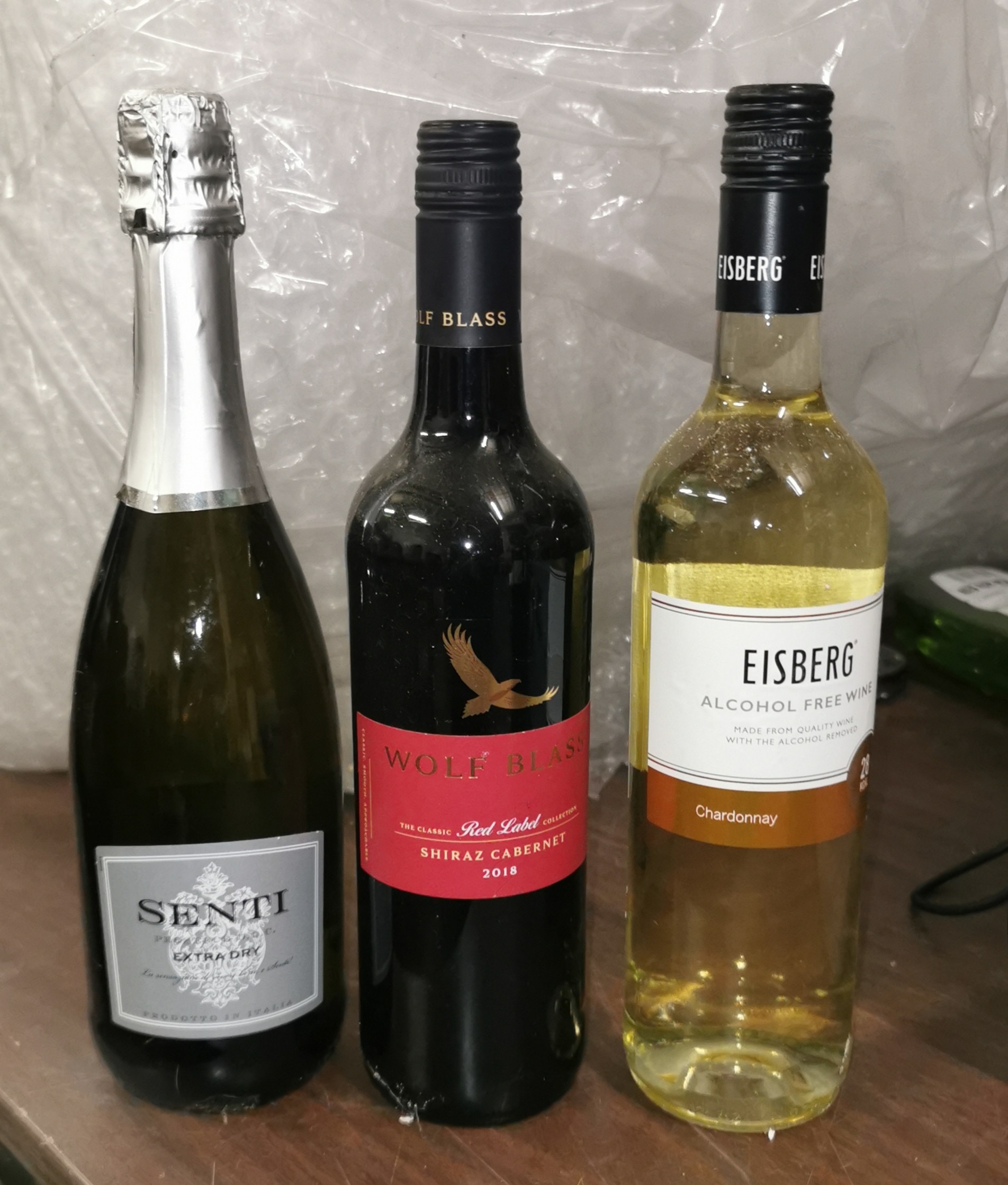 3 x unopened 750 ml bottles being Senti prosecco extra dry, 2018 Wolf Blass shiraz cabernet & Eisberg alcohol free chardonnay