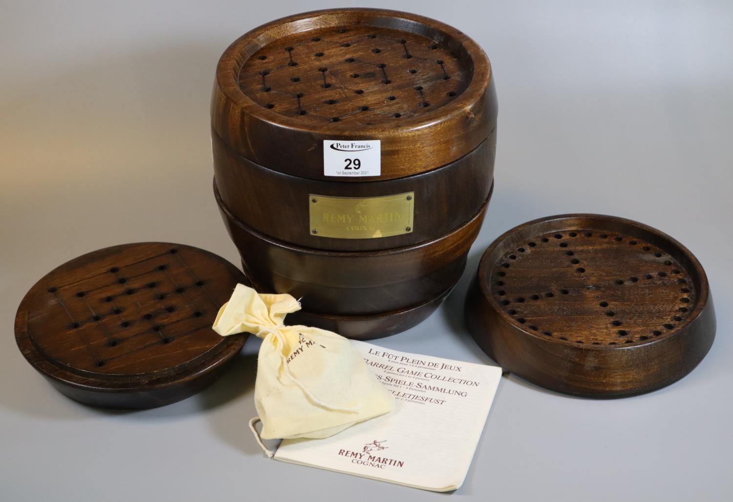 Remy Martin barrel game collection Game's Compendium with instructions and fabric bag containing dice, pegs etc.