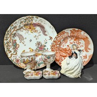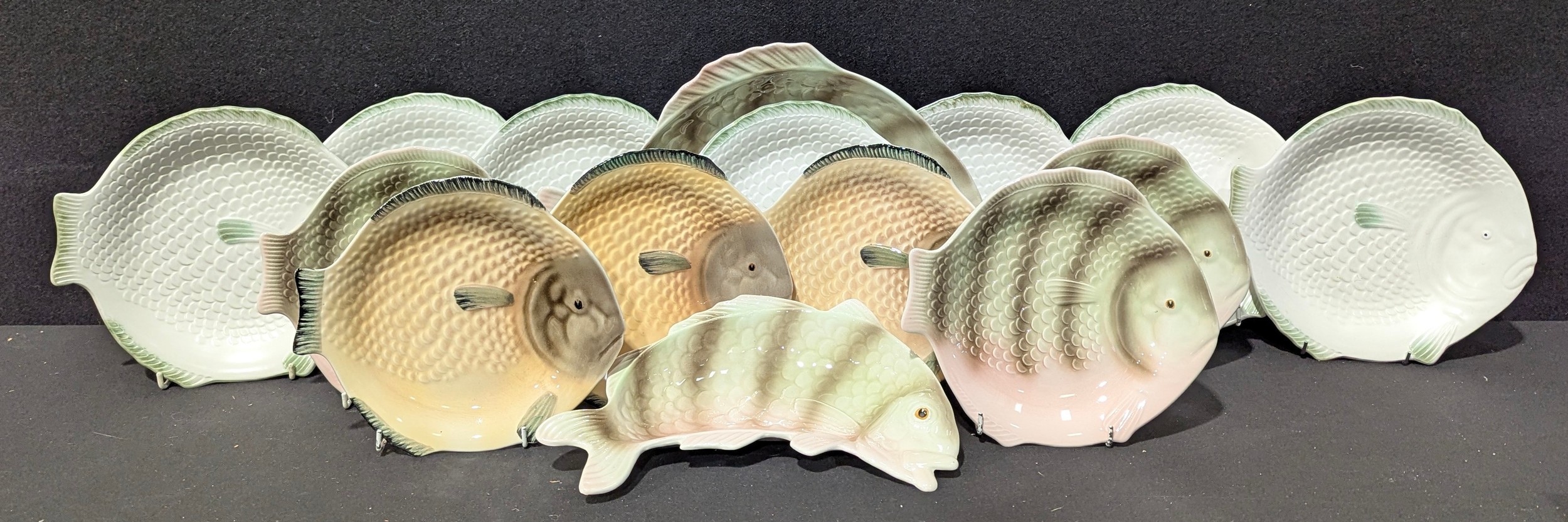 A Shorter & Sons composed fish service for six, comprising large fish shaped serving platter, crescent shaped salad dish and six fish shaped plates; another set of seven plates (15)