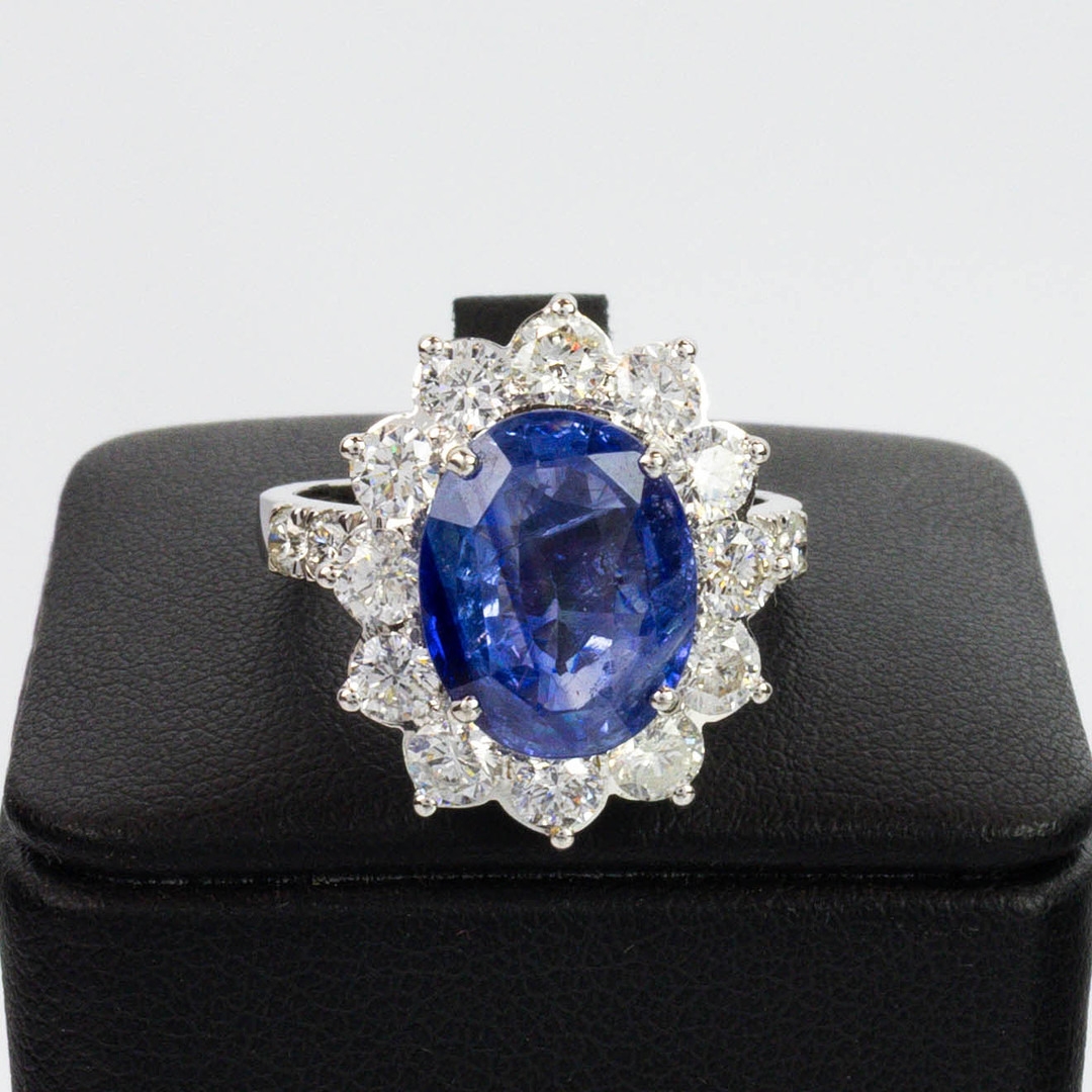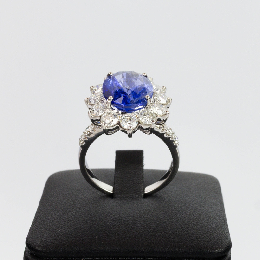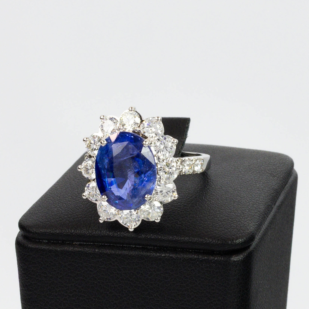 AN 18CT WHITE GOLD SAPPHIRE AND DIAMOND CLUSTER RING. the oval sapphire surrounded by round brilliant cut diamonds, with diamond shoulders, Sapphire 5.73ct. Diamonds 1.91ct, complete with box.