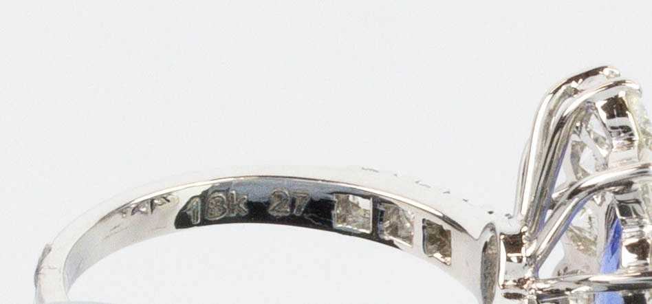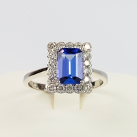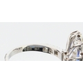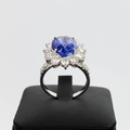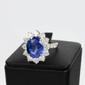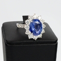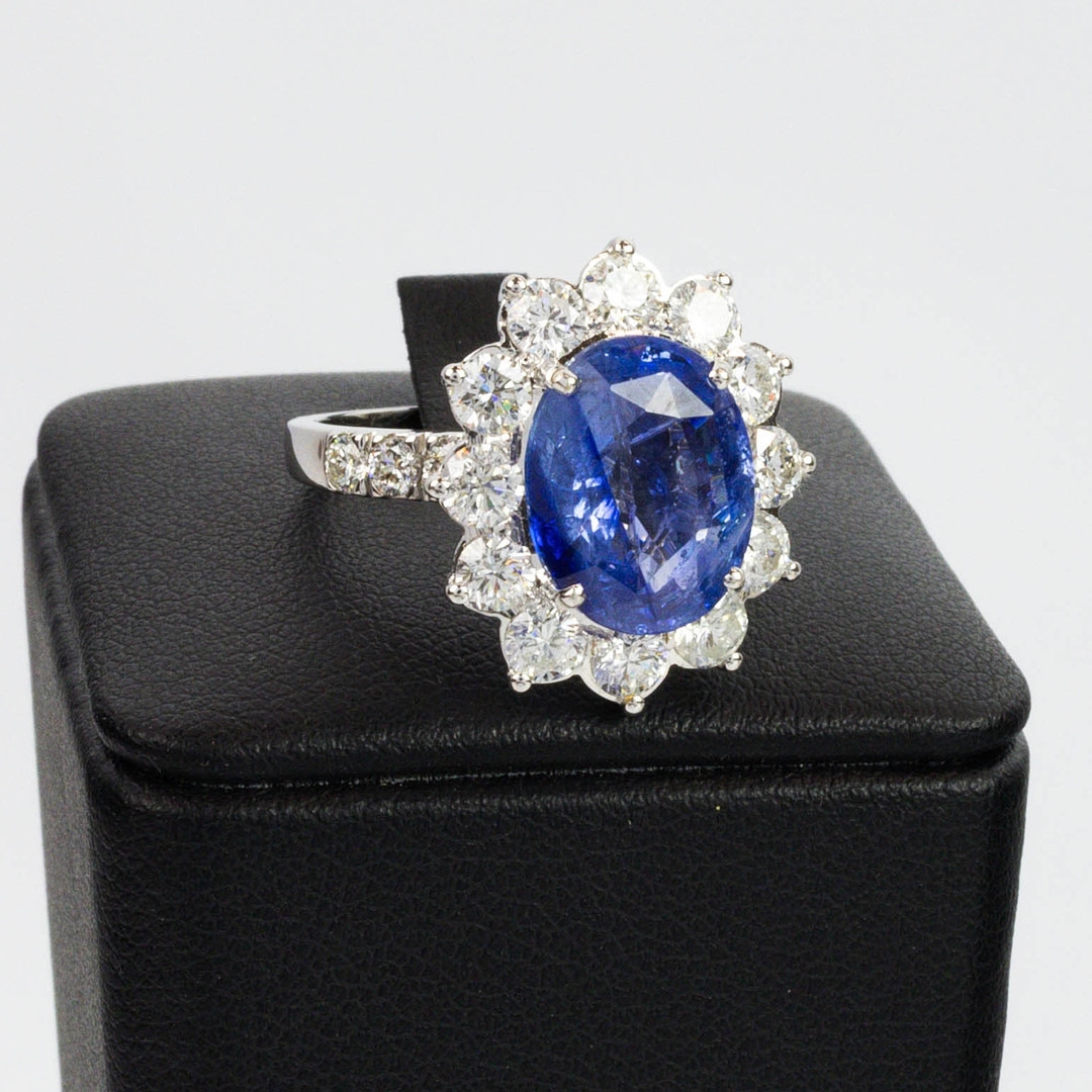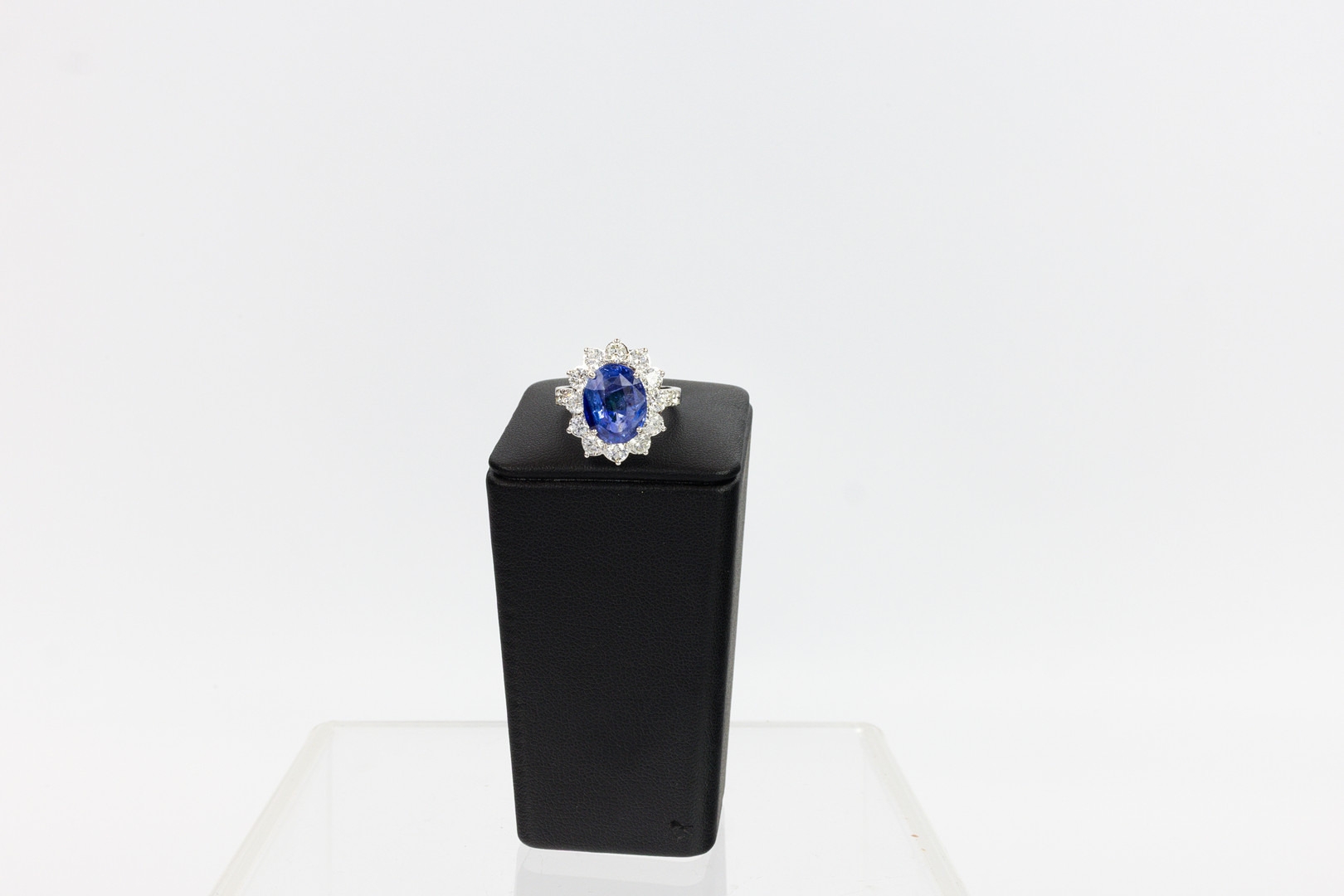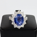 AN 18CT WHITE GOLD SAPPHIRE AND DIAMOND CLUSTER RING. the oval sapphire surrounded by round brilliant cut diamonds, with diamond shoulders, Sapphire 5.73ct. Diamonds 1.91ct, complete with box.