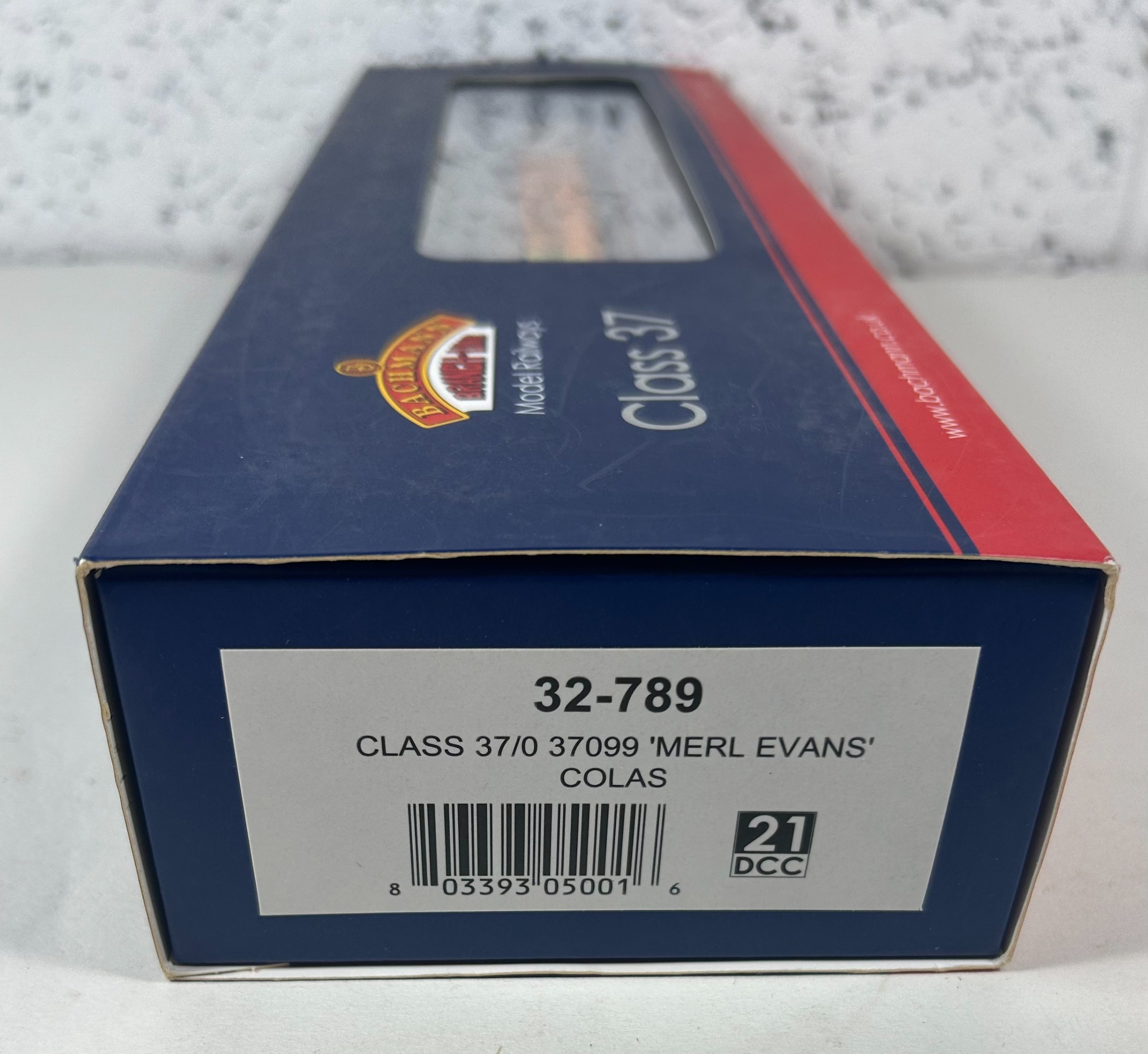 Bachmann Branch-Line OO Diesel-Electric Locomotive. Class 37 37099 'Merl Evans' (32-789), 21DCC. In Colas livery. Boxed. Contents looks to be as new.