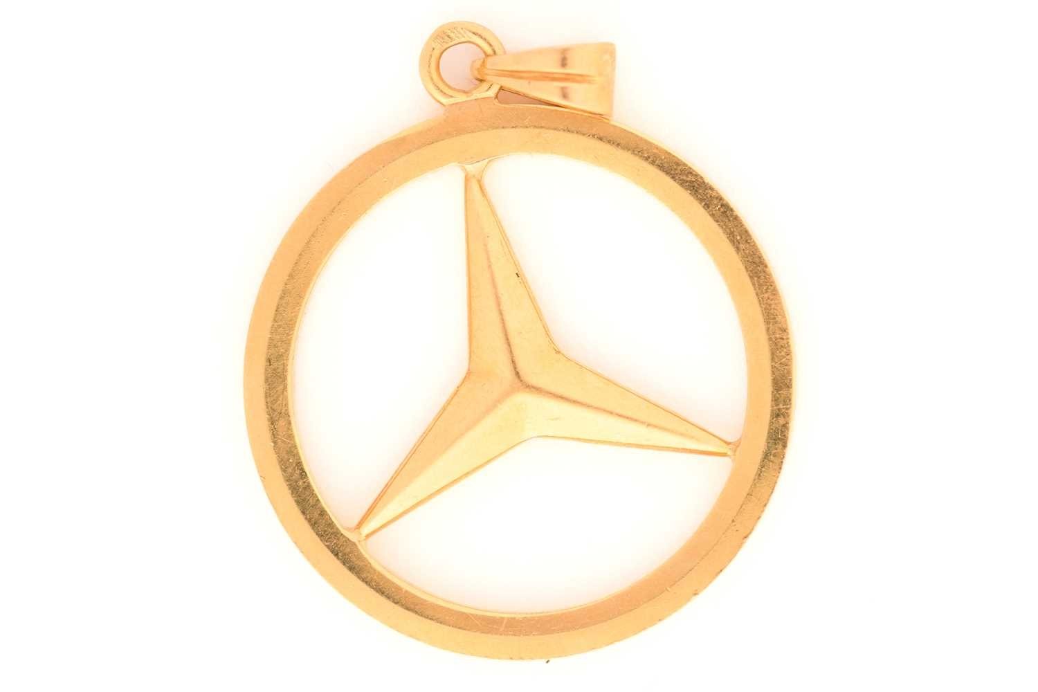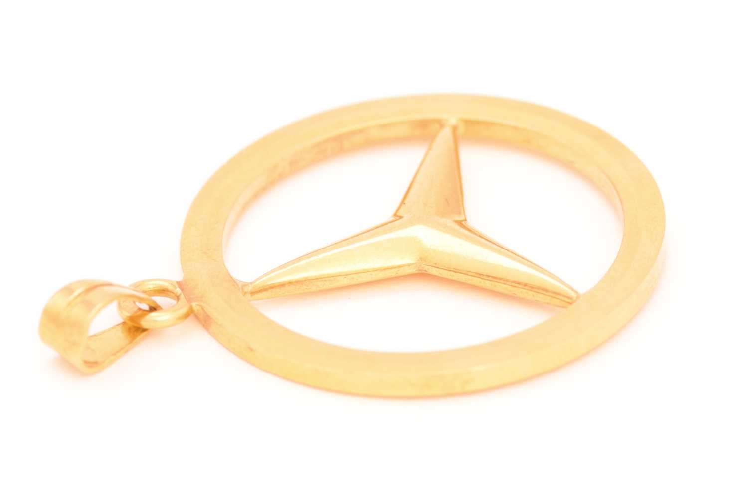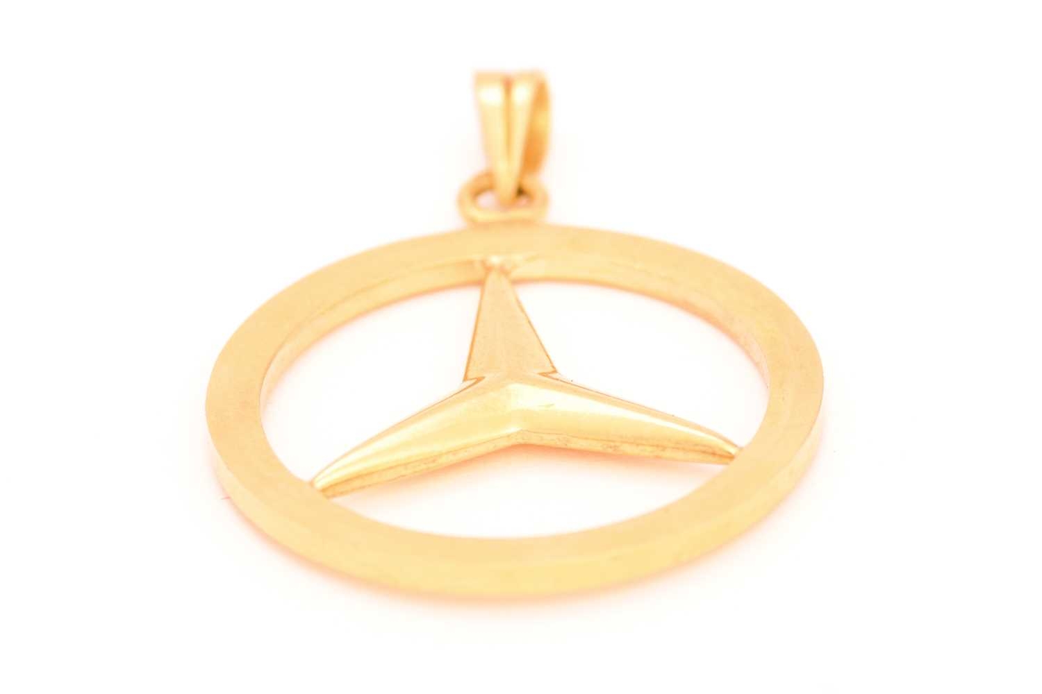 A Mercedes-Benz logo pendant, featuring the iconic three-point star in a ring, attached to a plain bail, Arabic hallmark '18', overall measures 2.5 cm across, total weight of item 6.1 grams.