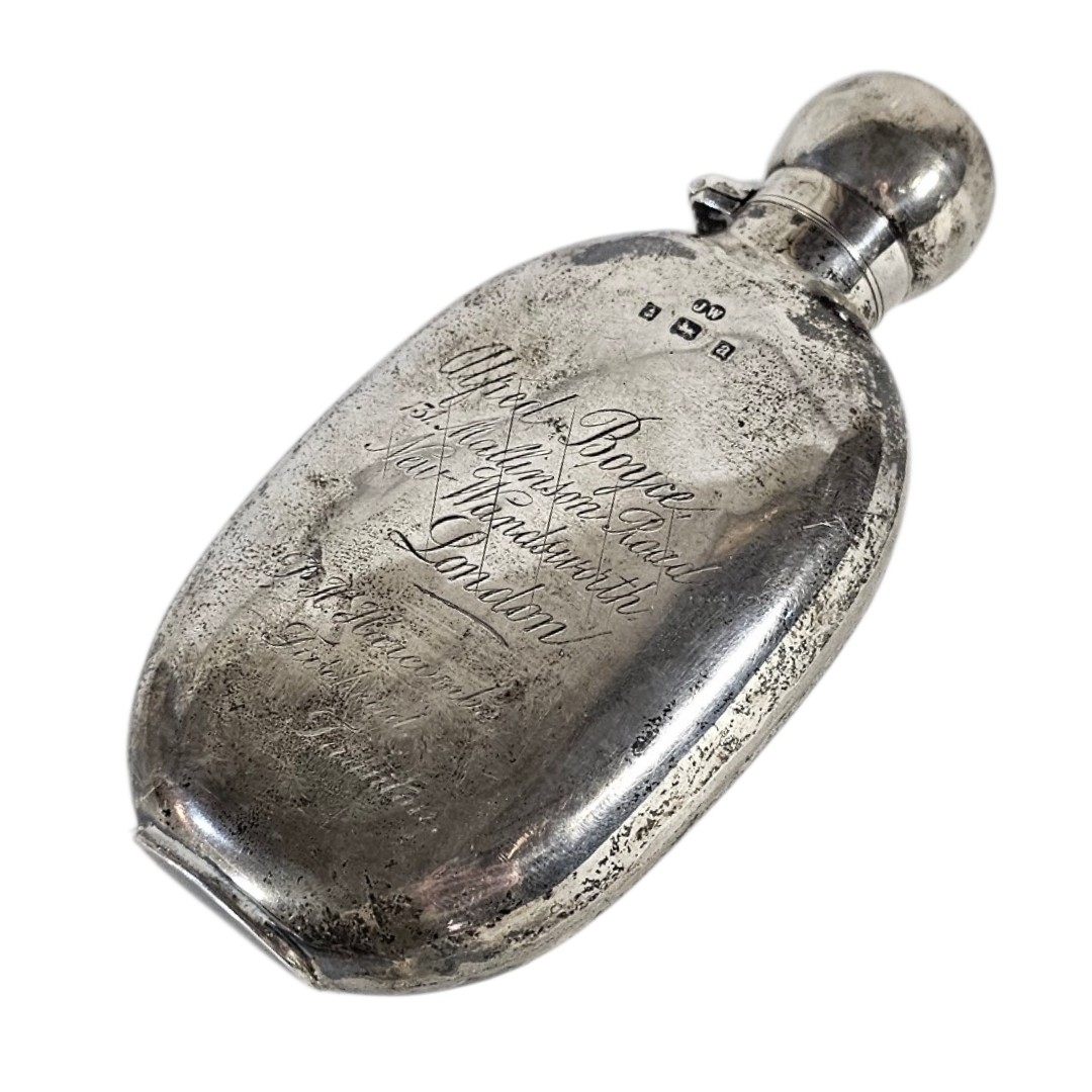 Having a screw cap and engraved inscription ‘Alfred Boyce New Wandsworth London’, hallmarked Birmingham, 1900.