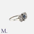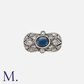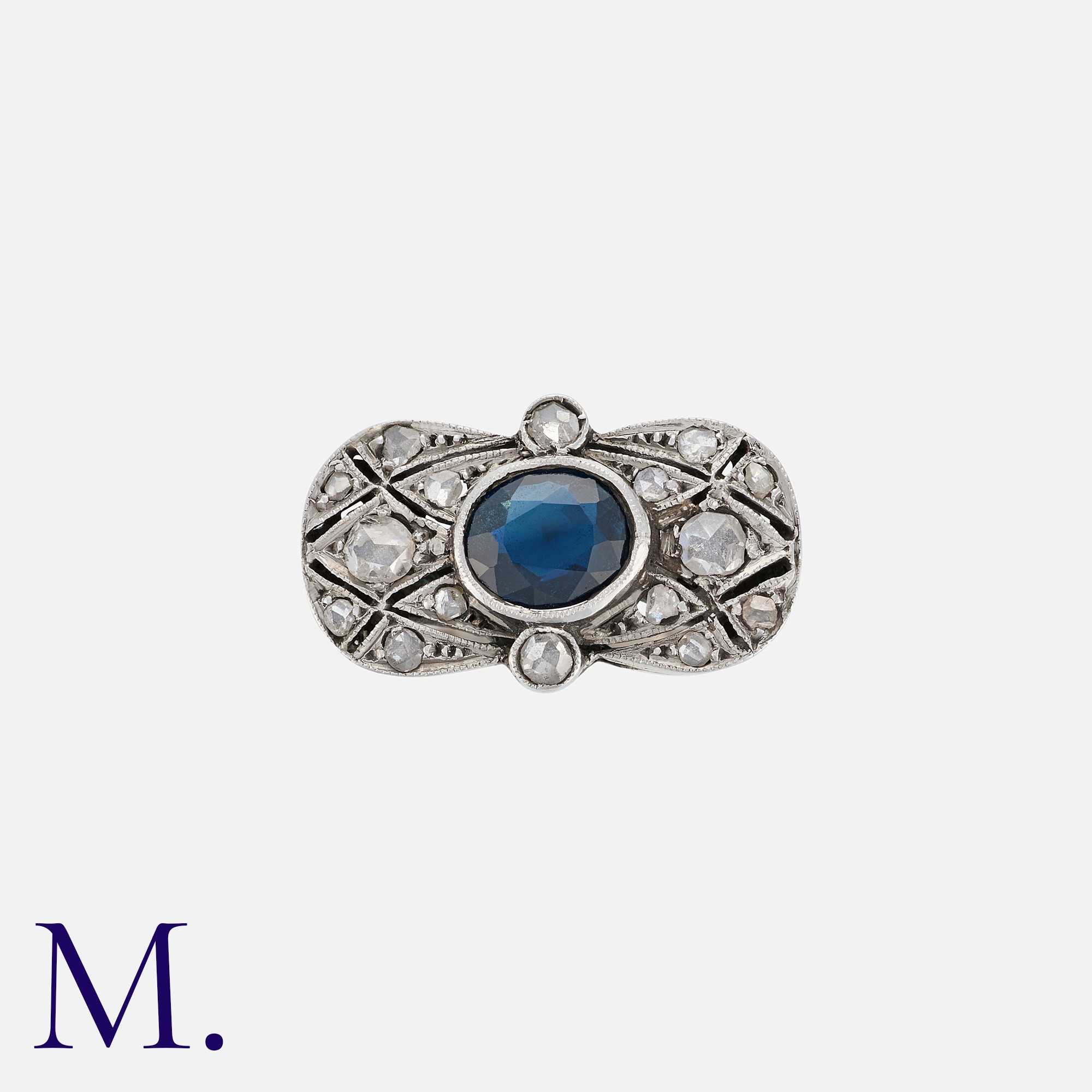 NO RESERVE. A Sapphire and Diamond Ring set in the centre of a plaque with an oval cut sapphire measuring approx. 6x5mm
