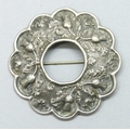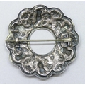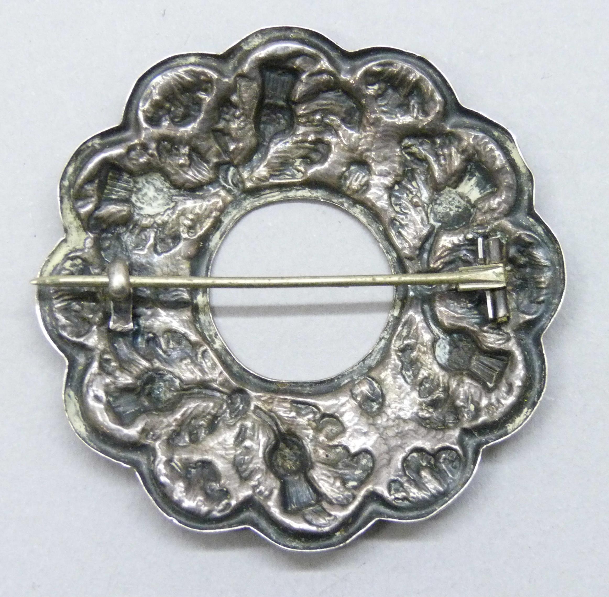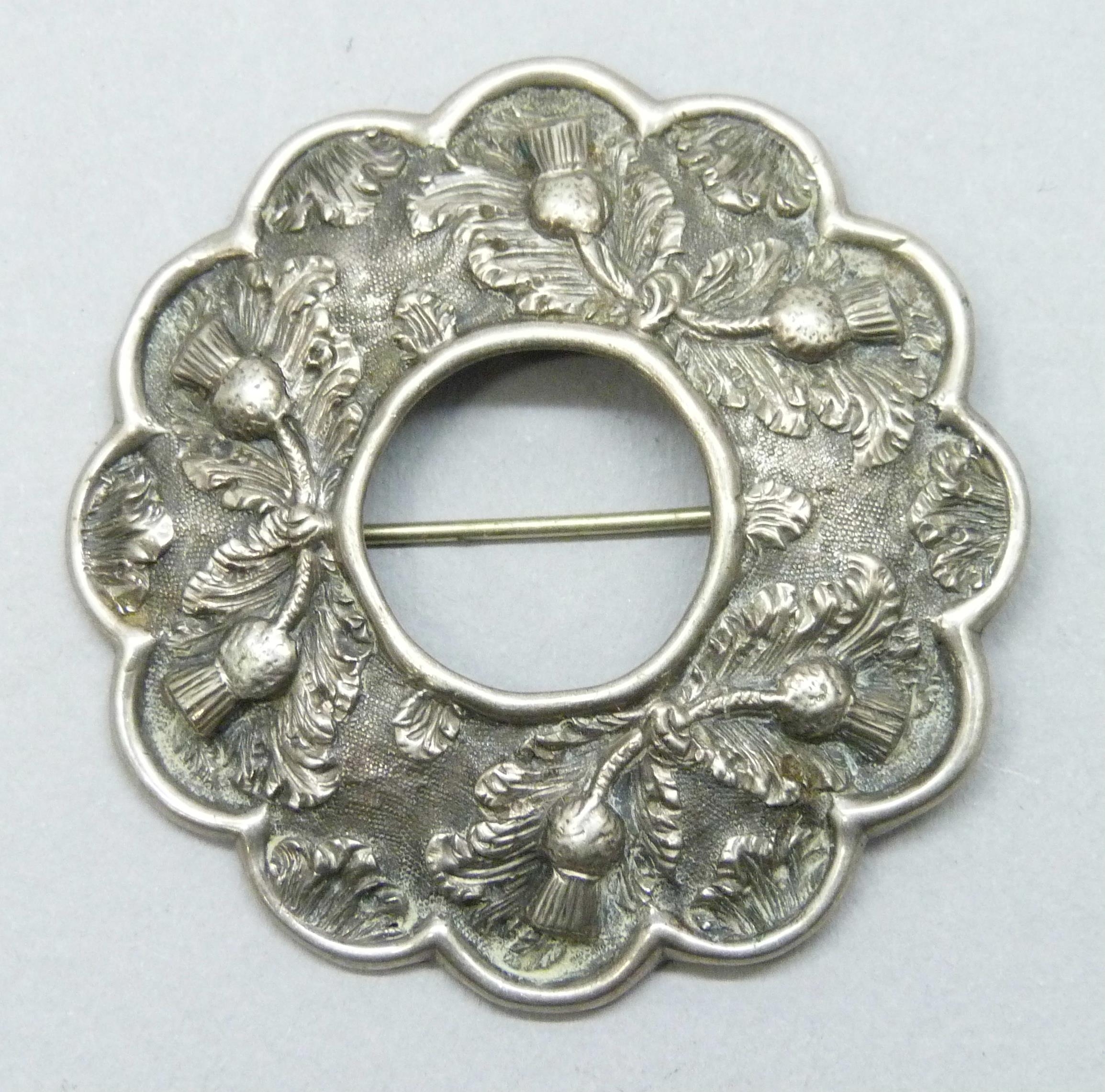 A large Victorian Scottish white metal brooch with embossed thistle design, tests as silver, 5.2cm