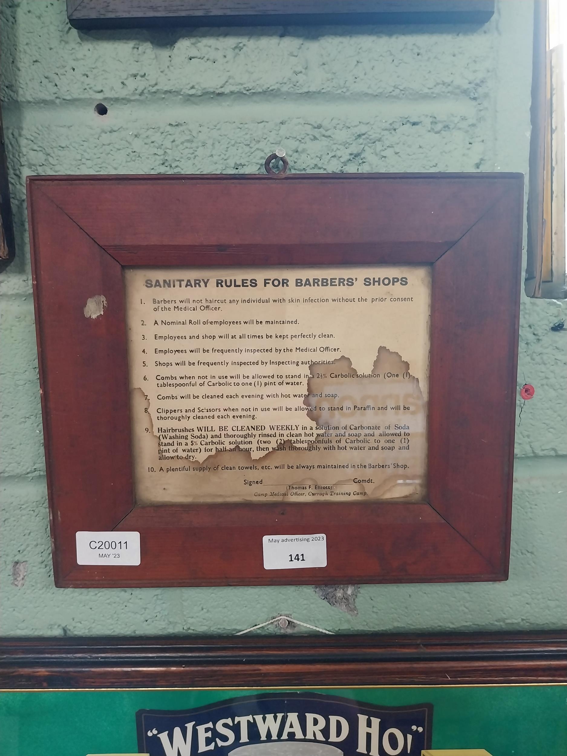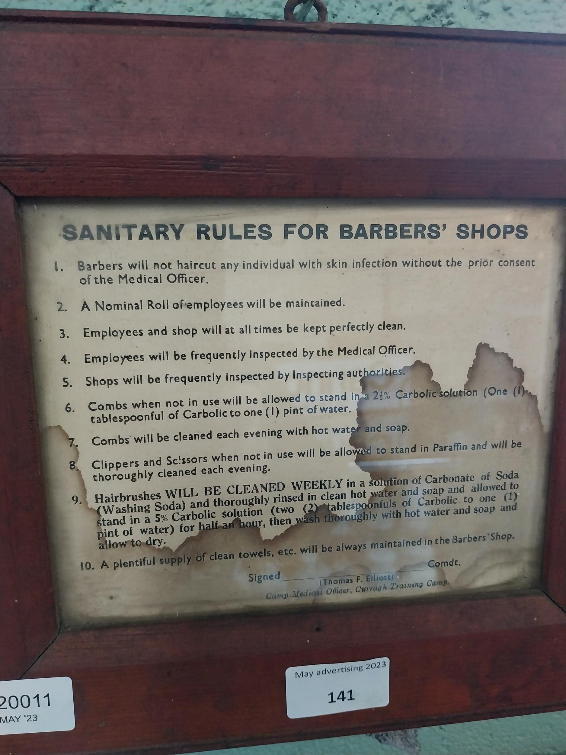 Sanitary Rules for Barber Shops framed advertising print. {24 cm H x 27 cm W}.