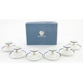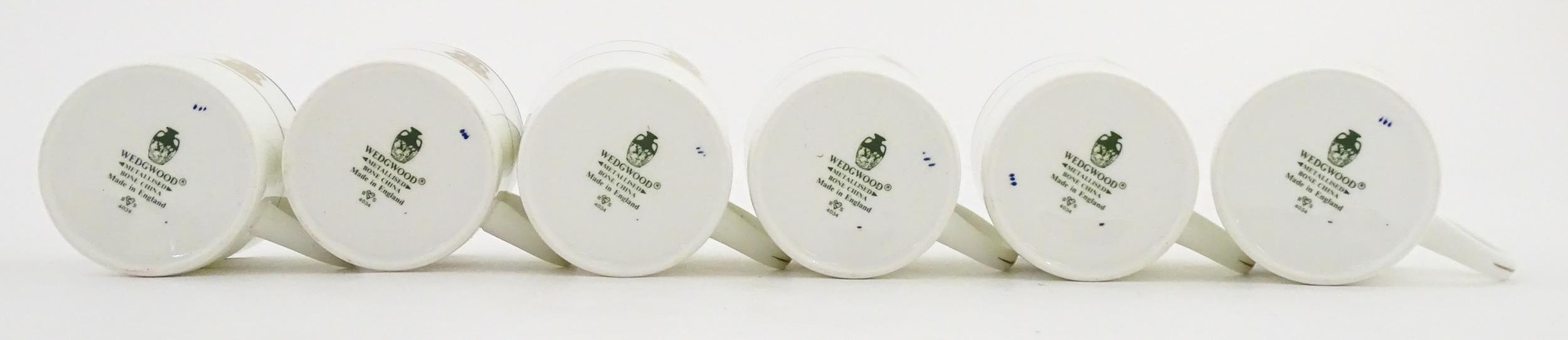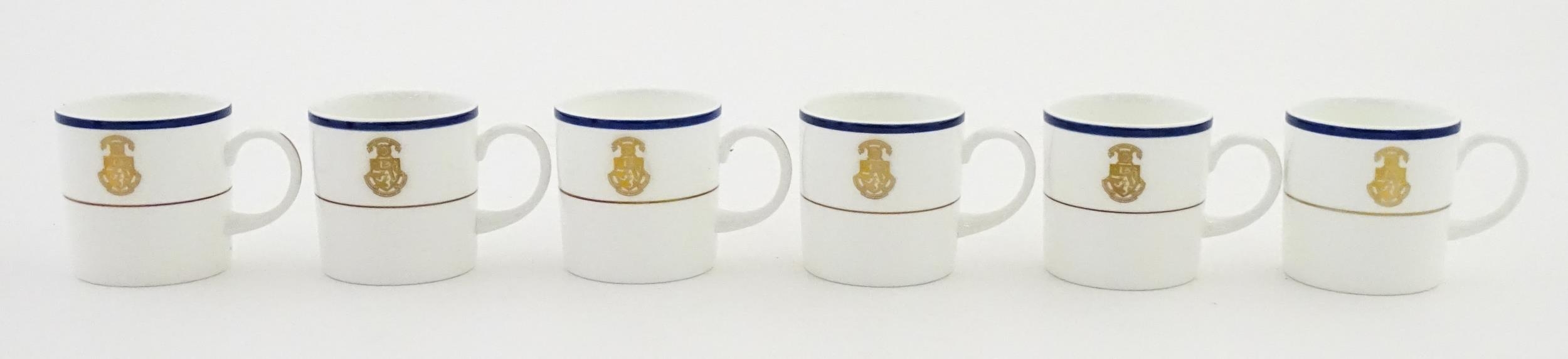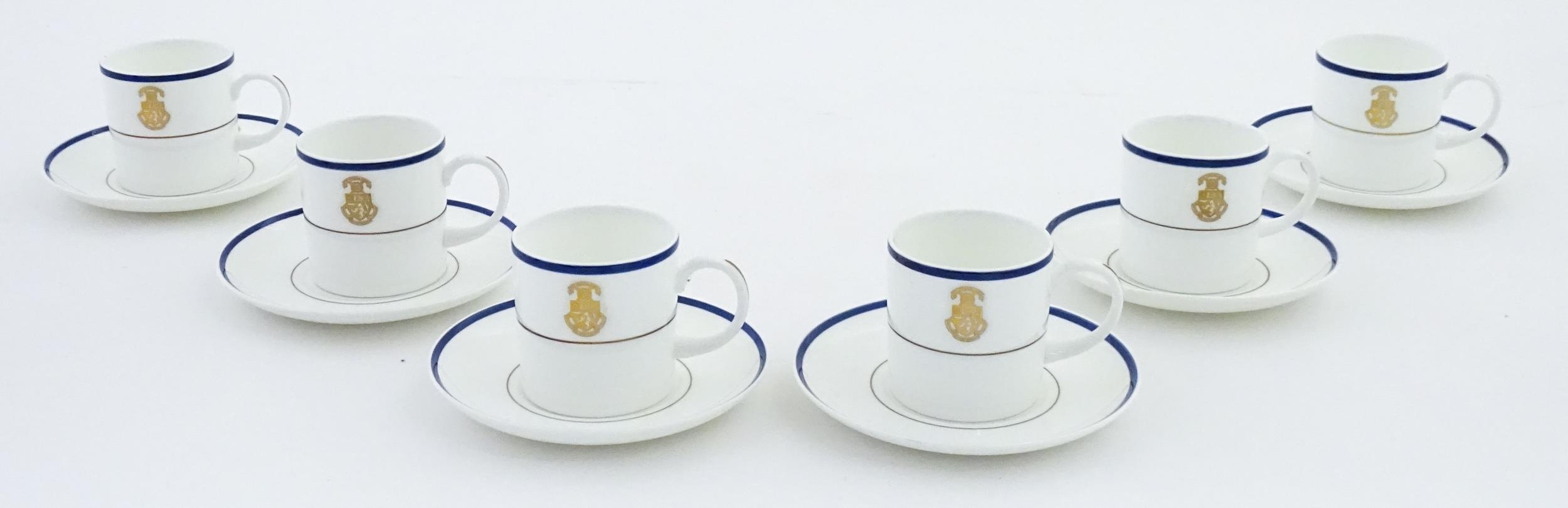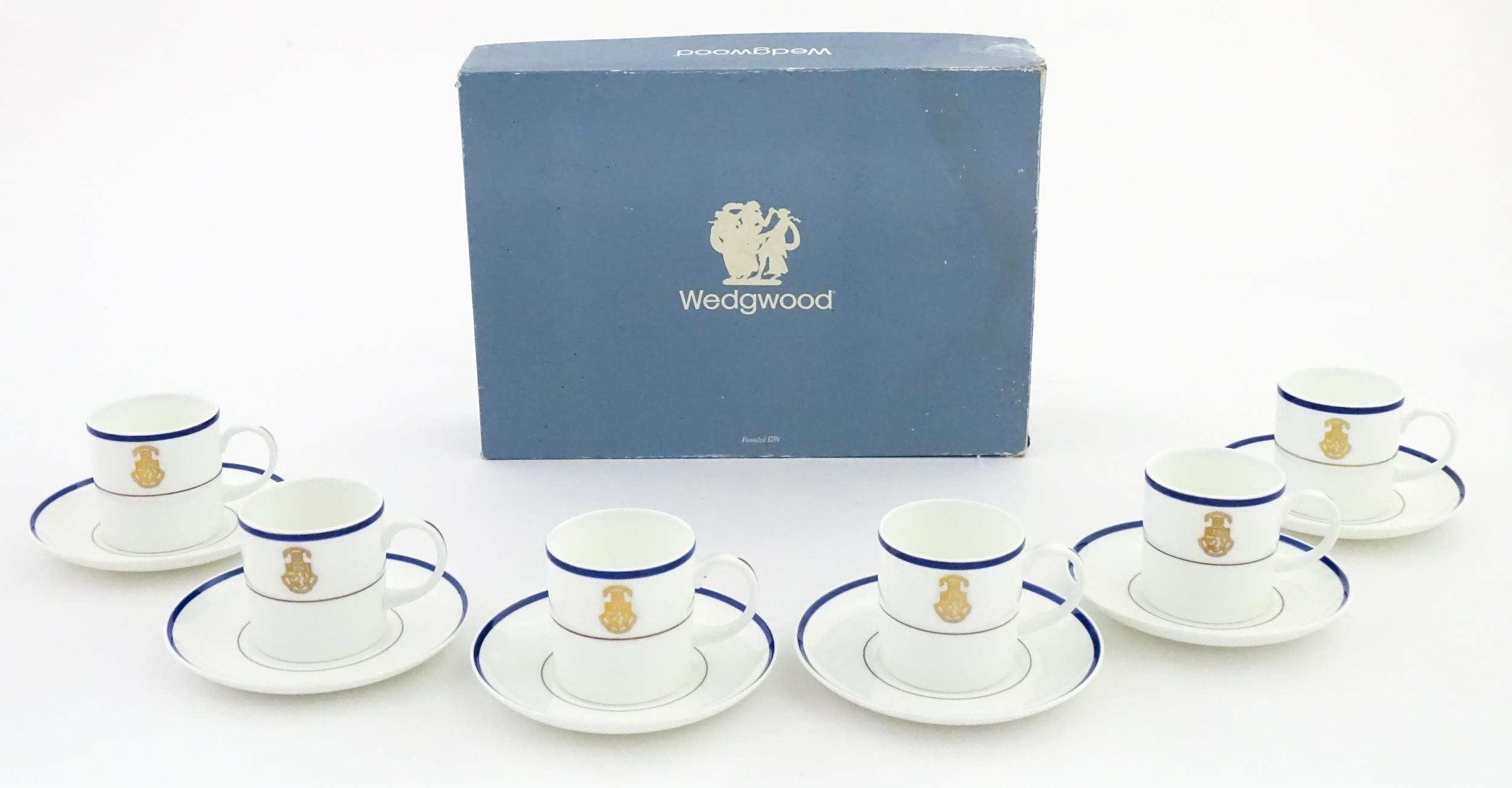 A set of six Wedgwood coffee cups and saucers with gilt Harrow School crest detail. Box approx. 12 3/4" wide
