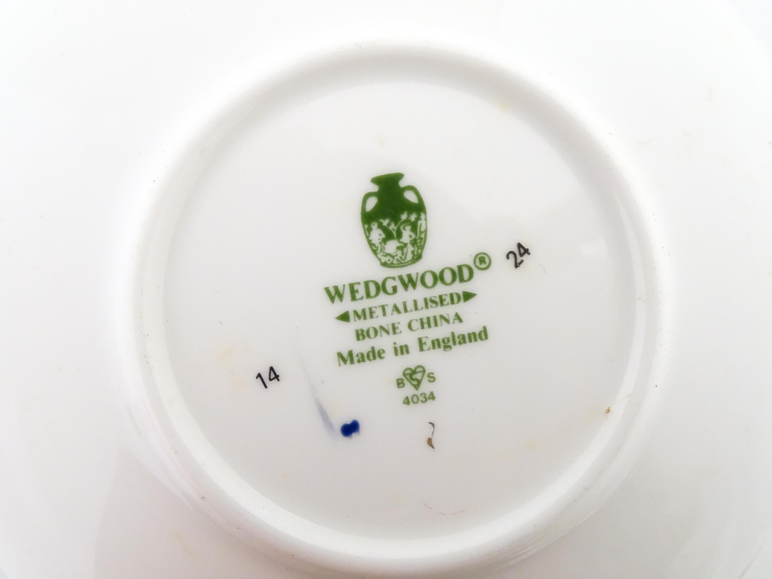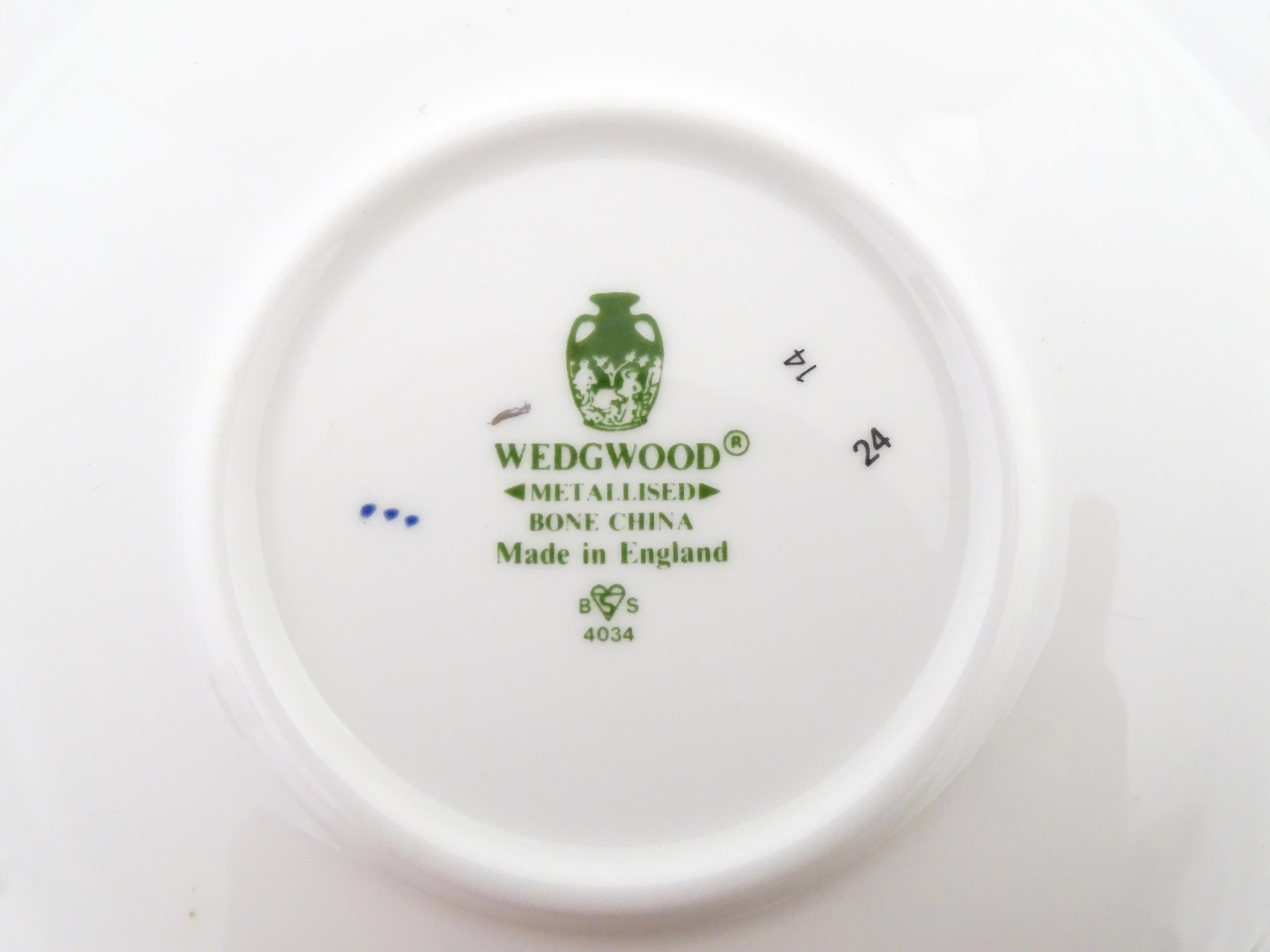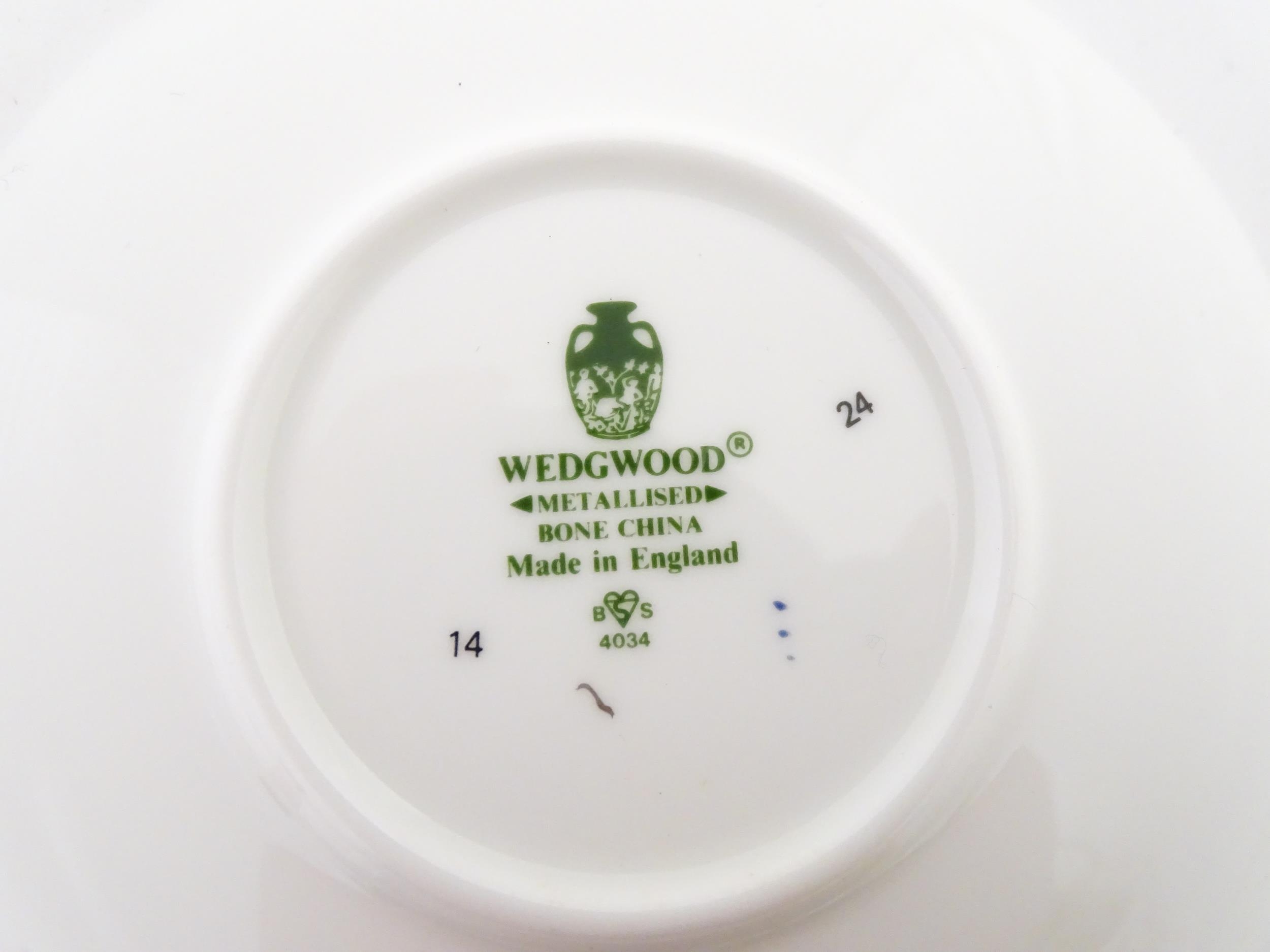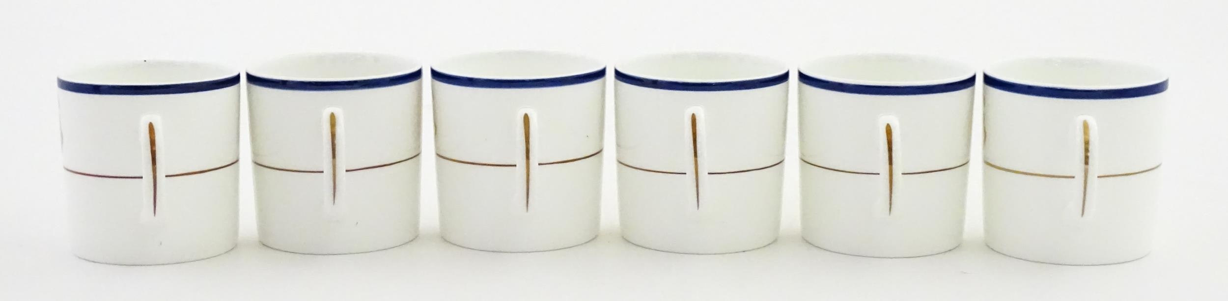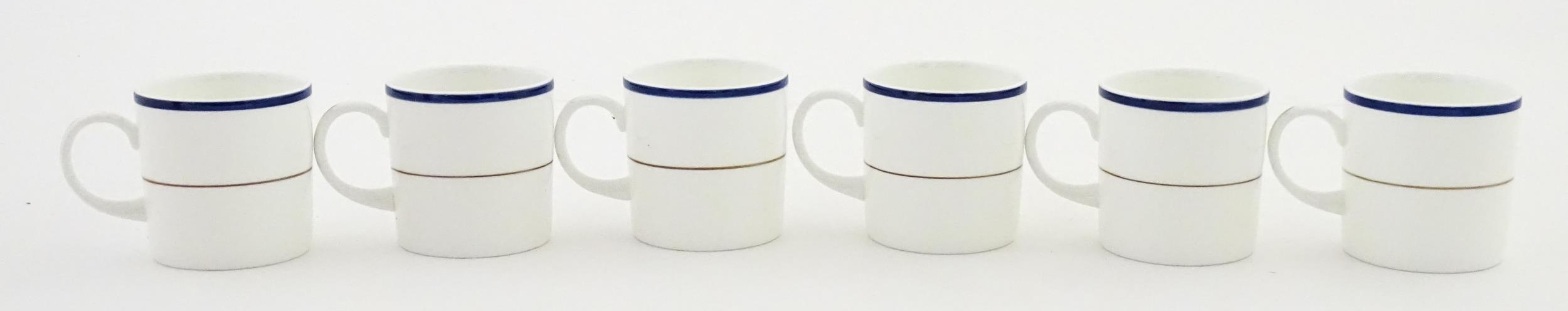 A set of six Wedgwood coffee cups and saucers with gilt Harrow School crest detail. Box approx. 12 3/4" wide