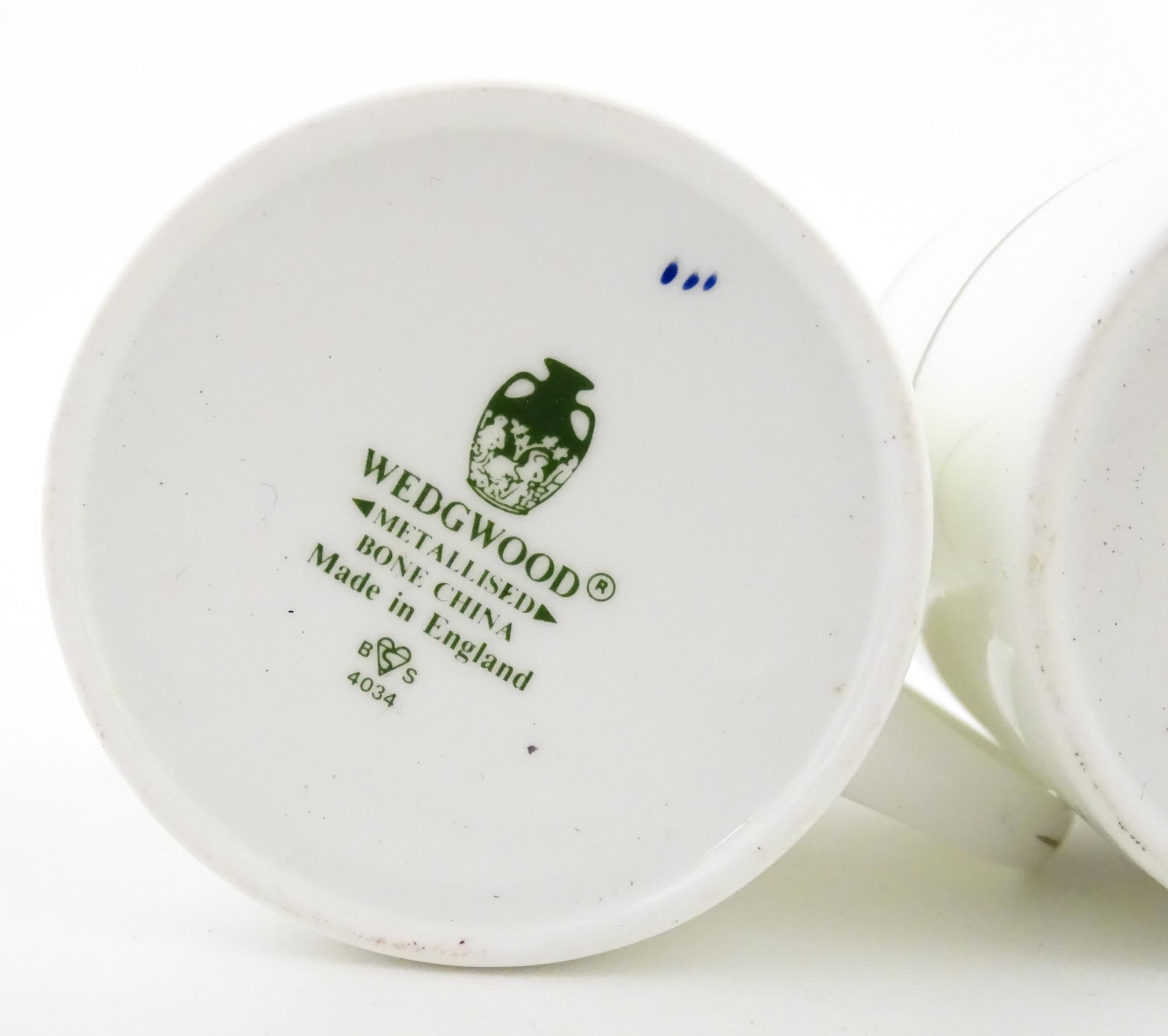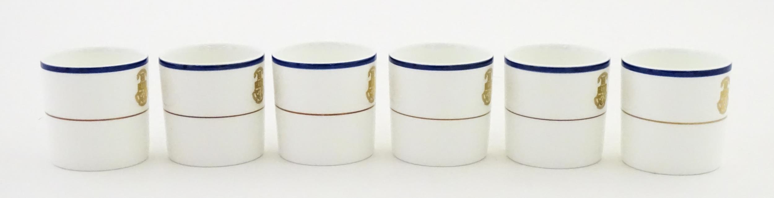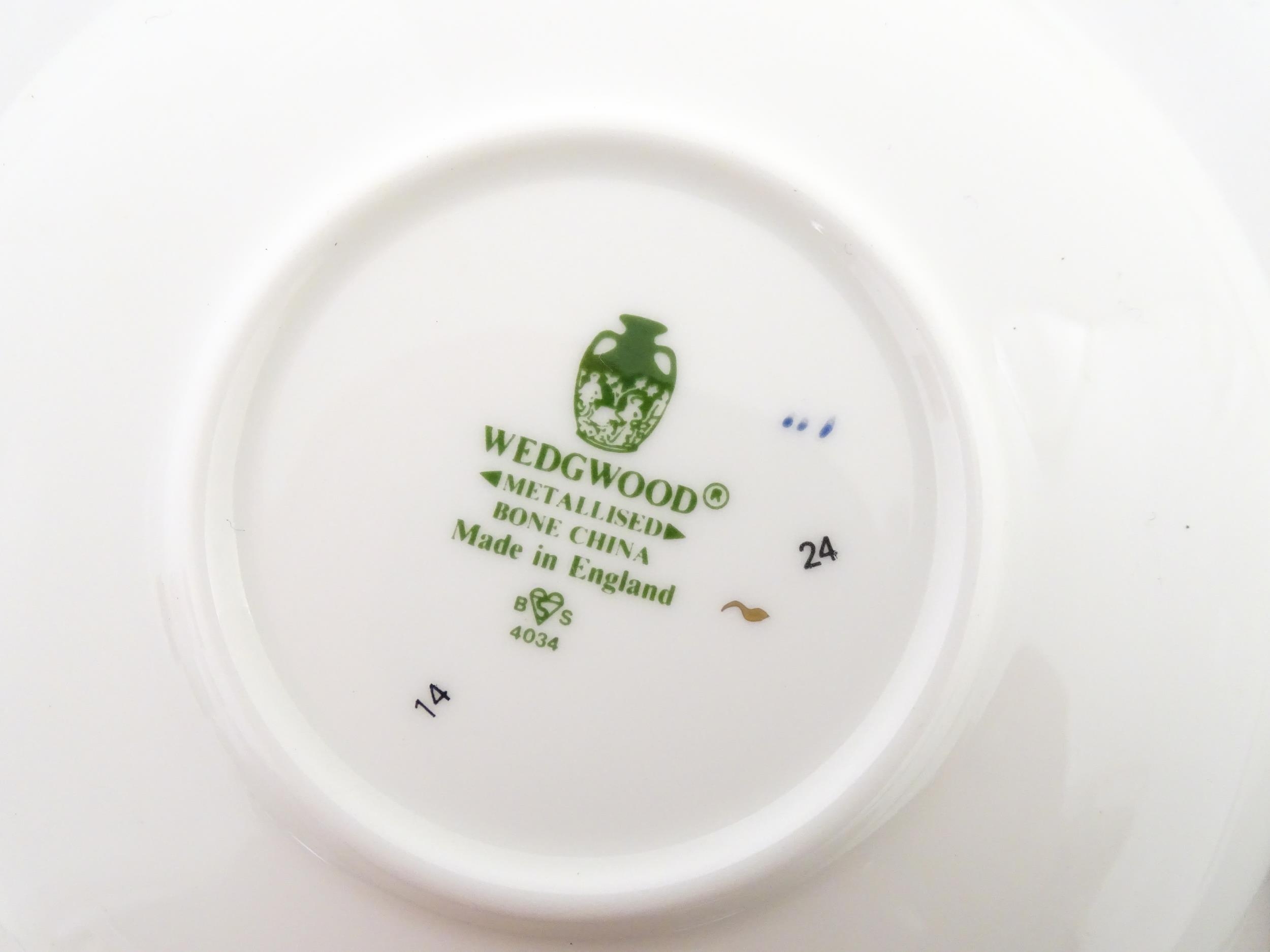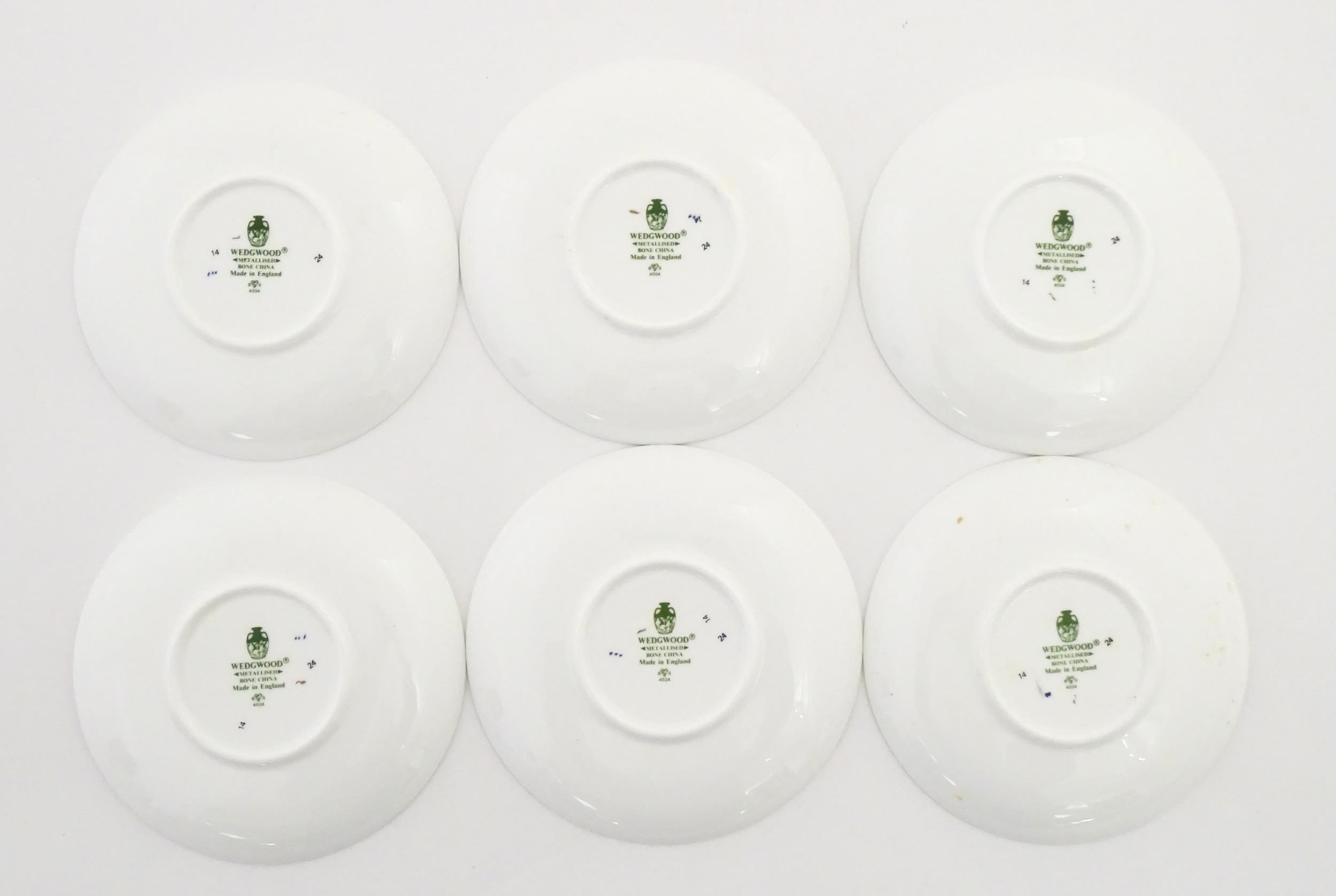 A set of six Wedgwood coffee cups and saucers with gilt Harrow School crest detail. Box approx. 12 3/4" wide