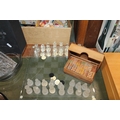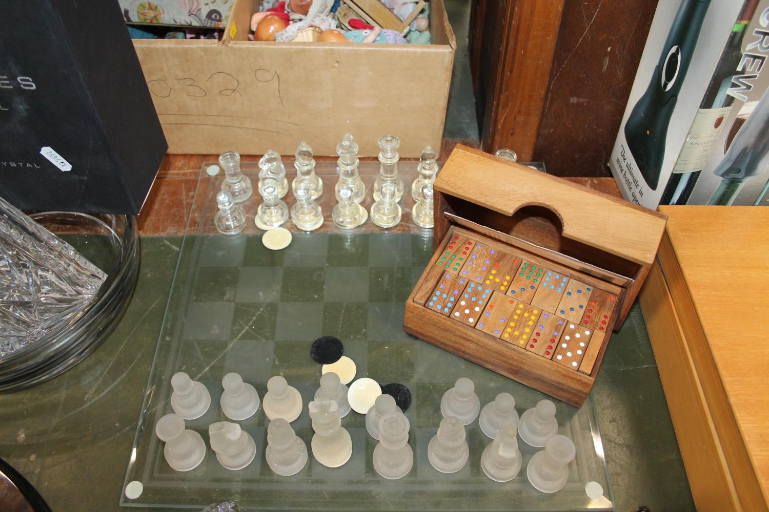 Glass chess set with board and a boxed set of dominoes.