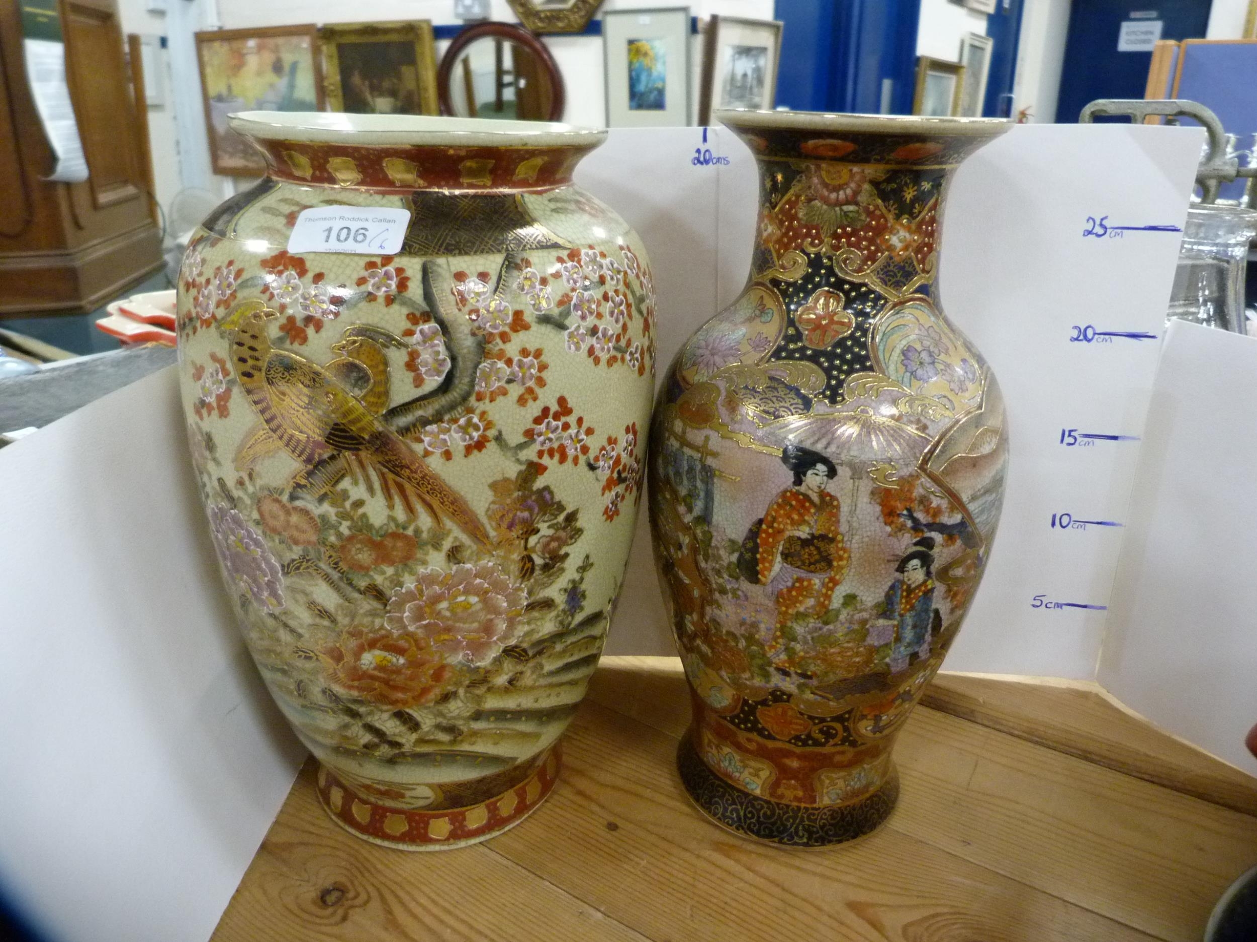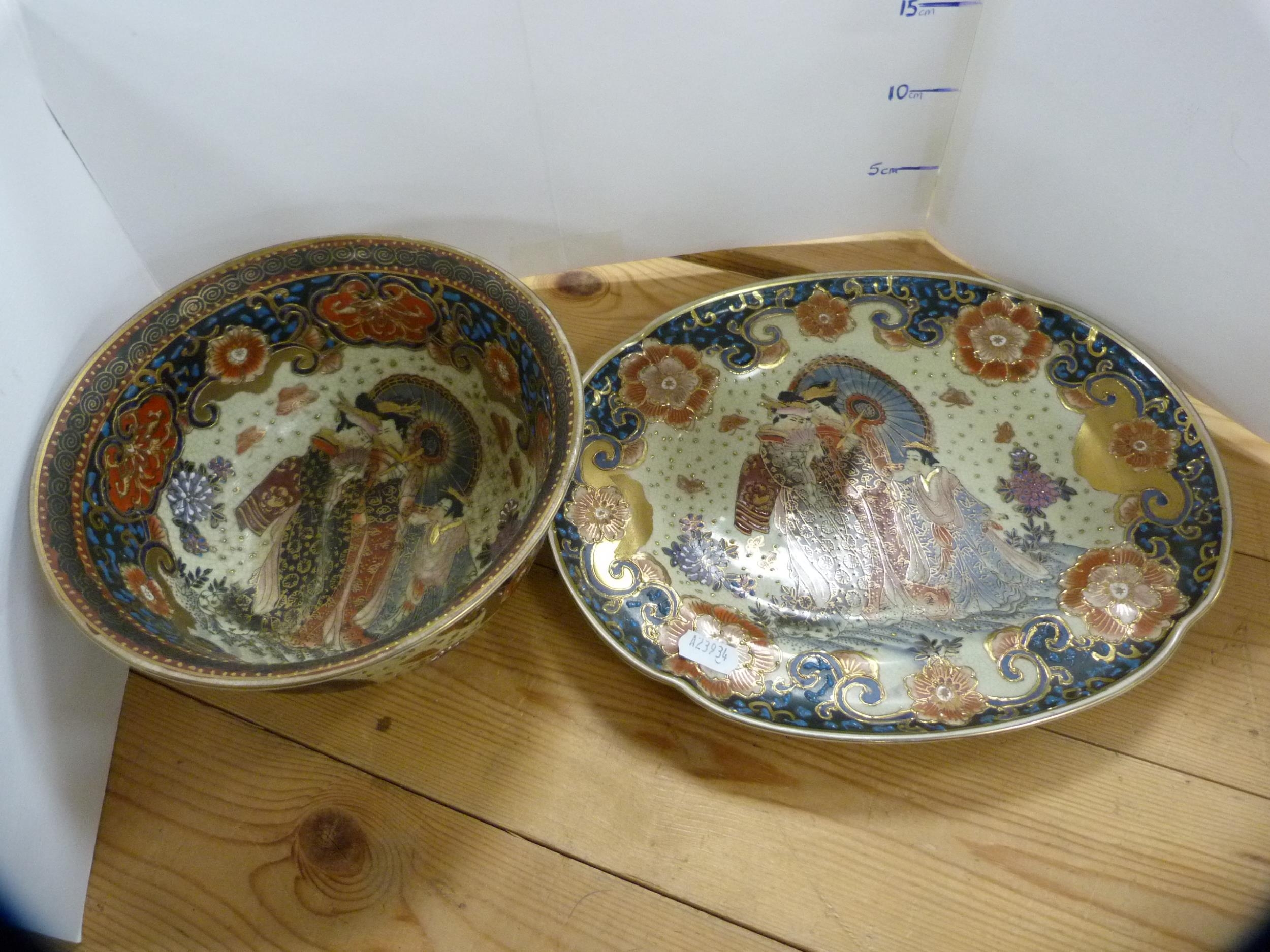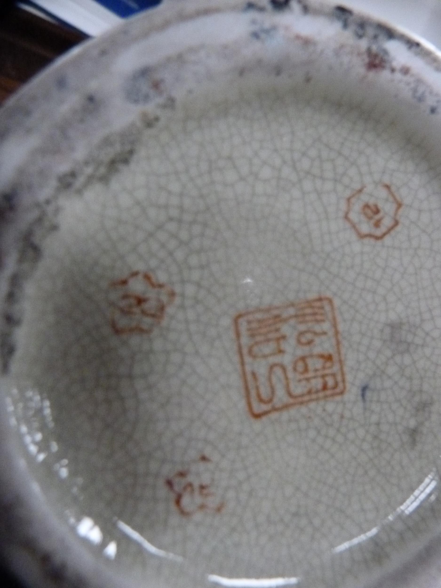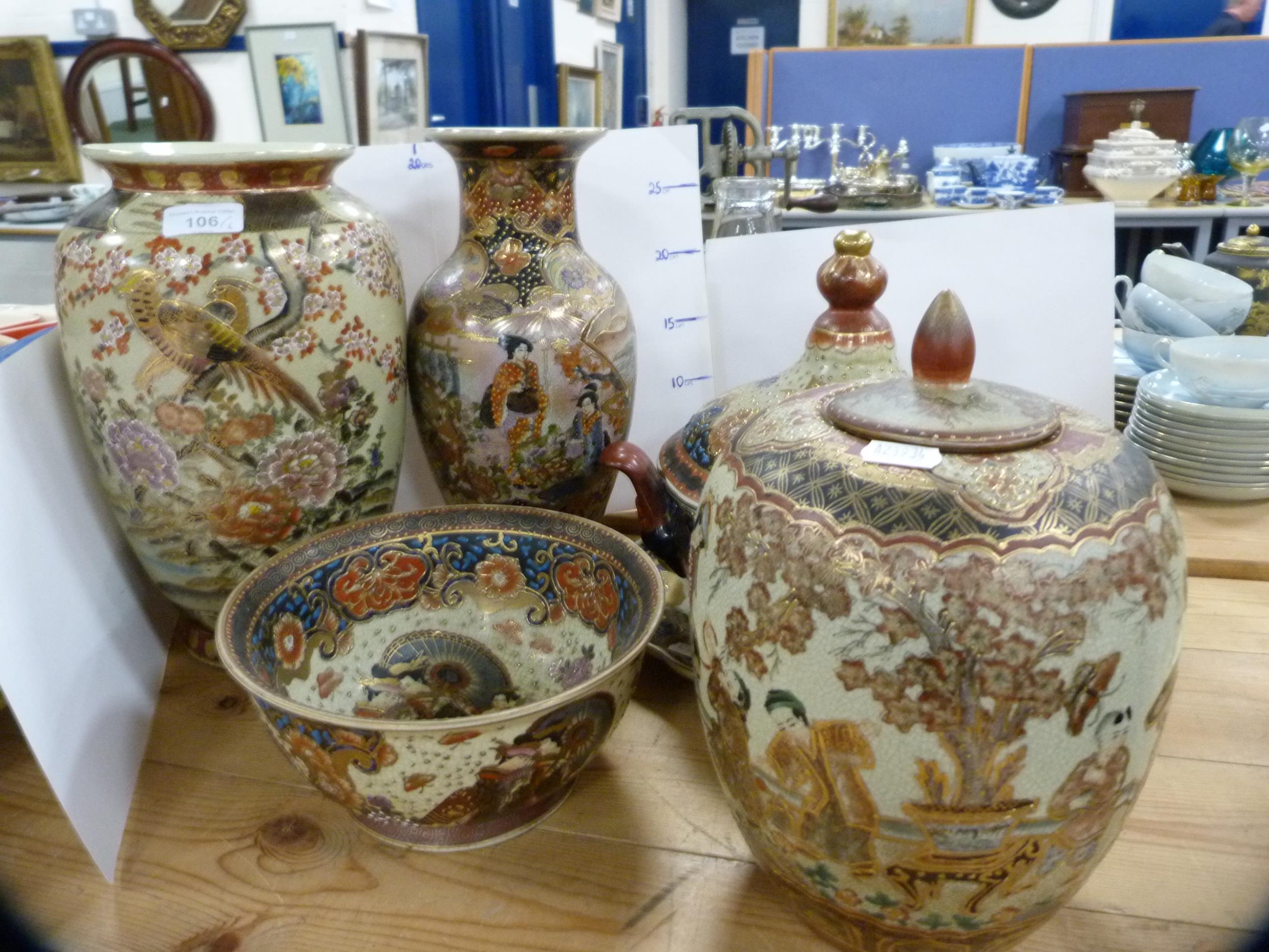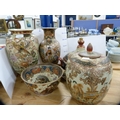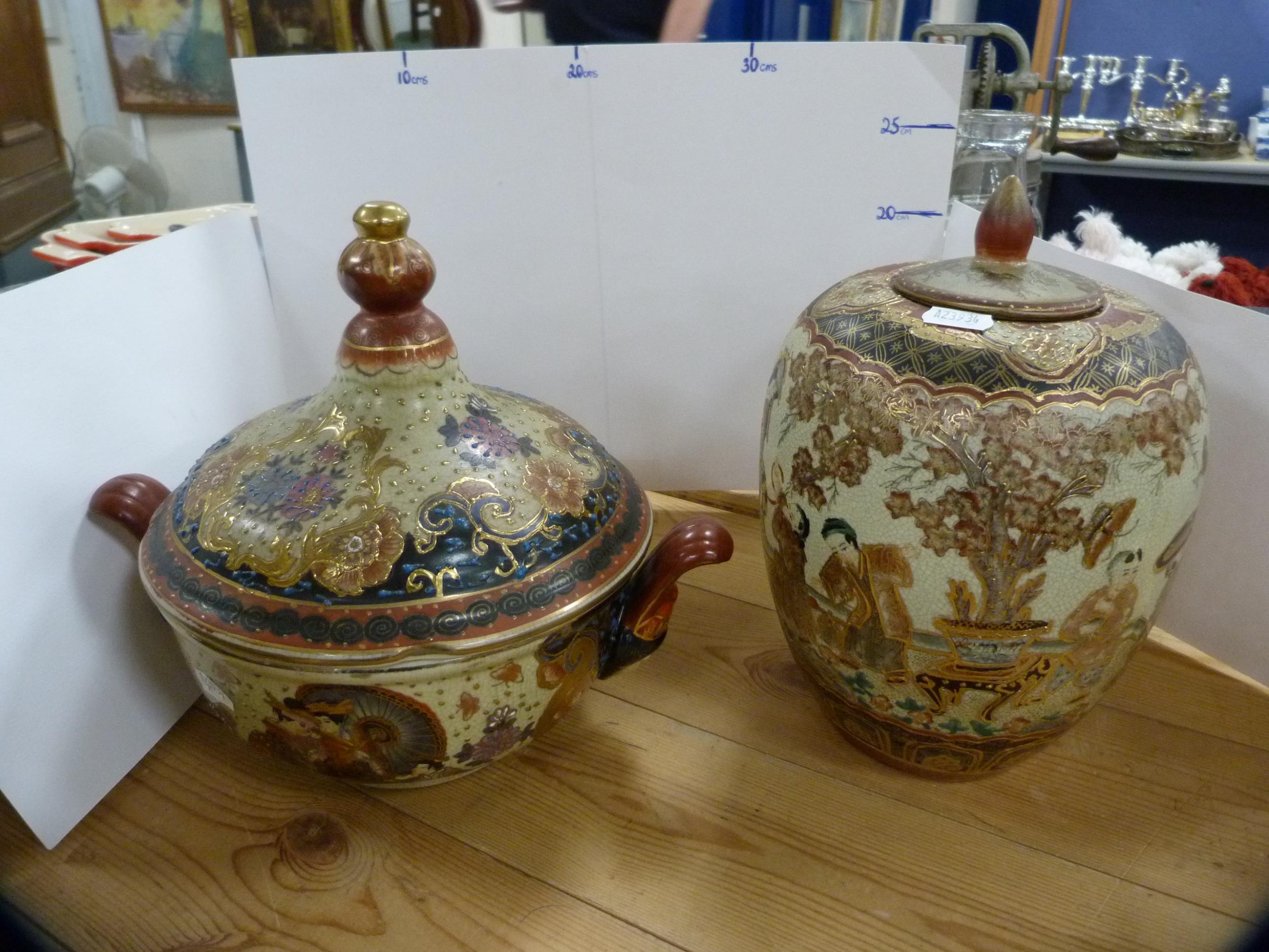 Reproduction oriental ceramic vases, bowl, oviform vase and cover and a tureen on stand. (6)