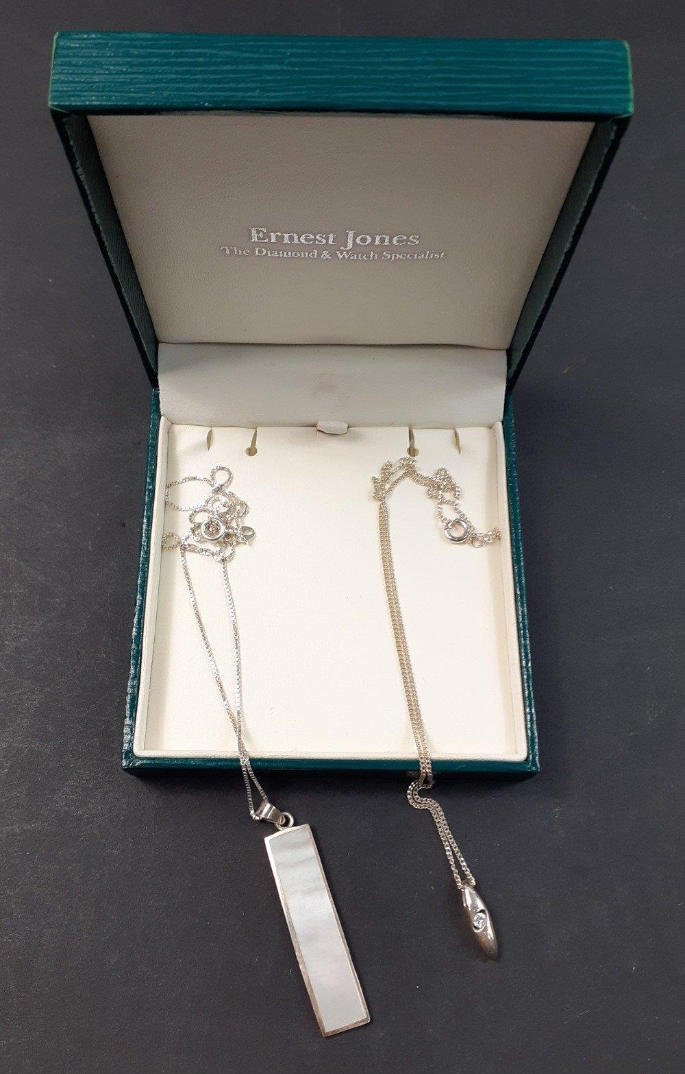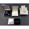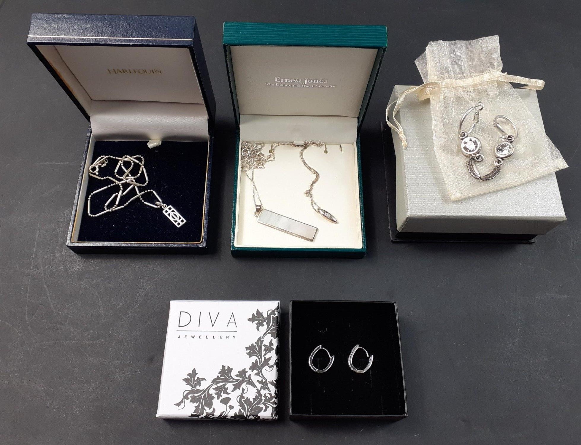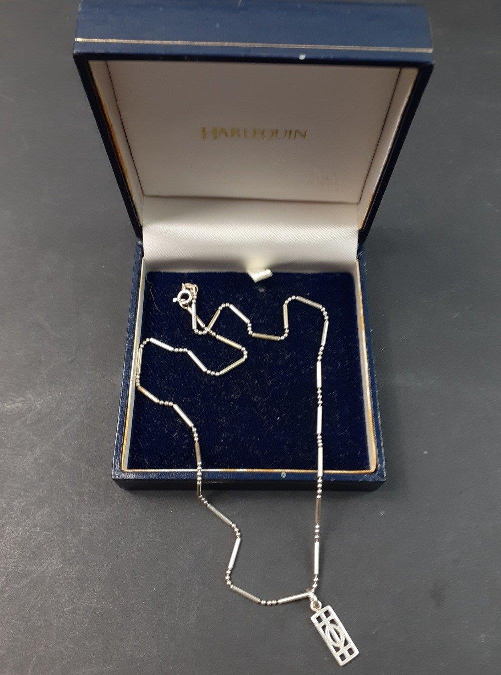 A super little collection of silver and white metal jewellery items to include a 925 marked ingot on a 925 Italy chain (5.6g), a 925 marked chain with an unmarked pendant (2.55g), a 925 marked Rennie Mackintosh pendant and chain (5g) and two sets of unmarked earrings.