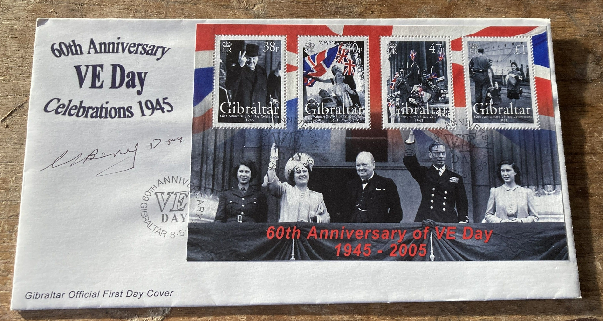 WW2 Xcraft Midget Sub ace signed cover. Navy 50th Ann VE Day Celebrations 1945 cover picturing Churchill with the Royal Family with full Gibraltar WW2 stamp set signed Conrad L Berey DSM 08.5.05 Navy WW2 FDC. Rare numbered 2 of 5 issued. Single Vendor collection. Good condition. We combine postage on multiple winning lots and can ship worldwide. UK postage from £5.99, EU from £7.99, Rest of World from £9.99.
