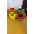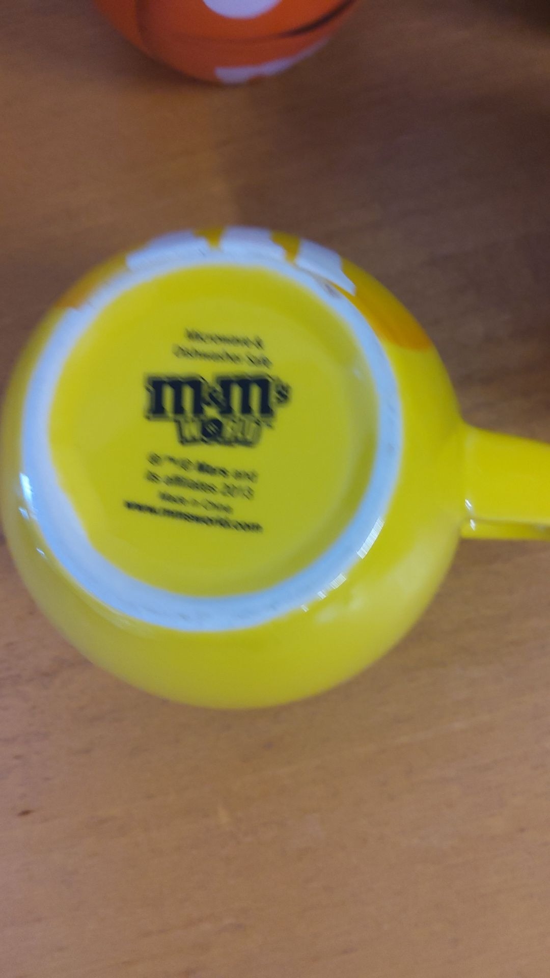 Set of four colorful M&M's World ceramic mugs featuring character faces
