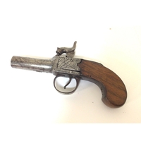A Replica flintlock pocket pistol with a detachable steel canon barrel brass action and mahogany grip. Non Firing ornament. 20cm long.
