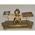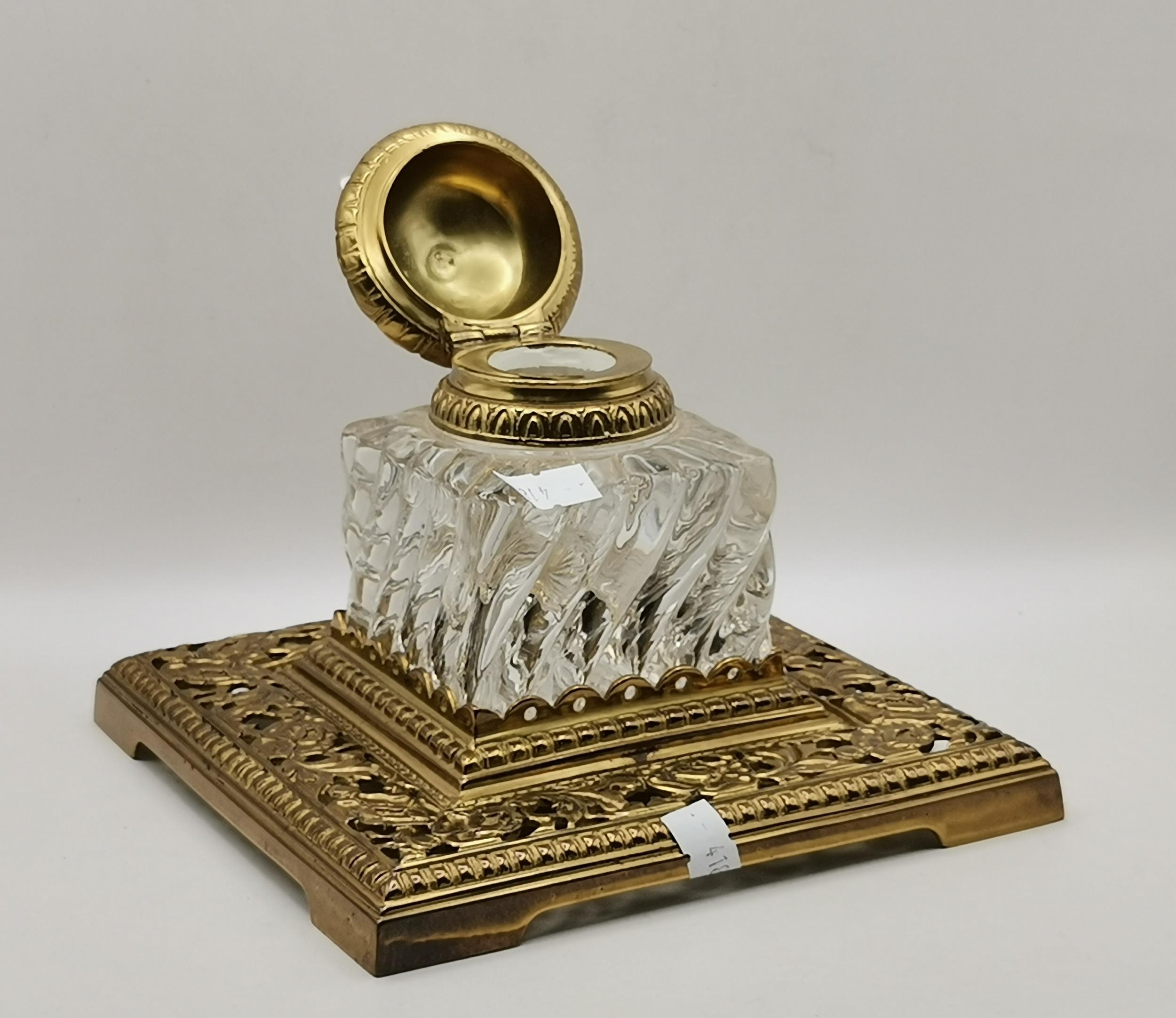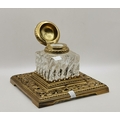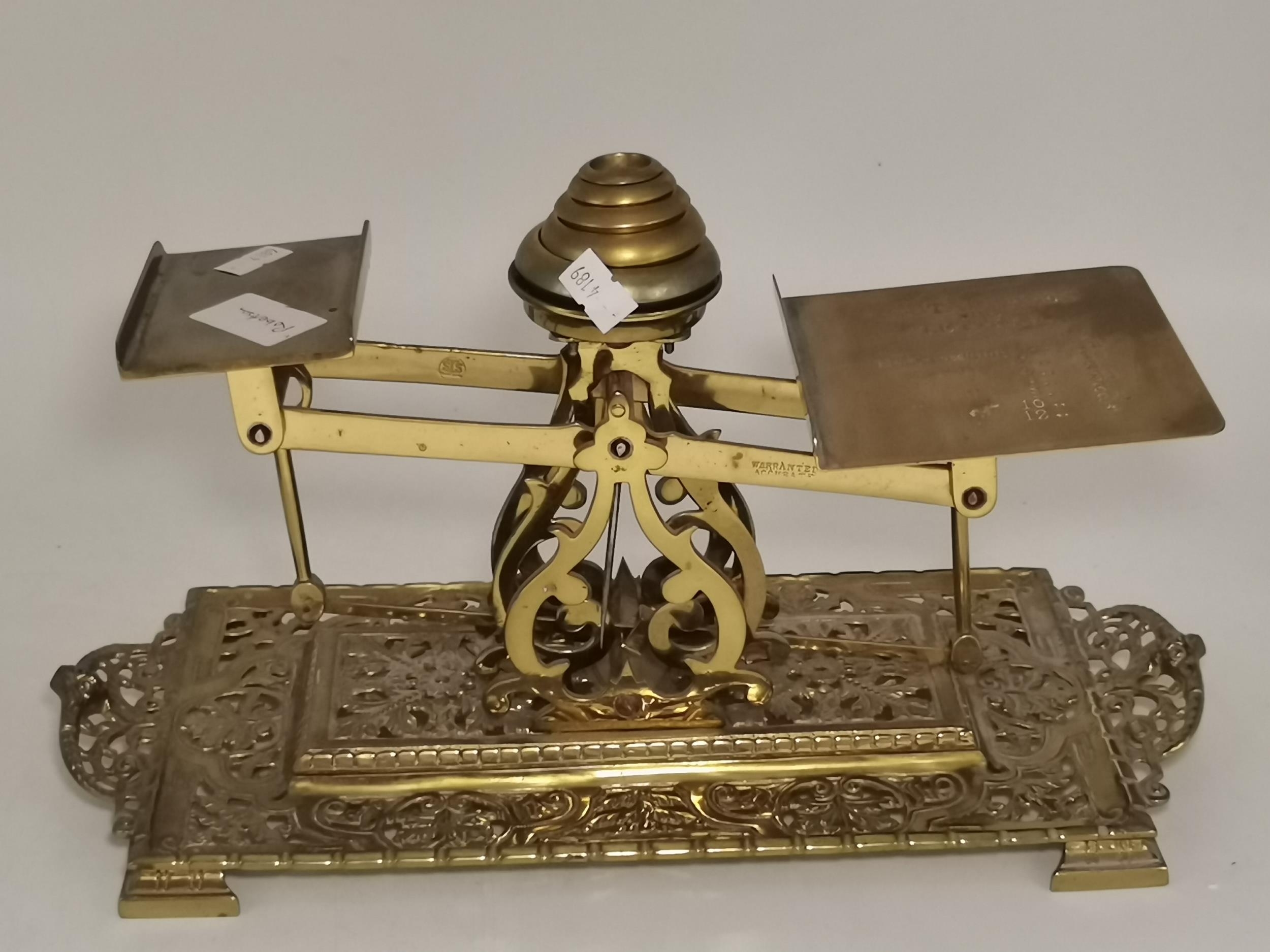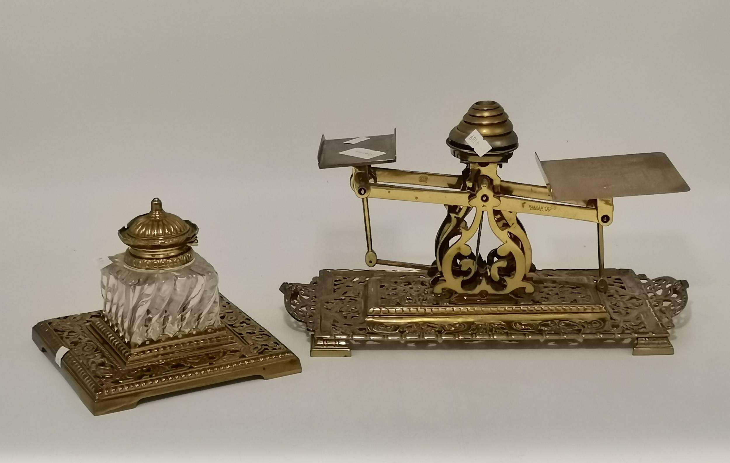A Set of Brass Postal Scales with weights ranging from 1/2 oz to 8oz struck with various marks throughout including T&Co plus Brass and cut glass Inkwell and tray