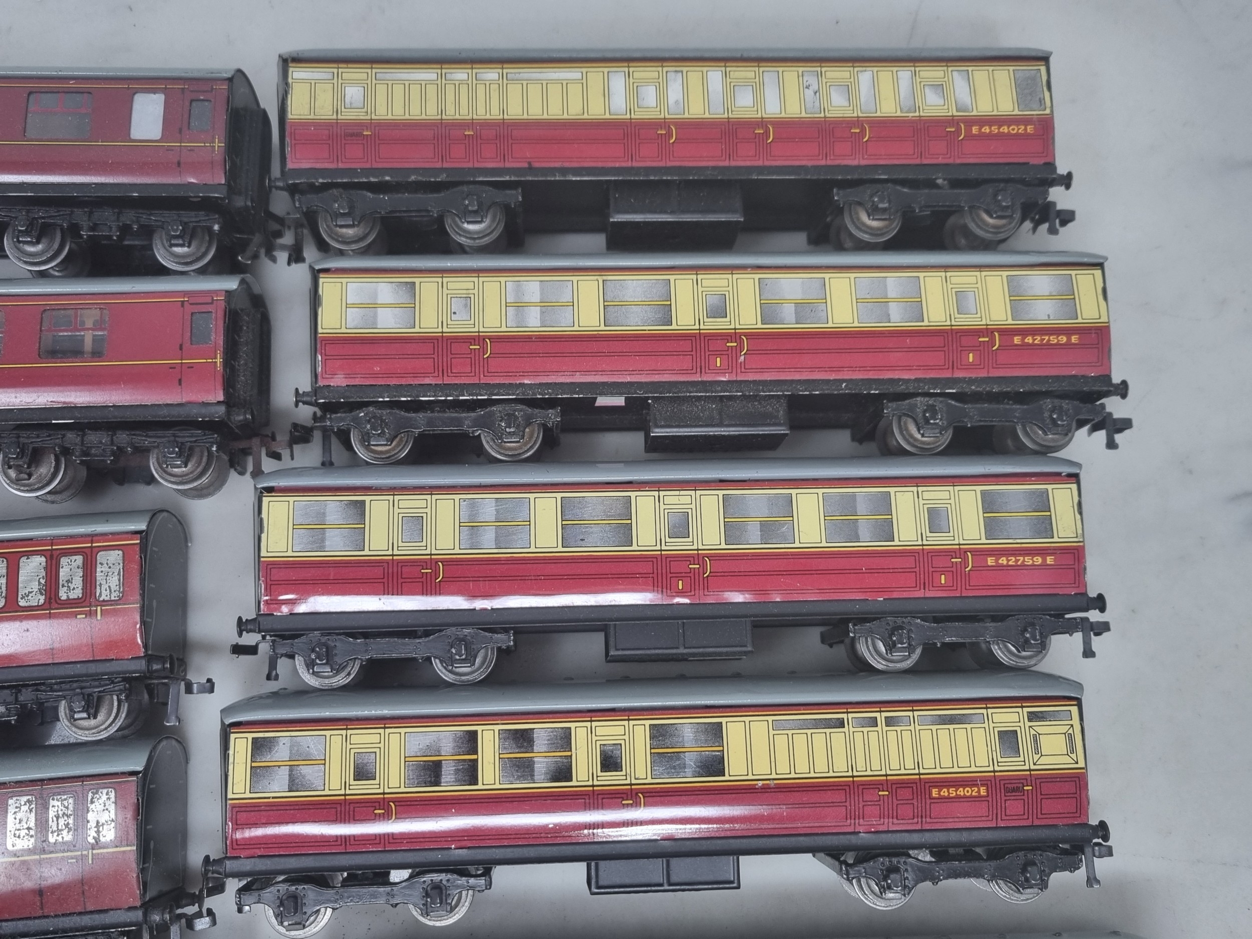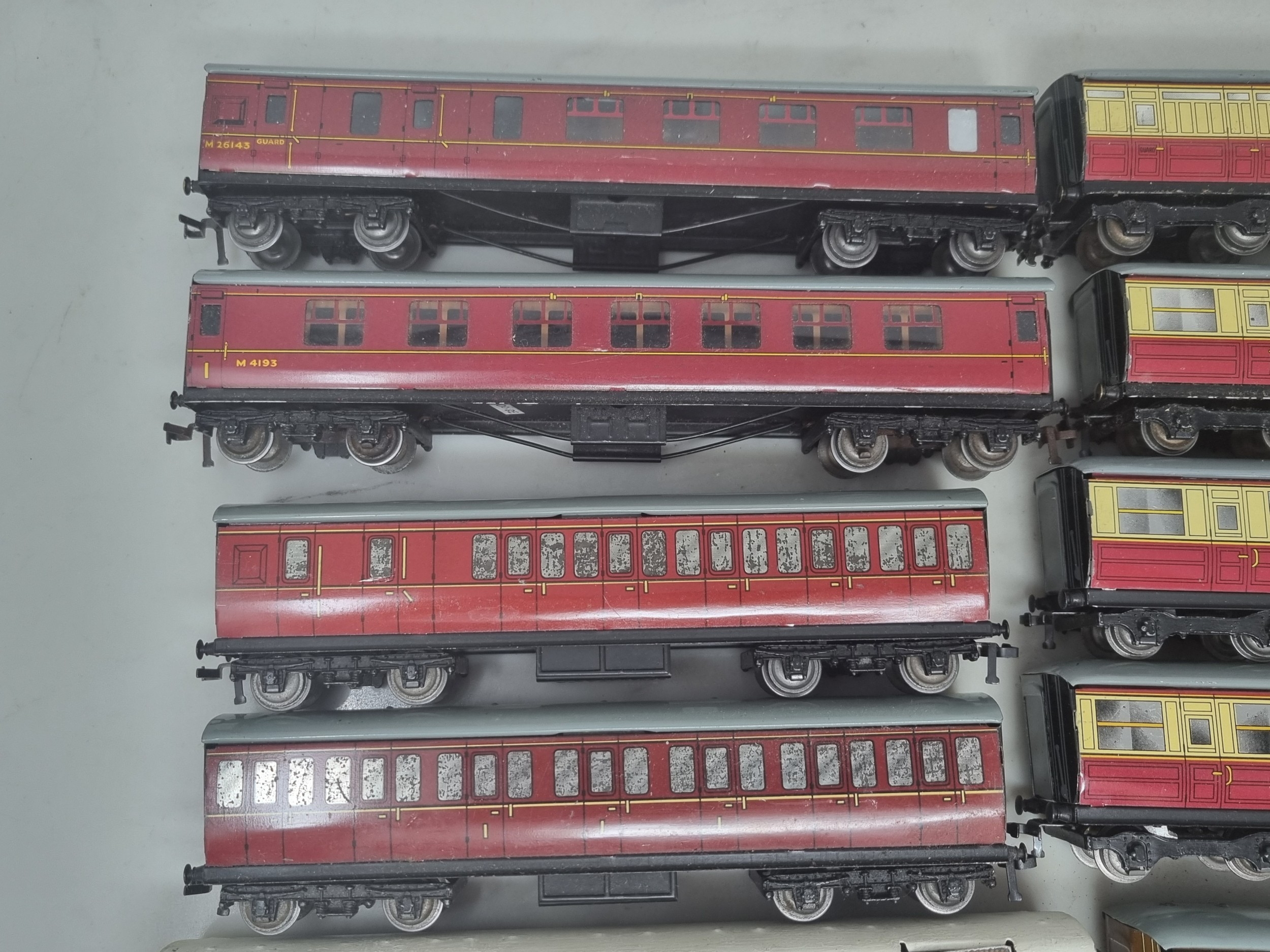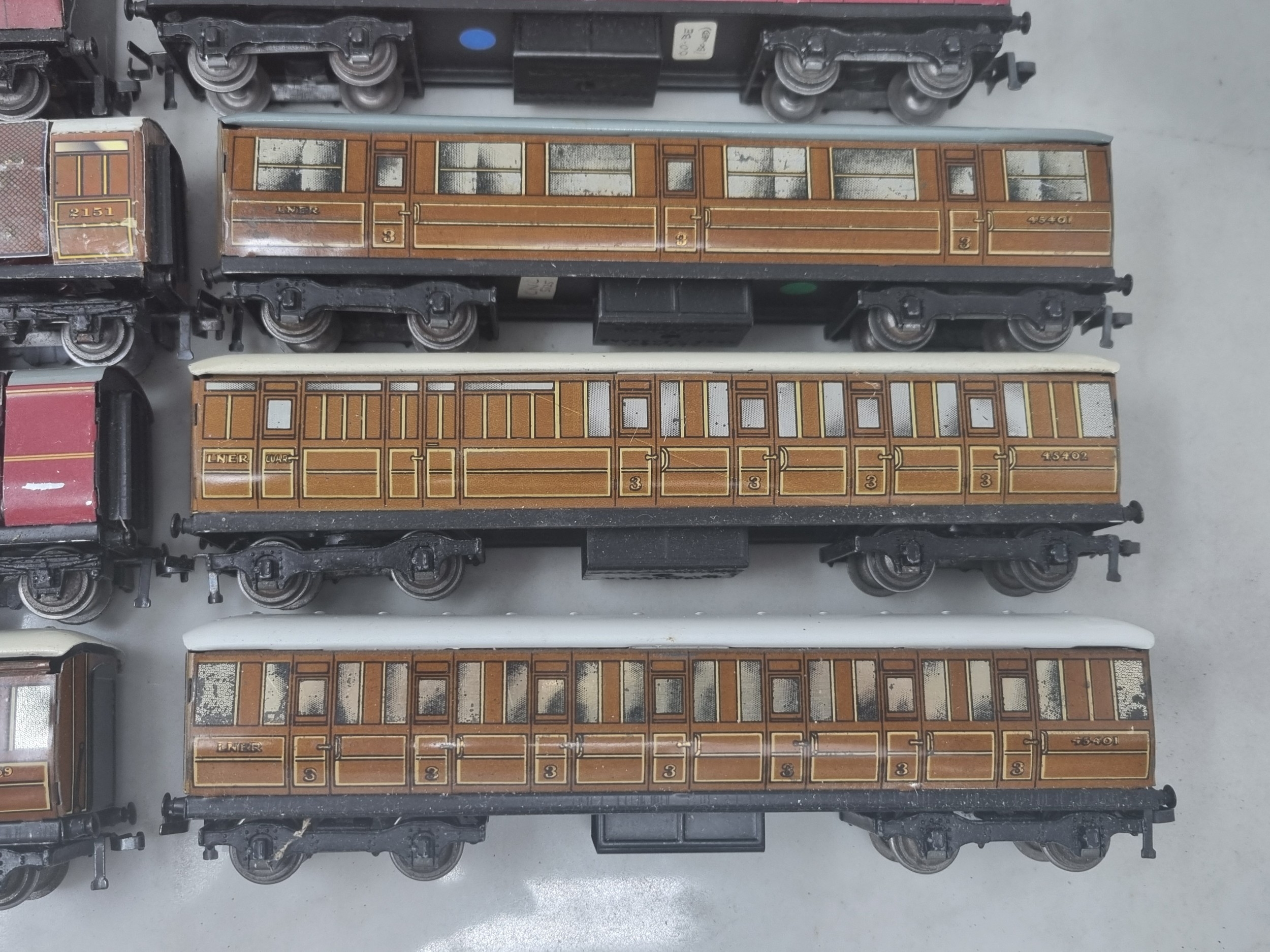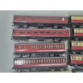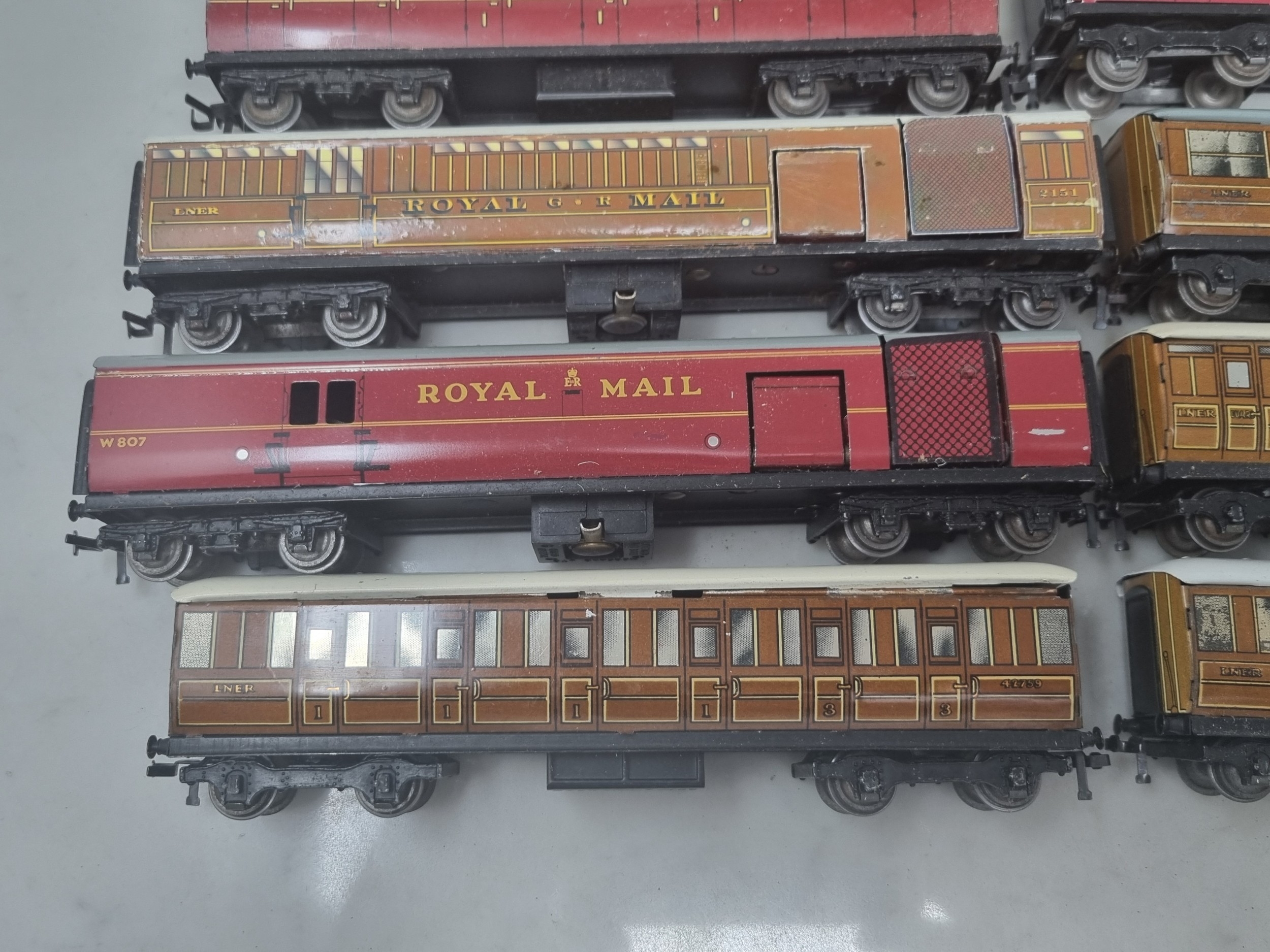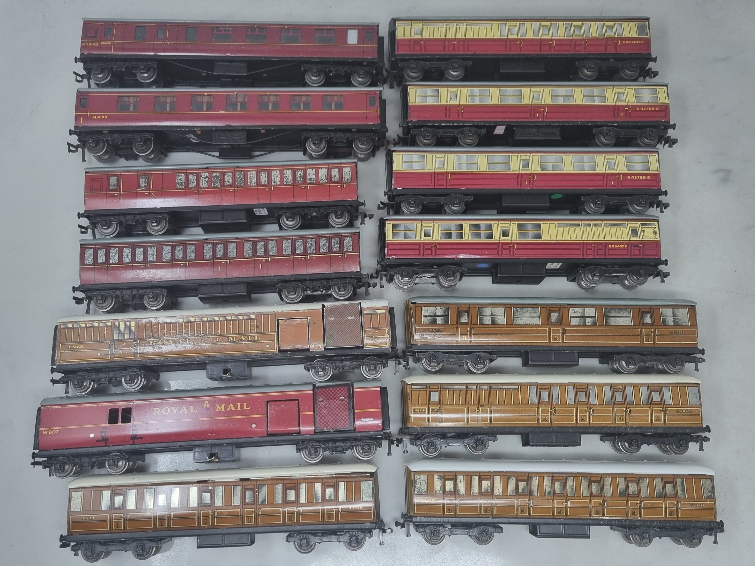 14x unboxed Hornby Dublo 3-rail Coaches including D1 LNER, D11 ER, Never Was LNER Royal Mail T.P.O. Van, Royal Mail T.P.O. Van, etc., generally G-Ex