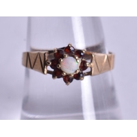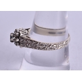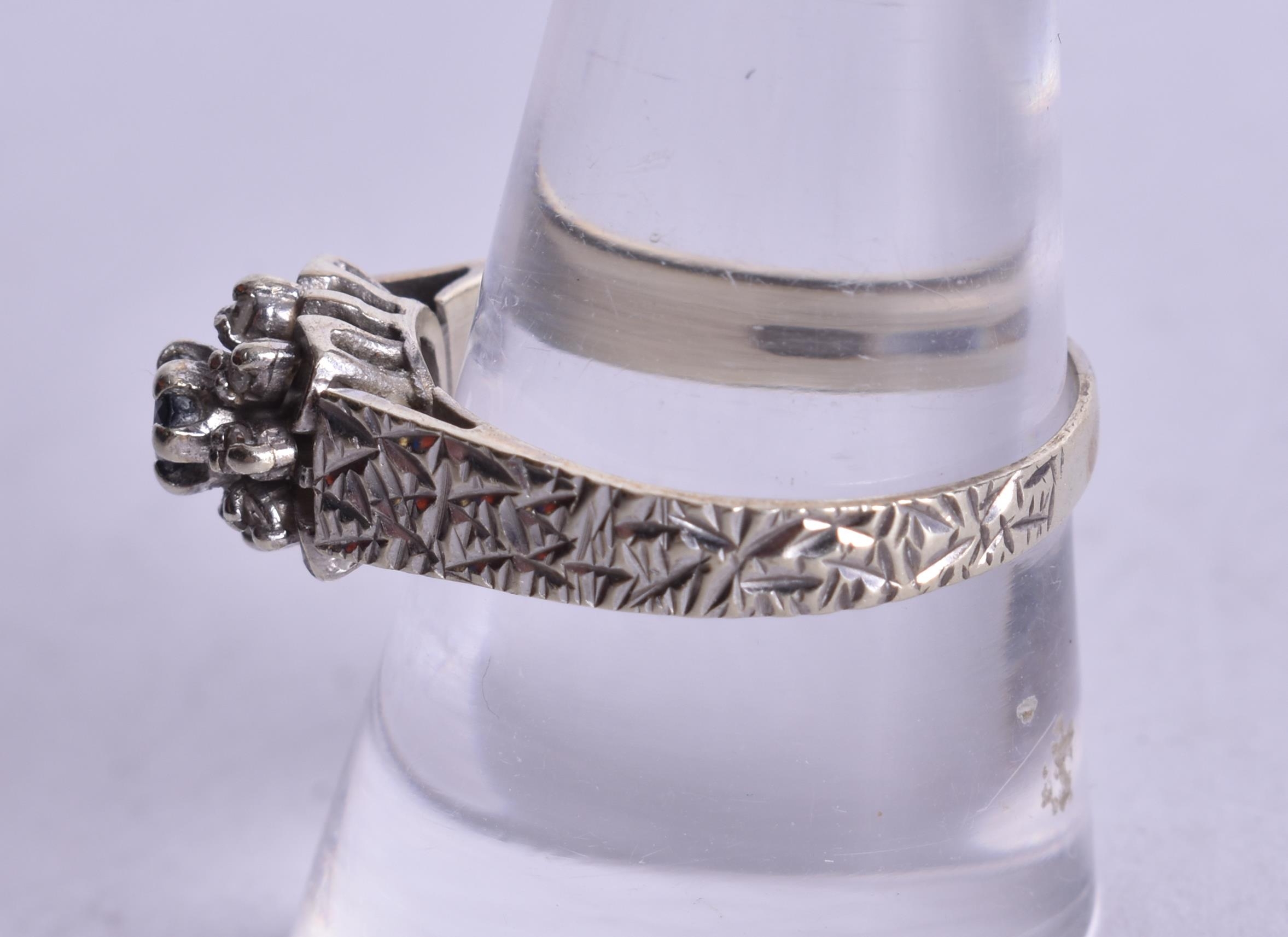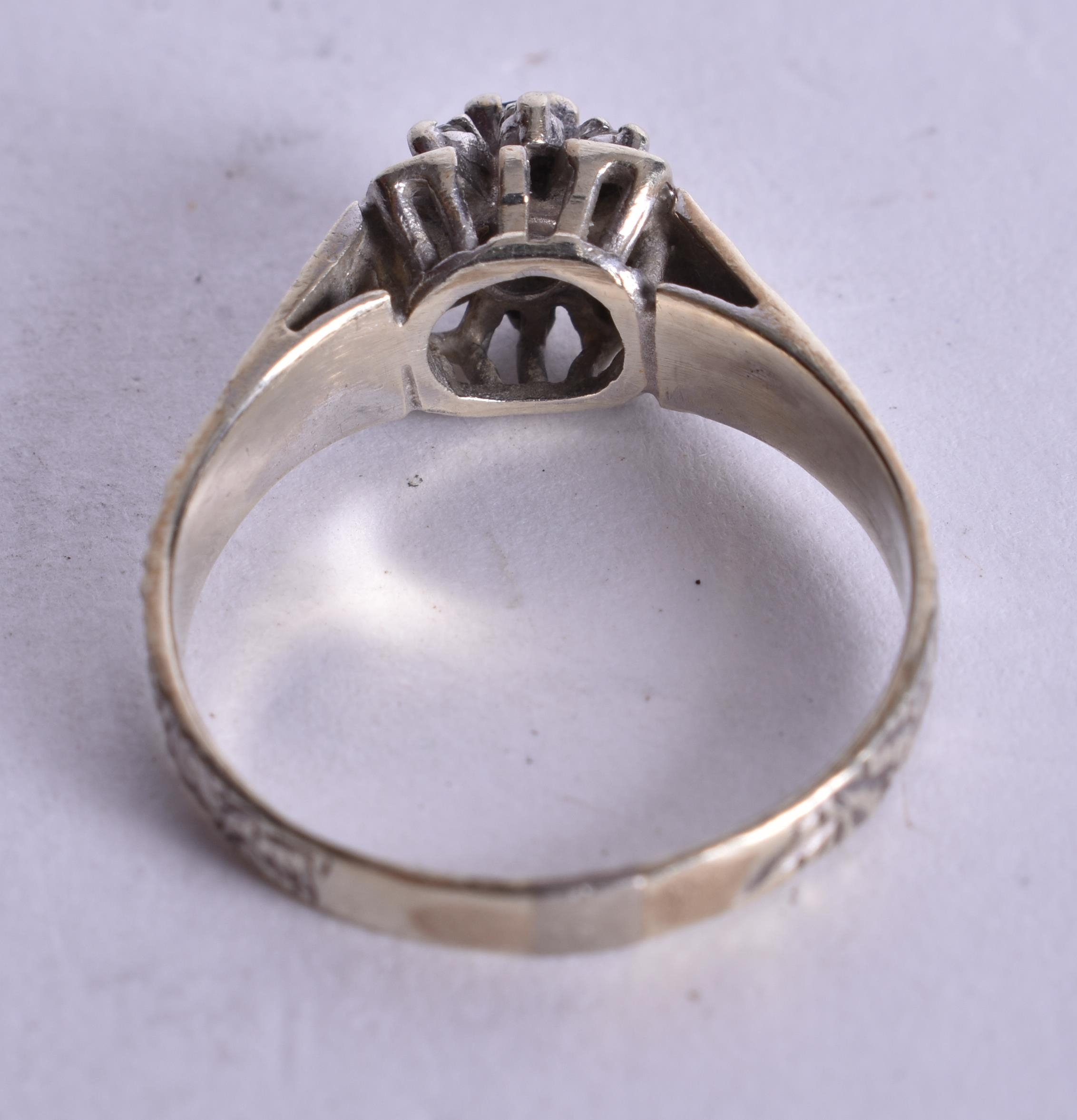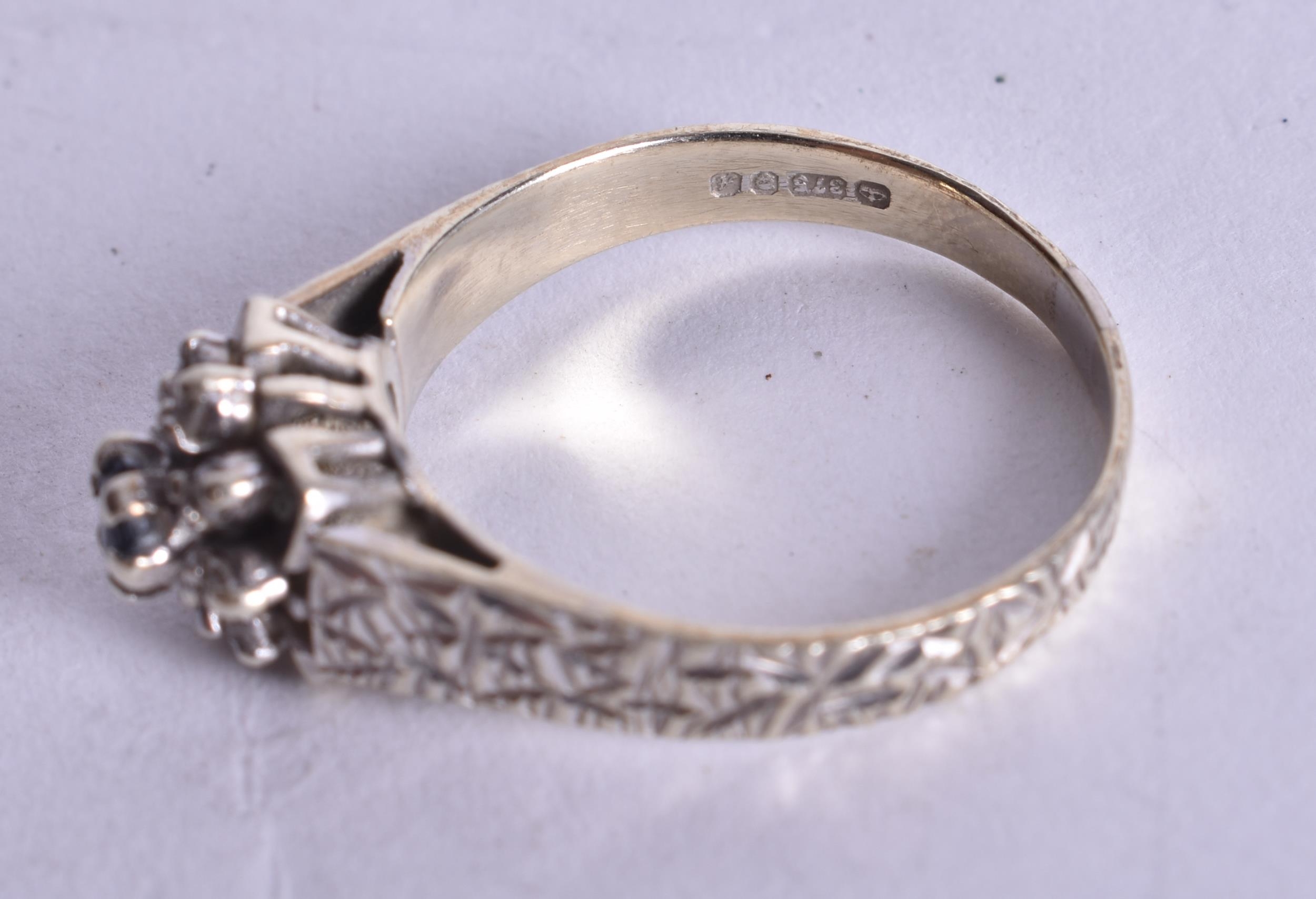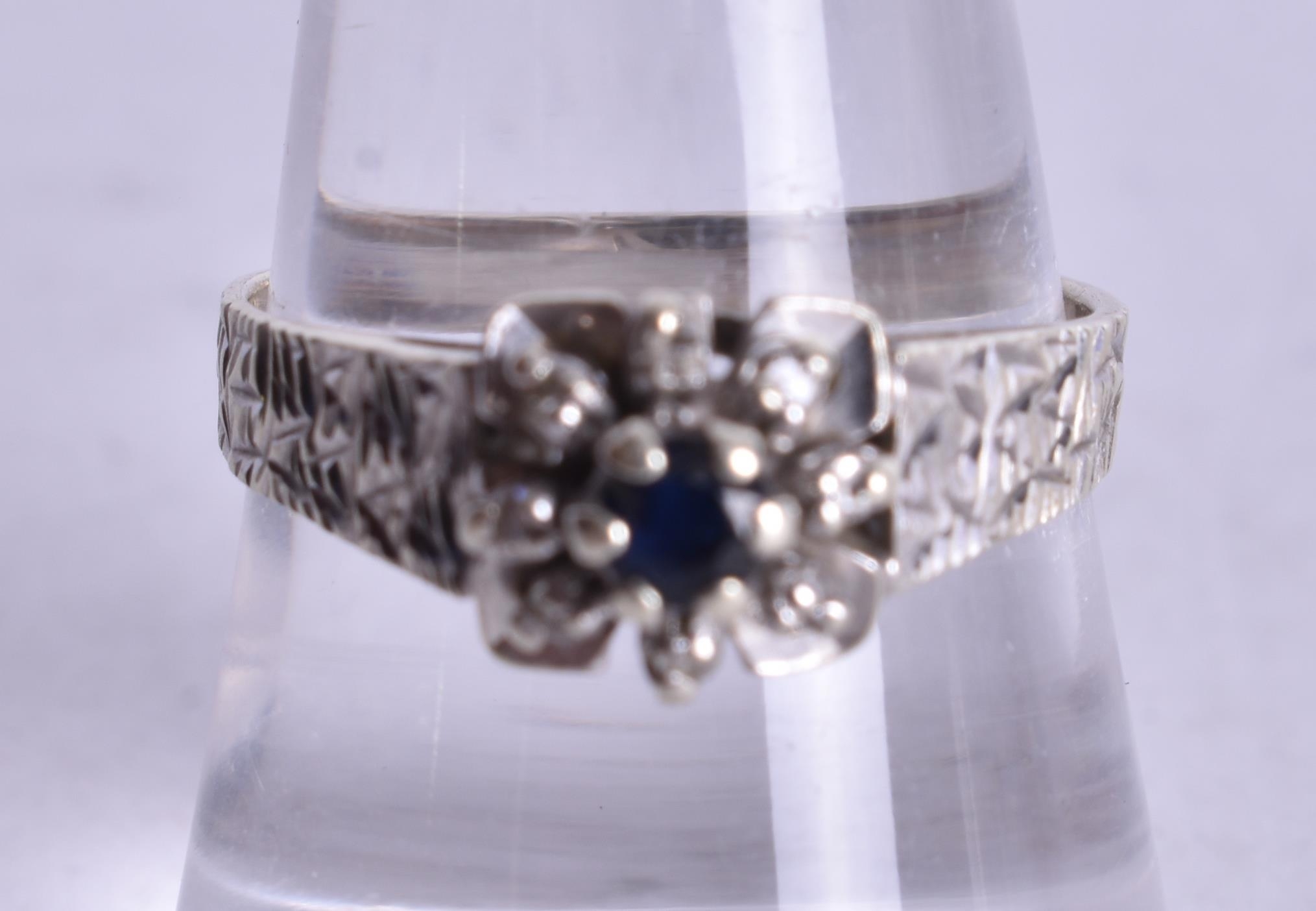 9ct white gold diamond sapphire cluster ring (3.4g). P.