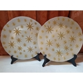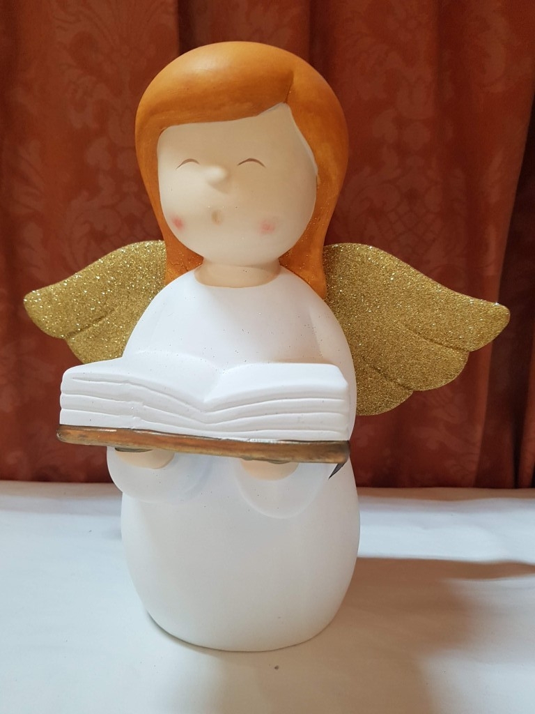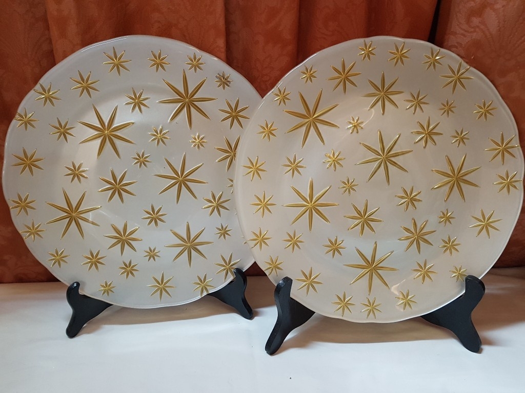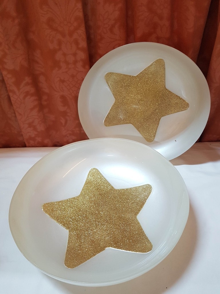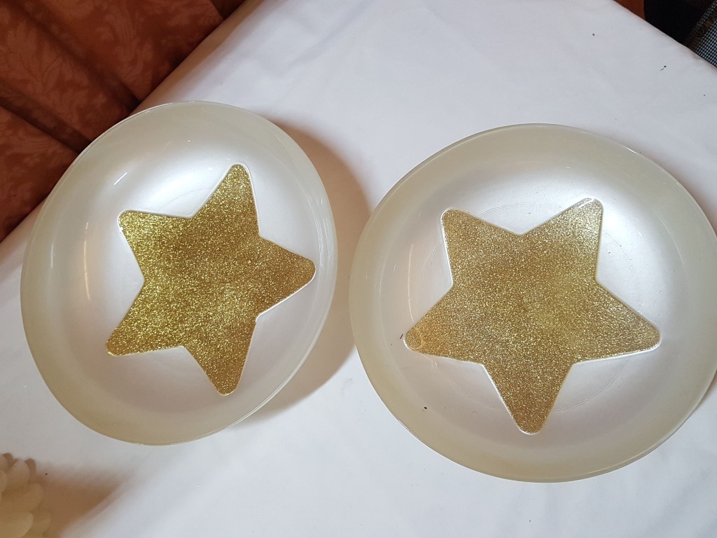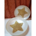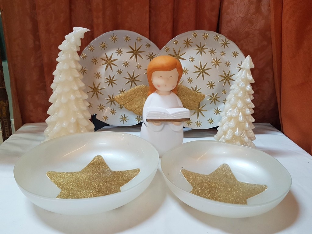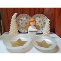 White and Gold Festive Nostalgia, Collection of Stylish Christmas Decor; 2x 'Star' Bowls (Approx. Ø: 26.5cm/ Ø: 30.5cm), 2x 'Stars' Serving Plates (Approx. Ø: 31.5cm Each), 1x 'Singing Angel' Ceramic Figurine (Approx. H: 28cm) and 2x White Christmas Tree Candles (Approx. H:.... H:....). (7)